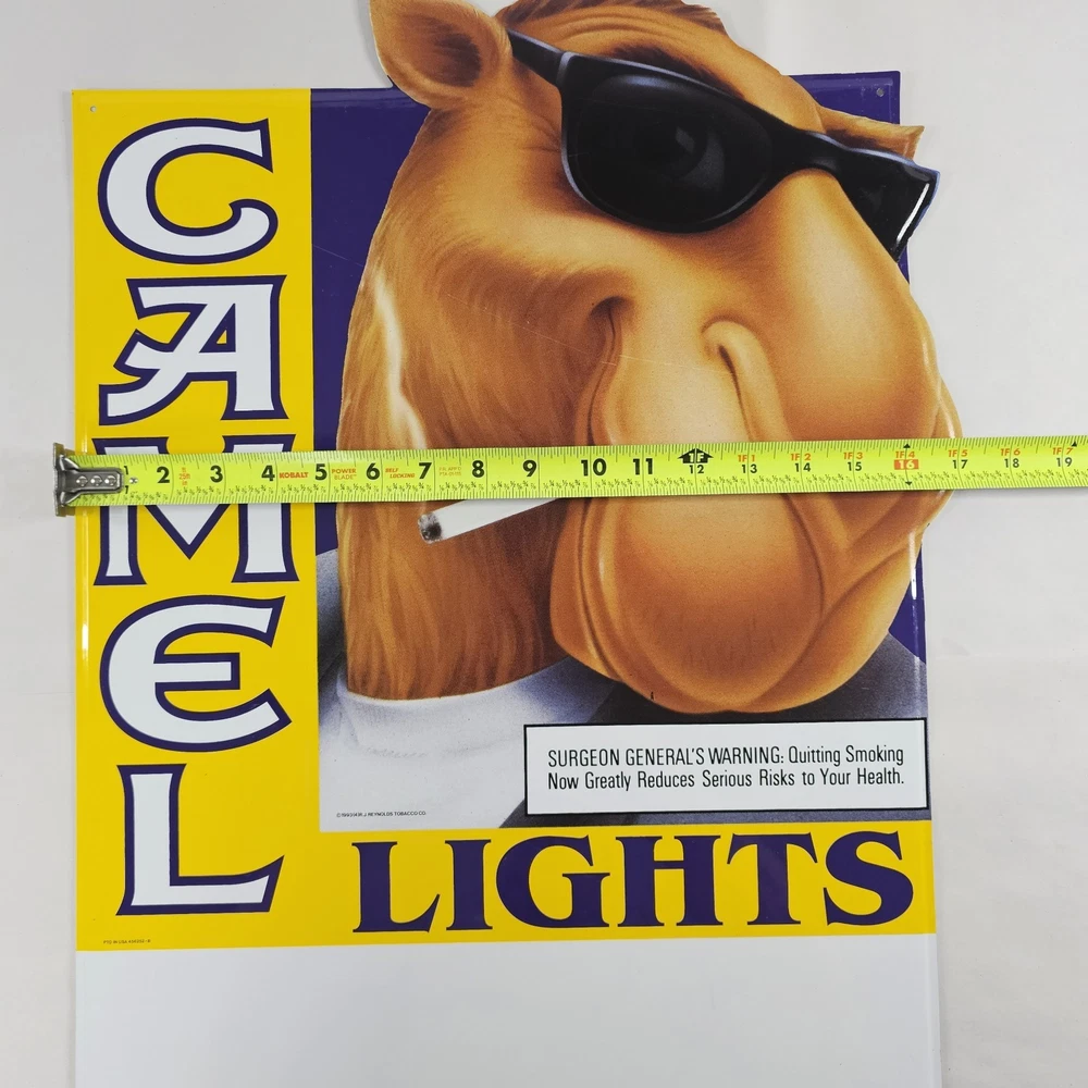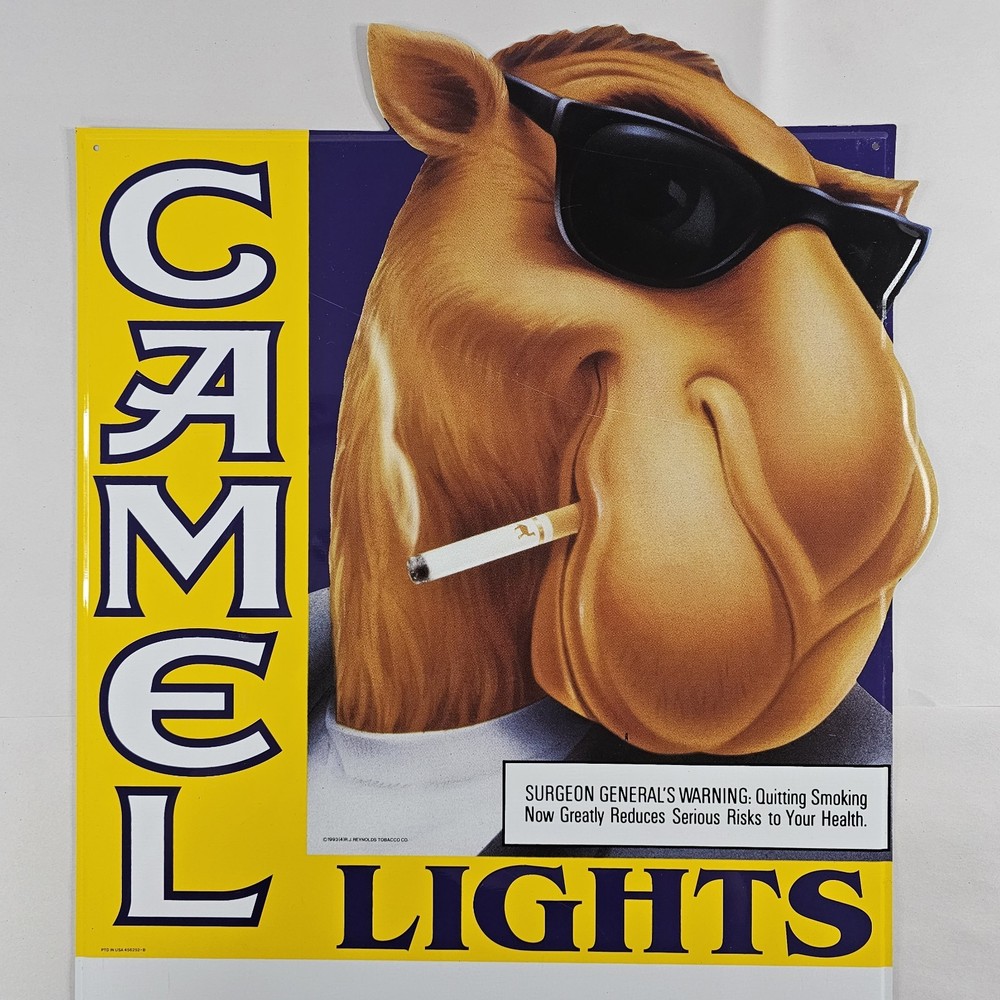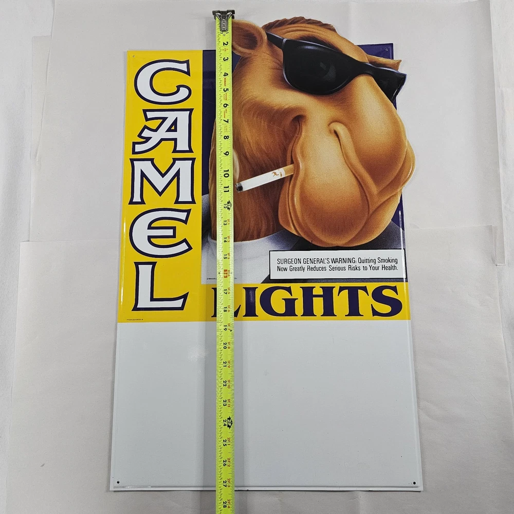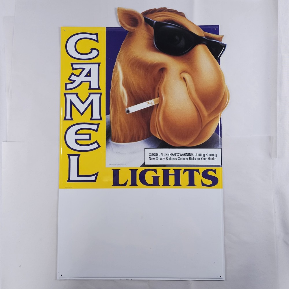 Vintage Joe Camel R.J. Reynolds 1993 Camel Lights Metal Sign 27" x 17" NOS. May Show Some Very Minor Signs Of Storage Wear, But Is Unused. Because Of The Size, I Will Only Be Able To Ship Using UPS Ground, Or FedEx Ground/Home To The Lower 48 States, Unless You Would Like To Pay The Additional Shipping Cost. This Was Given To Me Along With A Bunch Of Other Camel/RJ Reynolds Items, From A Family Friend Who Was A Rep For Them For Many Years In The Early 1980s Through The Early 2000s. I Have Many Other Camel/RJ Reynolds Items Listed, And Will Be Listing Many More If You're Interested. Please Zoom In And Check All Pictures Closely For A More Detailed Visual Description Of Condition And Measurements. Ships Out Free Within One Business Day.