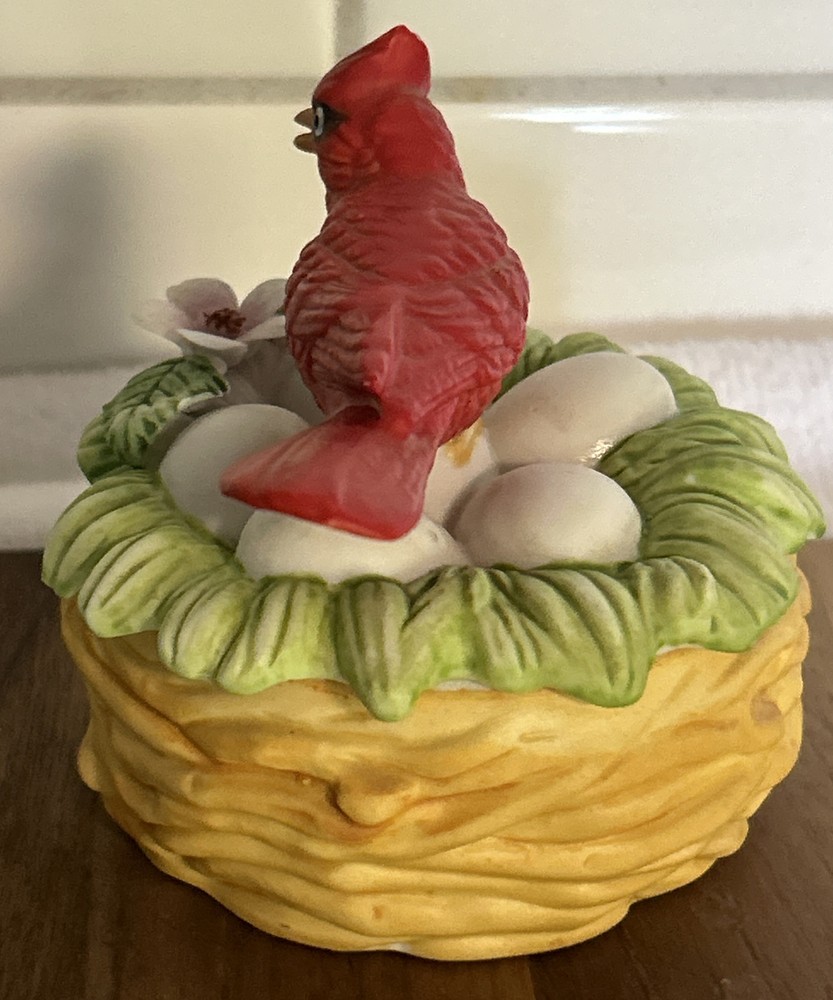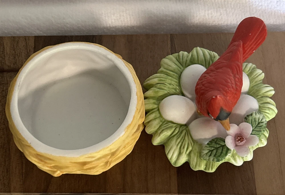 This vintage Lefton porcelain trinket box features a red cardinal bird nesting on eggs, surrounded by a beautiful and colorful design. Made in Japan in the 1970's, this small round trinket box is perfect for storing earrings, rings or any other small items. This sweet trinket box measures 3" inches tall and 2.5" inches in length. The hand-painted 3D effect and matte finish make it a unique and original addition to any vintage collection of either trinket boxes or porcelain birds. This will make a wonderful anytime gift for anyone who loves vintage items. Vintage Cardinal Bird on Nest Round Porcelain Trinket Box ~ Lefton (c) 1970's is in great vintage preowned condition, however it does show some tiny paint loss in a couple of places. However, there are NO chips, cracks or repairs. Please review all pictures for proper assessment of its vintage preowned condition.