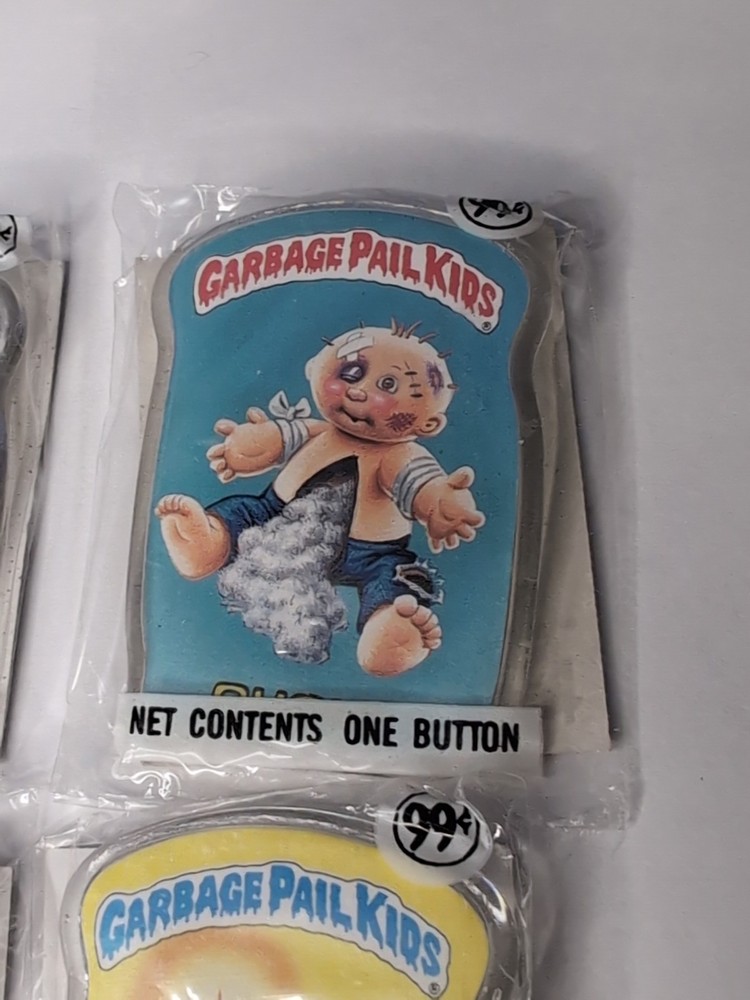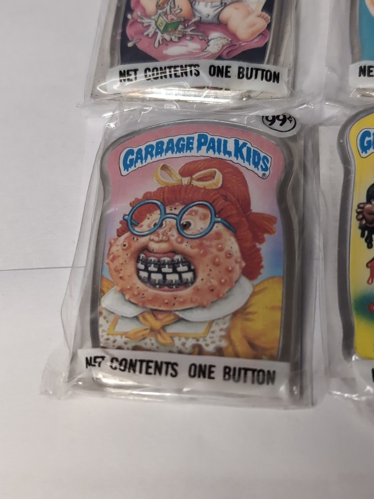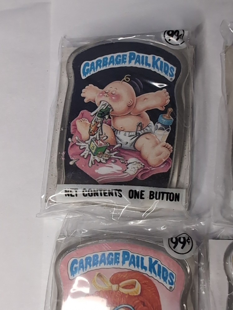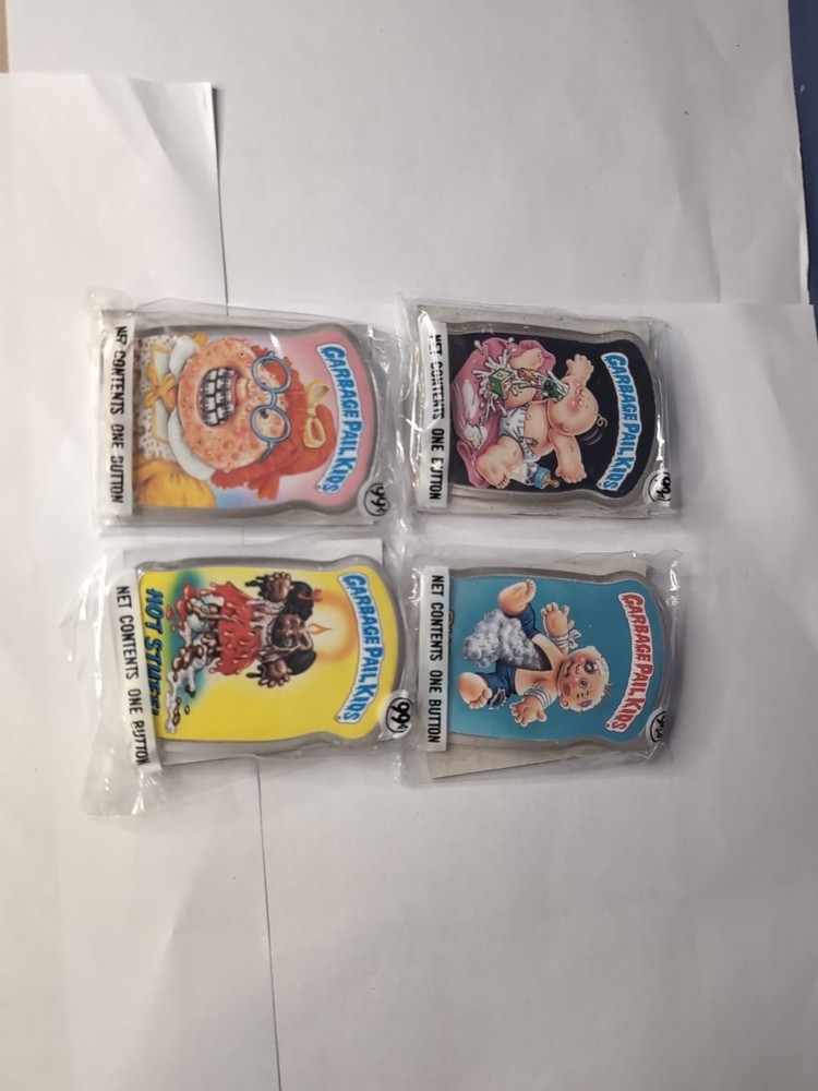 This product is a vintage lot of 4 Garbage Pail Kids pinback buttons from 1986, produced by Topps. These original sealed pins feature multicolor designs and are part of the popular Garbage Pail Kids franchise. these collectible buttons are perfect for fans of comics and non-sport trading cards. The lot includes 4 buttons, making them a great addition to any vintage collection.