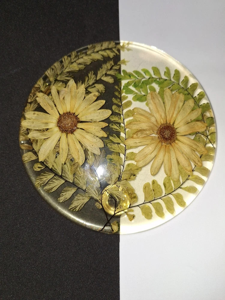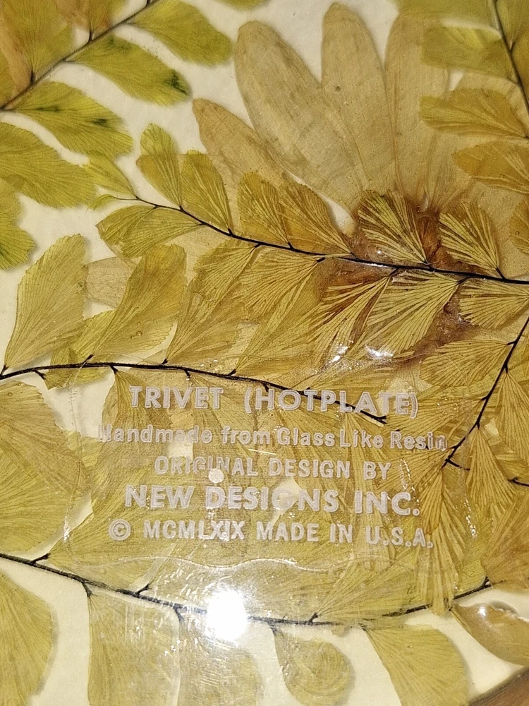 Enhance your kitchen decor with a touch of retro charm with this vintage Lucite (?) flower trivet. The vibrant daisies and the round shape make it an attractive addition to any table setting. Measuring 5.5 inches in diameter, it's a small yet striking piece that's perfect for all occasions.Crafted in 1969 by New Designs Inc, this original, unboxed trivet embodies the style of the 1960s. It's handmade, hand wash only, and boasts a timeless flower theme. This American-made treasure is a testament to the craftsmanship of the era and a delightful find for collectors and retro enthusiasts alike.