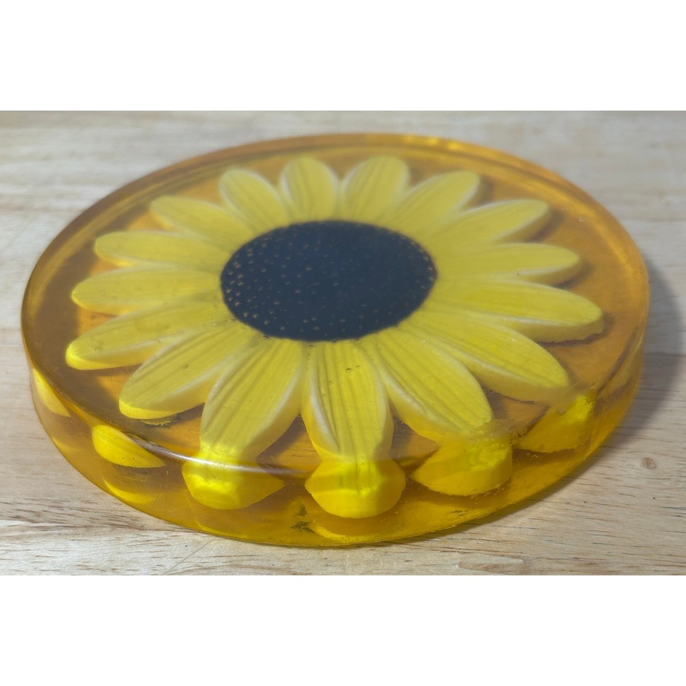 Brighten your kitchen or dining space with this vintage sunflower trivet, measuring 6.25″ in diameter and 0.5″ tall. Crafted from durable lucite/resin, it showcases a bold sunflower motif encapsulated within amber-toned acrylic—perfect for mid-century modern or farmhouse-style decor. The underside features three small cork pads to protect surfaces and keep it level. Condition: Pre‑owned in good vintage condition with light surface wear and minor edge scuffs. Ideal as a hot plate trivet, decorative accent, or retro wall hanging.