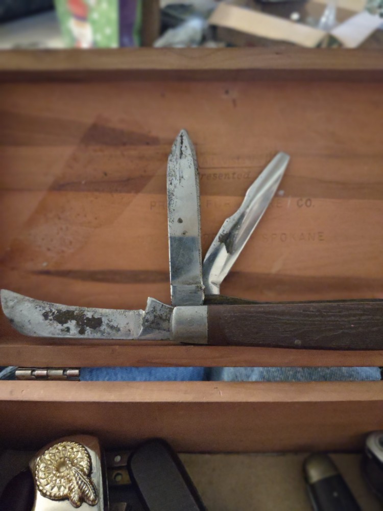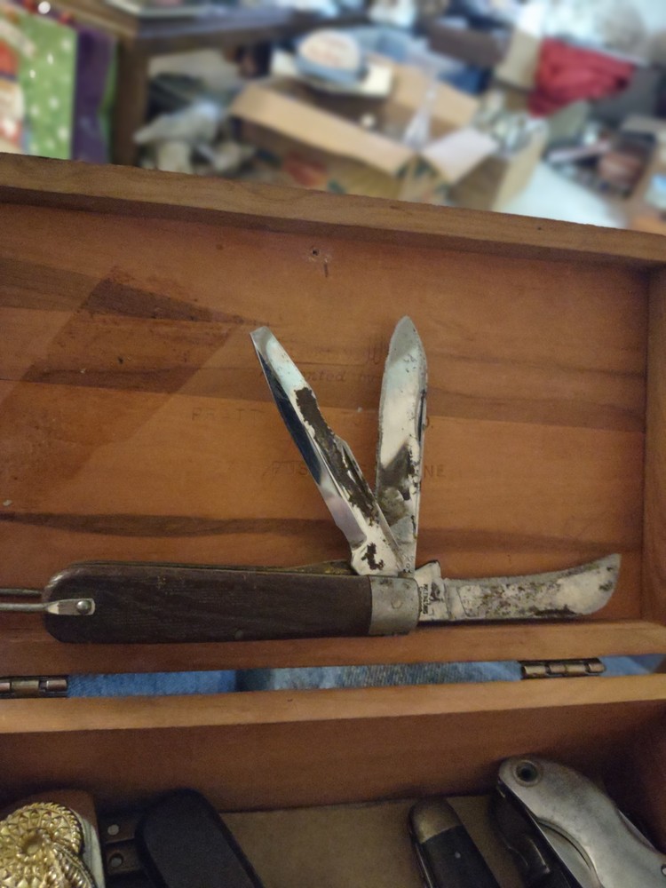 Vintage RARE M. KLEIN & SONS pocket knife featuring 3 stainless steel blades including a Hawkbill blade. This original pocketknife, designed for electricians, has a liner lock and a brown plastic or delrin handle. It also includes a screwdriver tool. A unique find for collectors of vintage folding knives. Some rust on the blades.