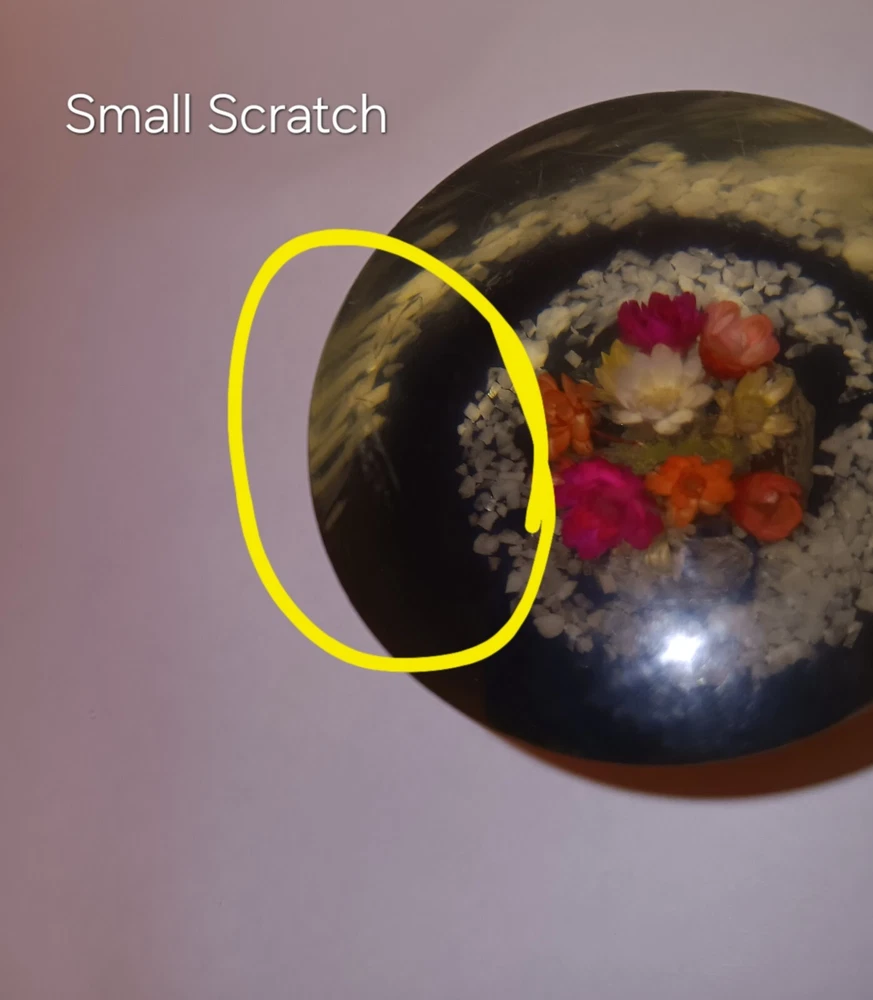 It's in good condition but has some wear on it. There is 1 small scratch on the top, and there are a couple of scratches on the side. It's made out of acrylic. It's 2.5 inches tall. I will pack it with care and will include tracking.