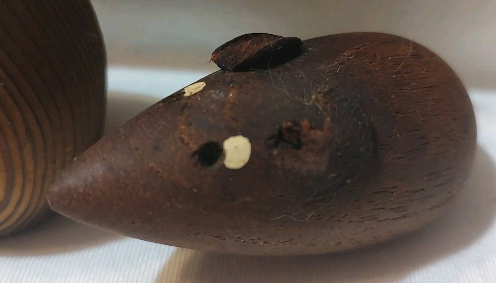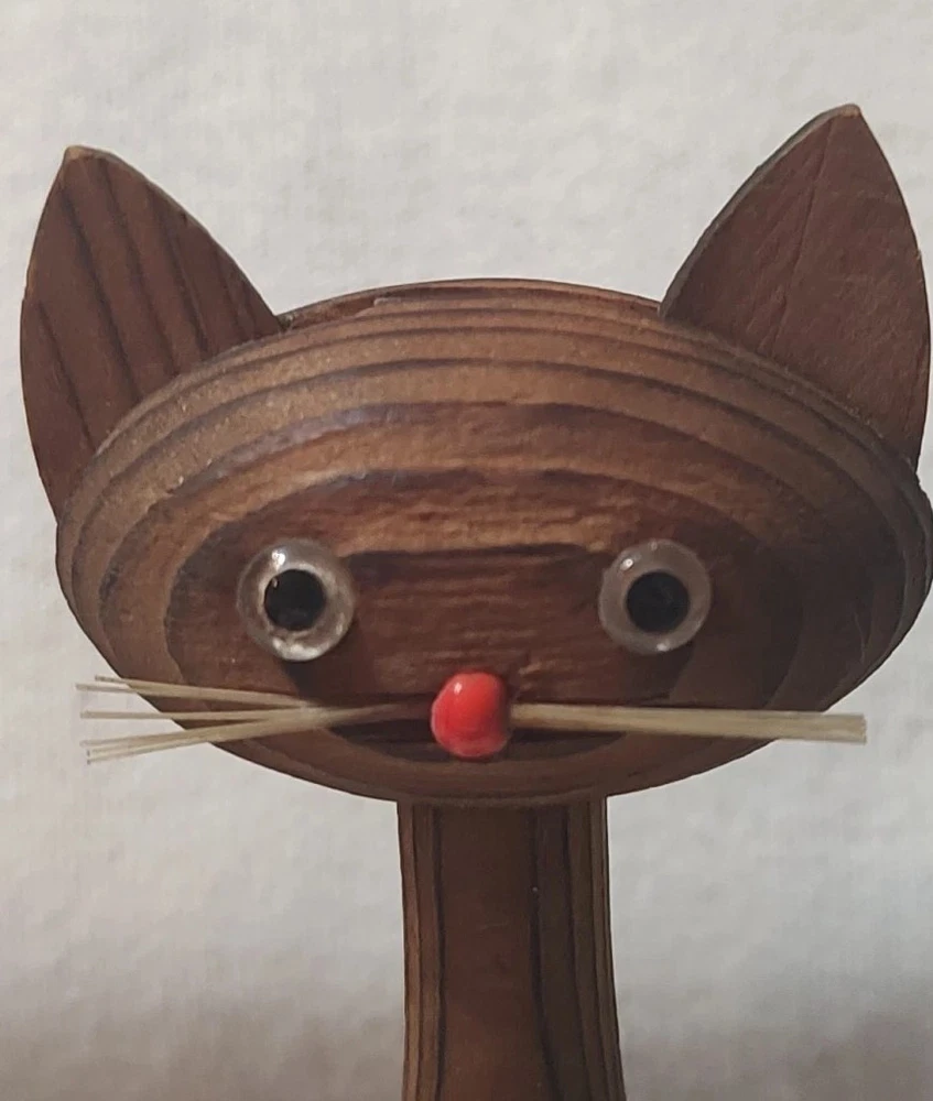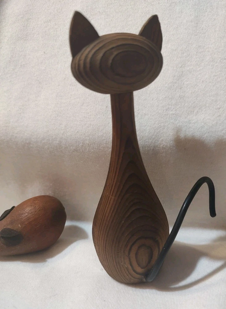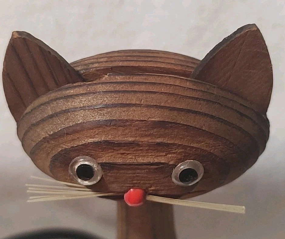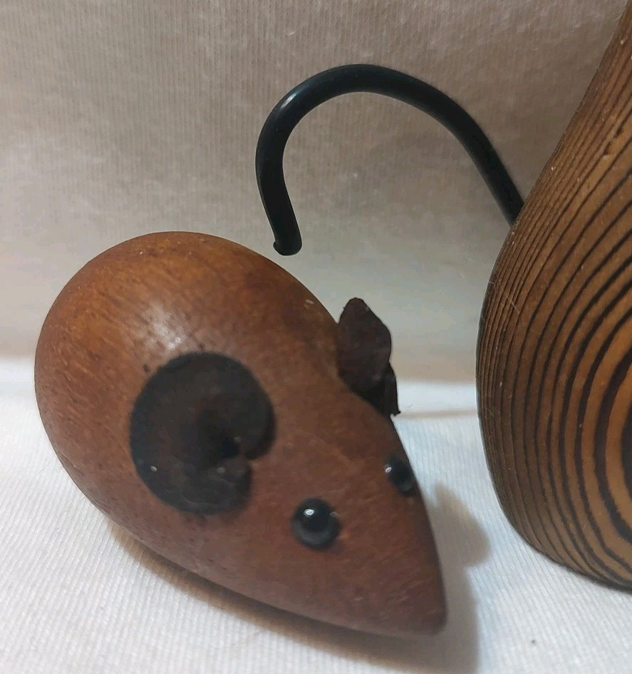 Vtg MCM Wooden Cat Kitty Figure Japan 5" Tall Woodgrain W/2 Unmatching Wood Mice, ***cat and mice have imperfections such as scrapes, scratches, mice have missing tails and crooked ears and eyes, please view all photos for description details, very cute.