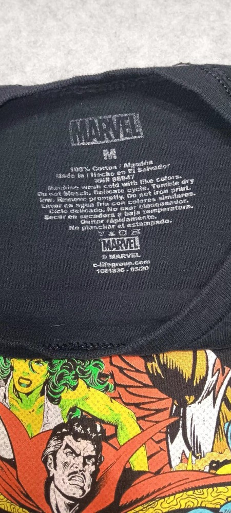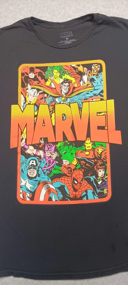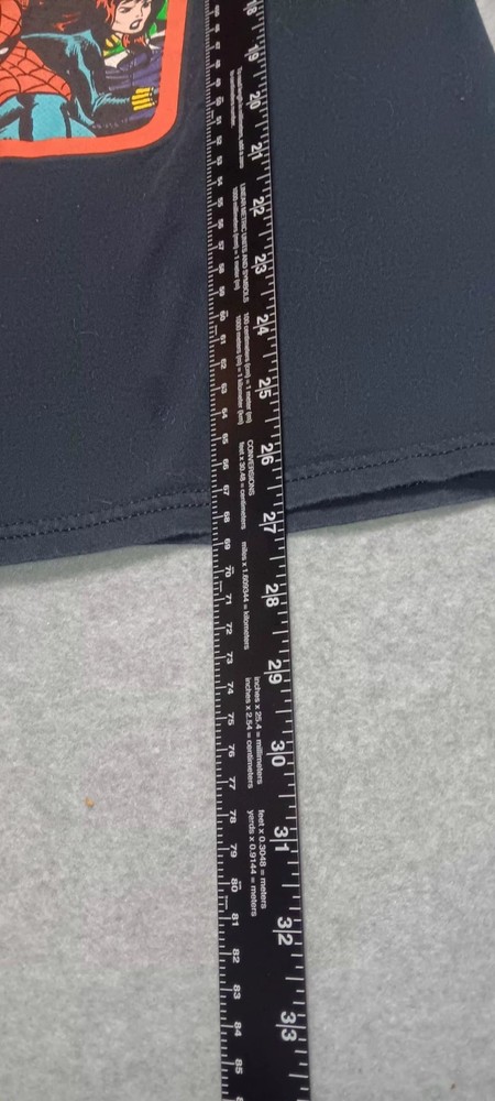 The Vintage Marvel Comic Graphic Short Sleeve Shirt is a black cotton t-shirt featuring graphic prints of popular Marvel superheroes like Spider-Man and Captain America. With a crew neckline and regular fit, this medium-sized shirt is machine washable and suitable for all seasons. Perfect for fans of the Marvel Universe, this shirt is a nostalgic piece that pays homage to the iconic characters and themes found in comic books. 3.