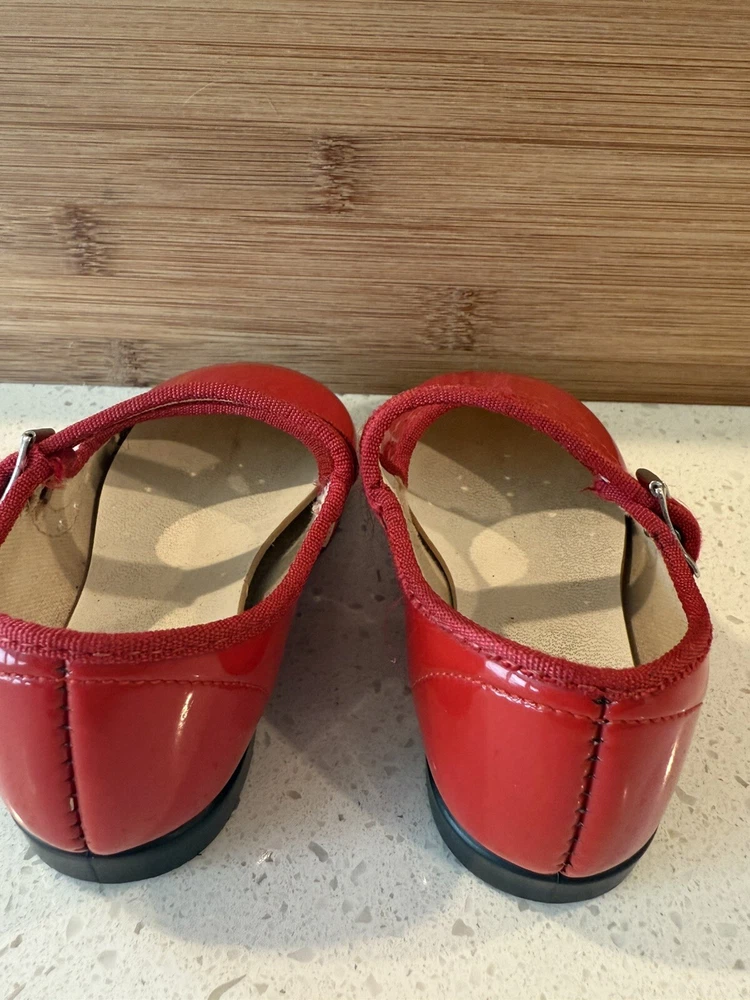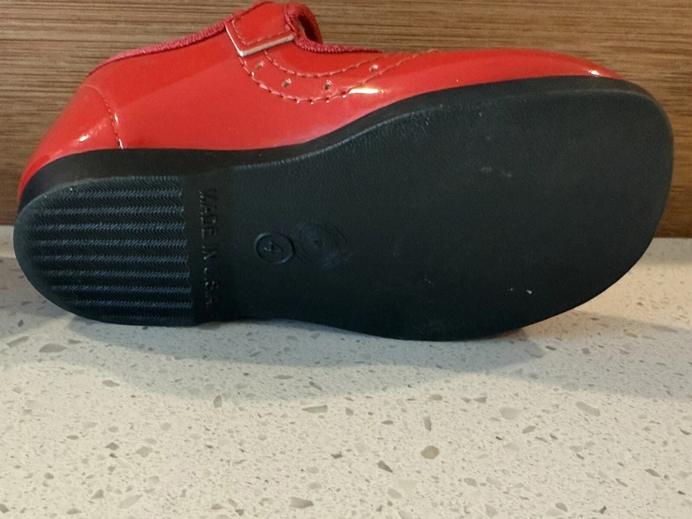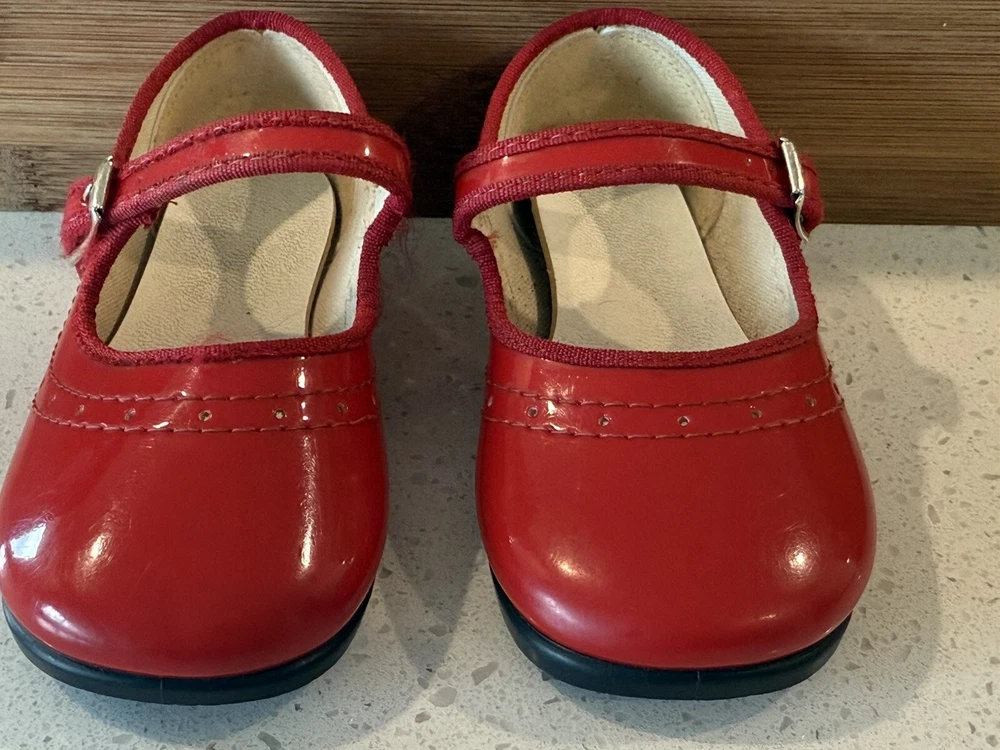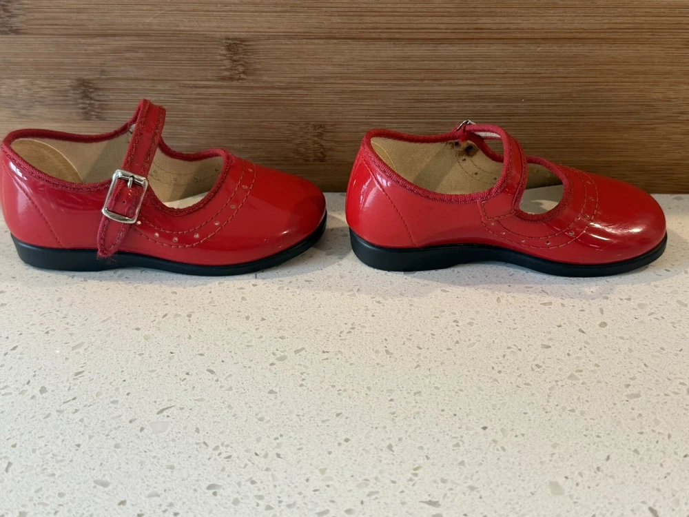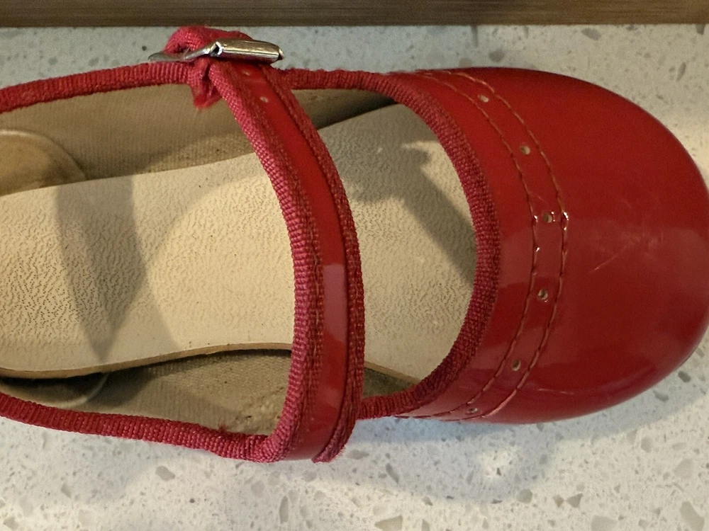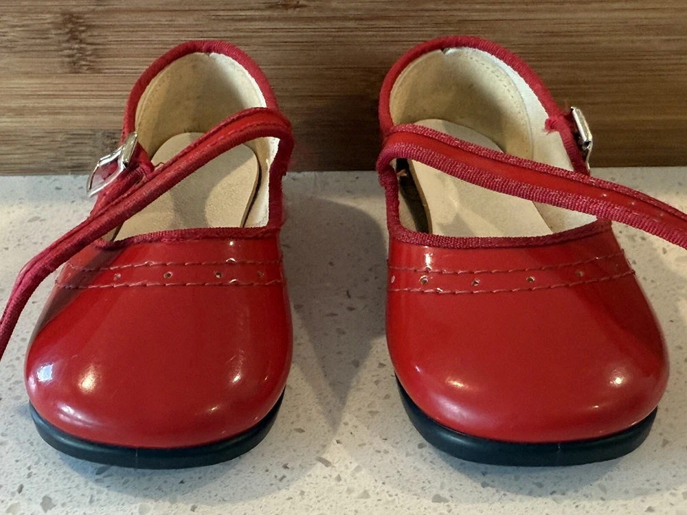 These vintage Mary Jane baby and toddler girl shoes are perfect for special occasions. They have a beautiful red patent finish and are made of faux leather with functioning buckles. The look of these shoes makes them a great addition to any vintage collection. These shoes are an original product and were made in the United States. They are size 4 and have a unique and stylish look that is hard to find in modern footwear. These shoes are a great addition to any vintage clothing, shoes, and accessories collection. From a smoke free home.