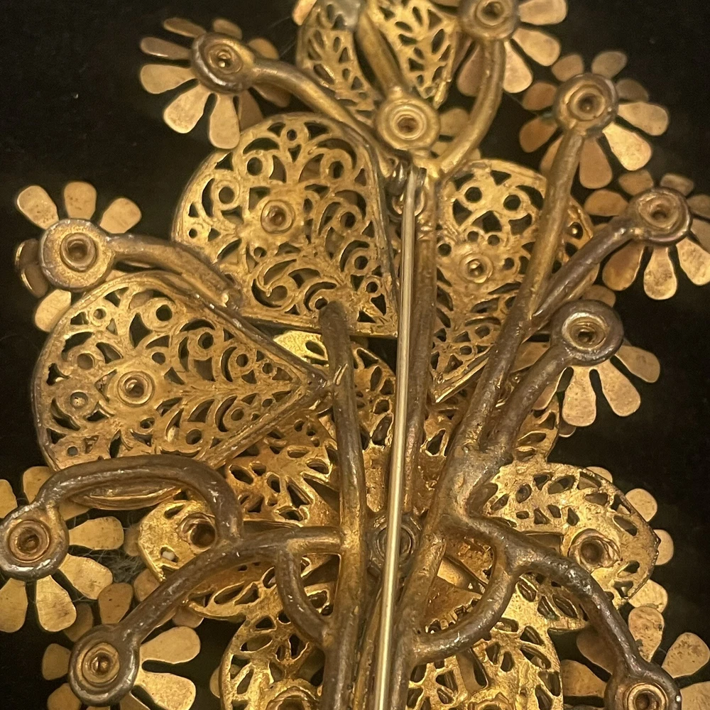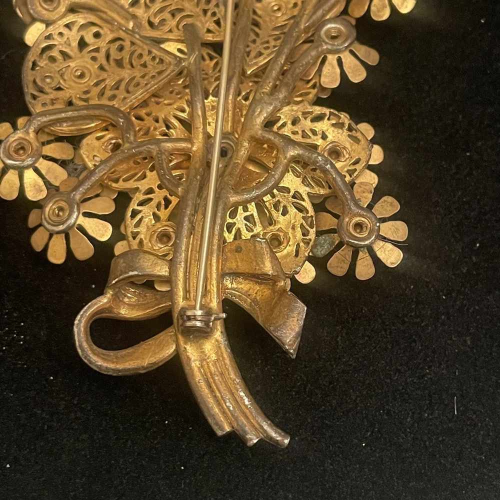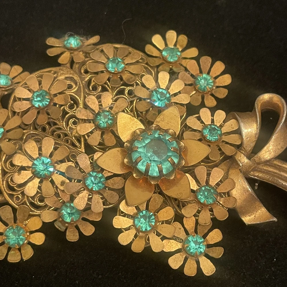 VTG Metal Floral Bouquet Ribbon Tied Brooch Aqua Rhinestones Shows Some Age & Wear. SEE ALL PICTURES