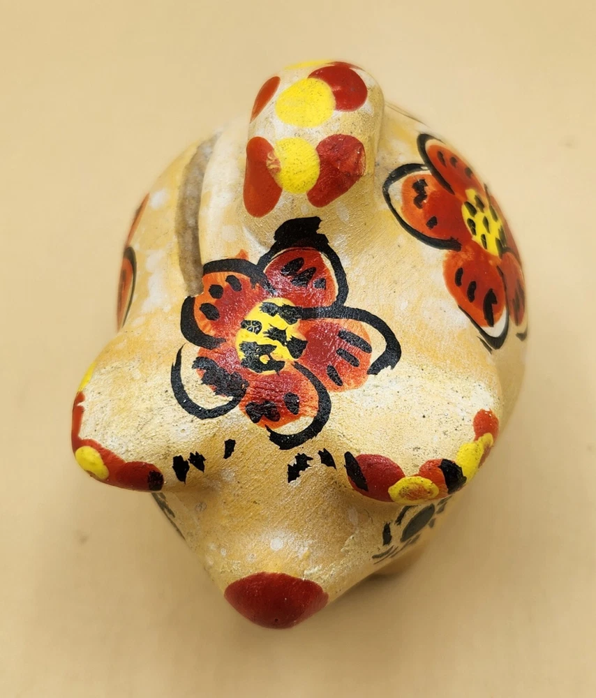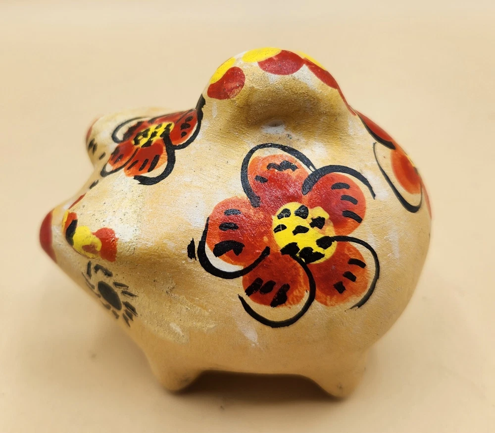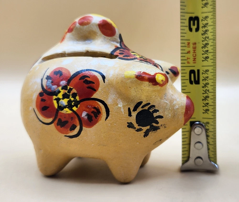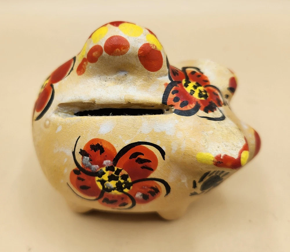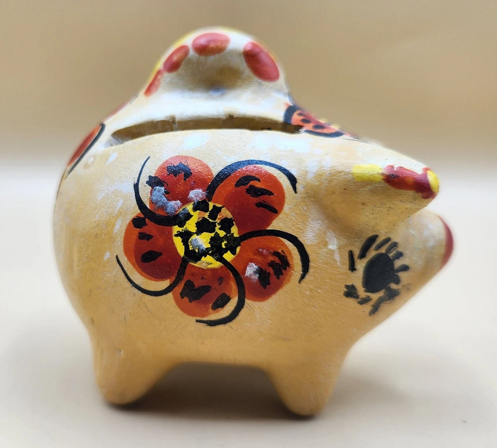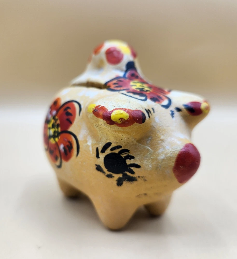 Vintage Mexican Ceramic Pig Piggy Bank With Handle Hand Painted 3"x2"x3" No Plug - Bank needs to break to open! PRE-OWNED CONDITION SMOKE FREE HOME FREE SHIPPING