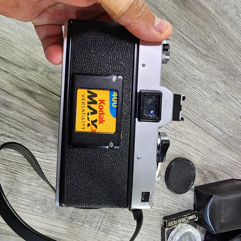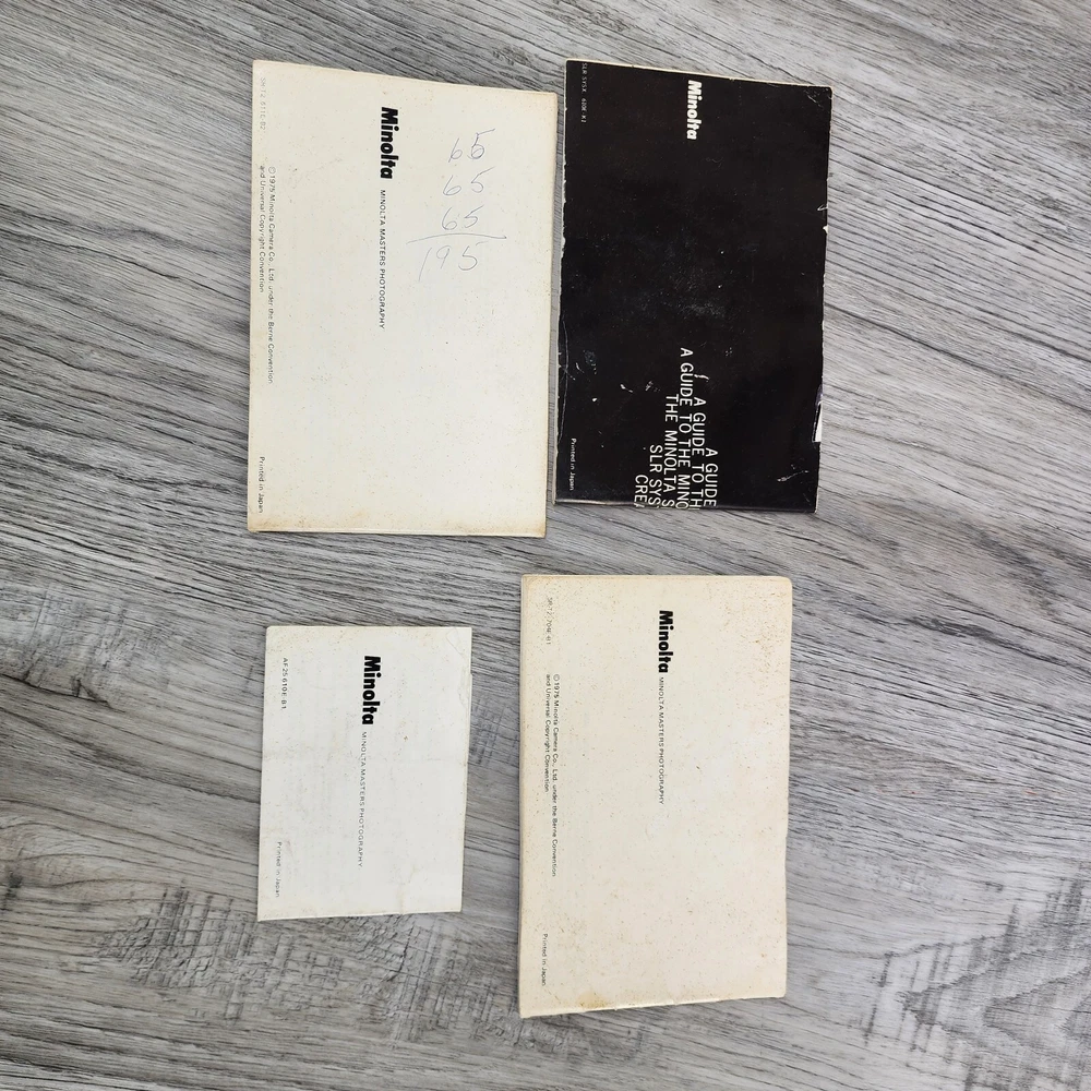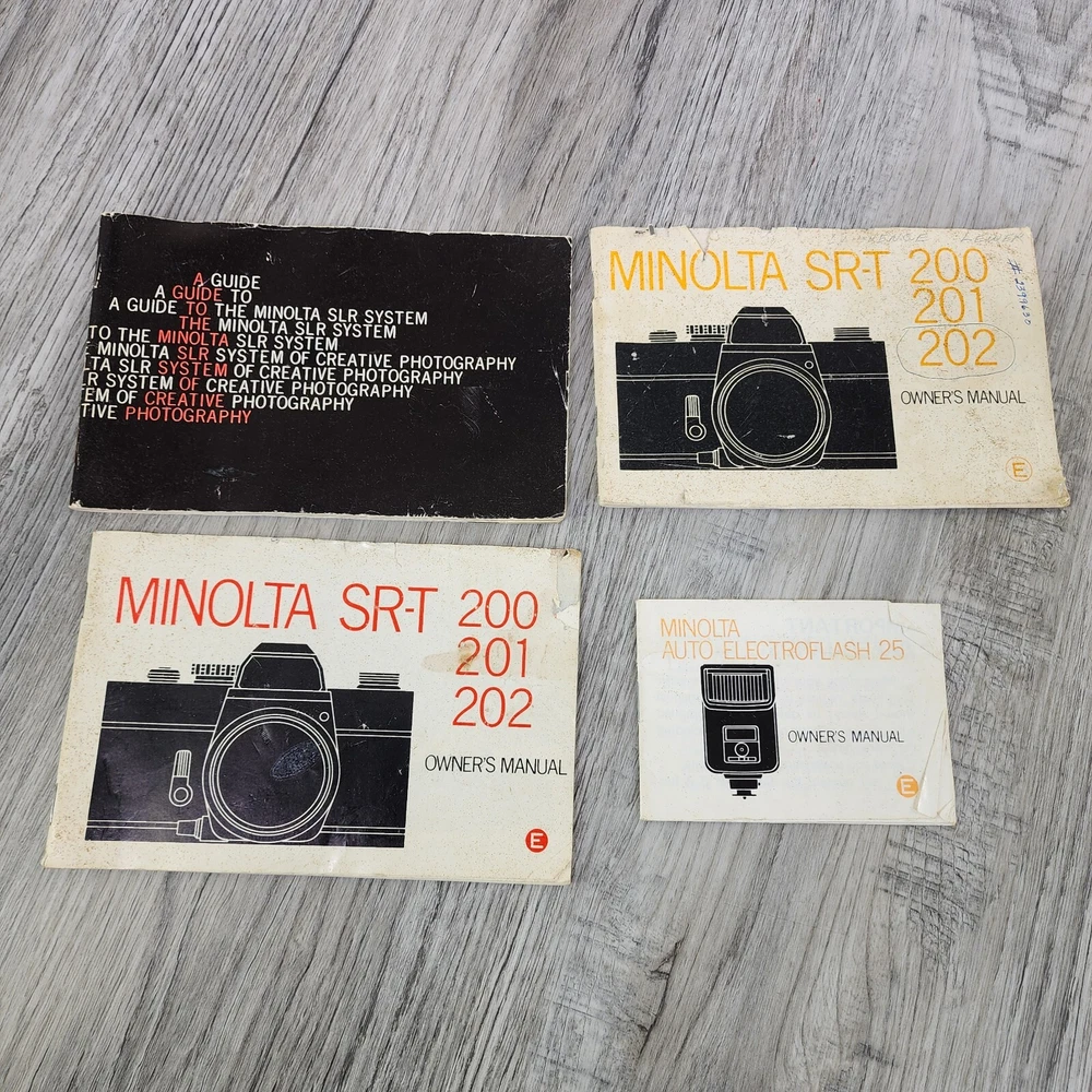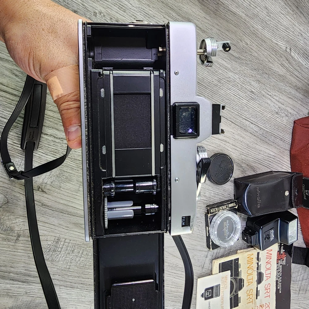 Vintage Minolta SRT202 35MM SLR Film Camera Shutter Tested Lens Bag Bundle *Read. In used condition please see pictures for details. The shutter works. It has 2 lens and a flash. Camera has a ding in thr one corner. Comes with bag and manuals. Bag is not great very dusty and bottom is seperated. Manuals are also dingy looking. Cool vintage film camera set.