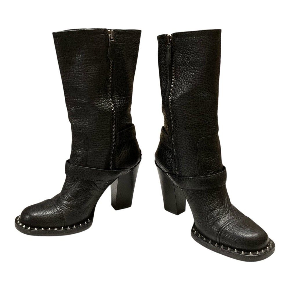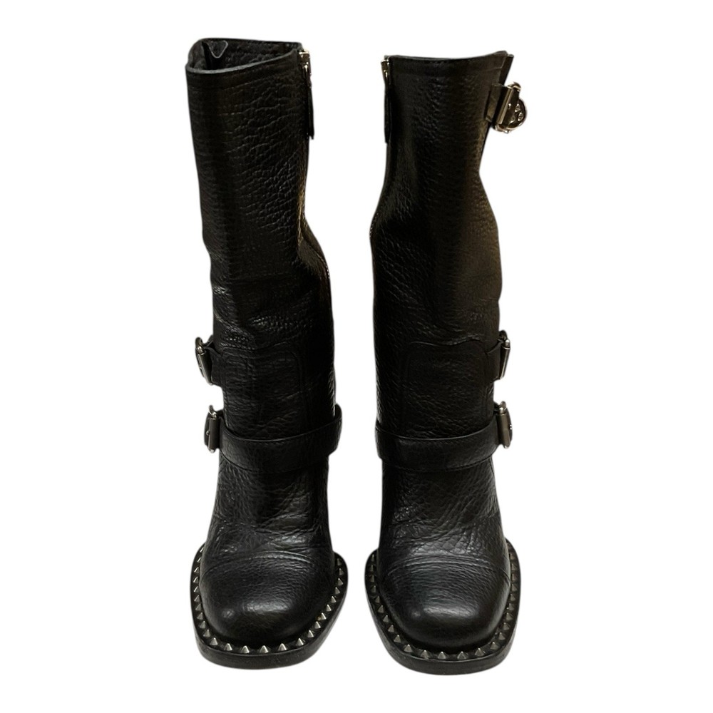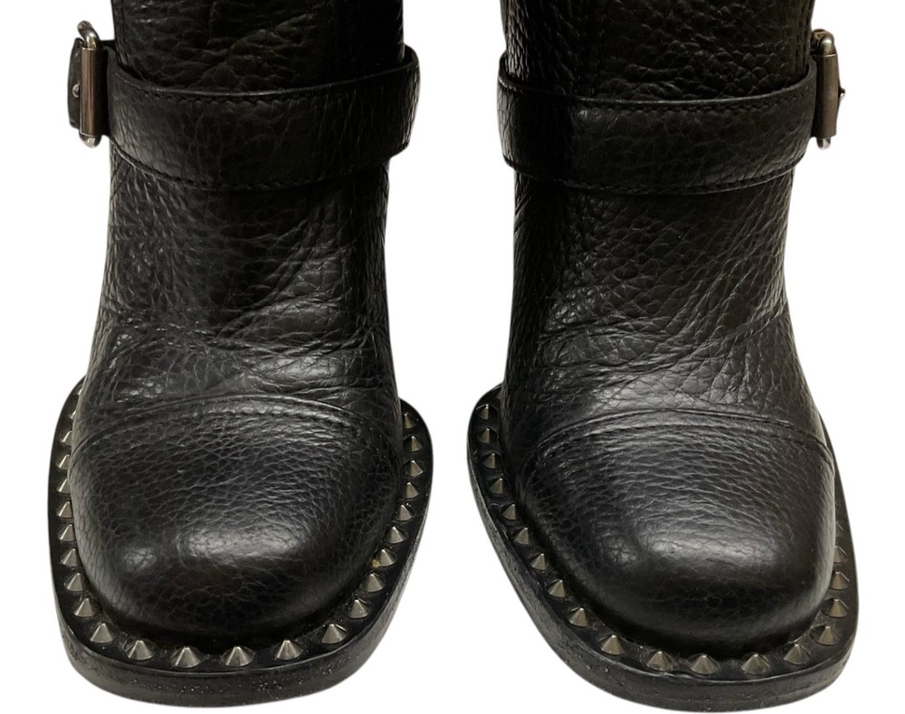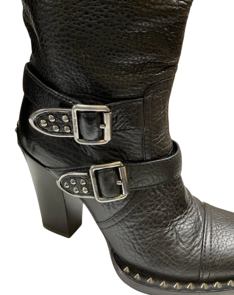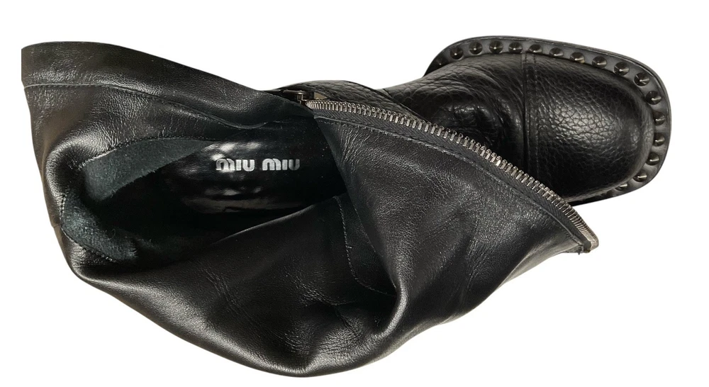 High quality supple black leather Silver tone buckles and stud spikes Back silver heel plates Stacked black wood heel Love them? Send me an offer! 😄 Brand: Miu Miu x Prada Style: heeled leather boots with studs Marked size: 36 Materials: leather, silver metal Measurements in inches: Length: 9.5 Exterior ball of foot: 4", boot itself on top at the vamp measures 3.5 Heel height: 3.75 Shaft: 9 Calf: 6.25 Front platform: .25 Condition: Some wear to the soles. No other major wear etc. Ready to wear upon arrival --------------------------------- RETURNS - Items sold as is, no returns. *If you choose to open a return anyway, you are responsible for shipping to/from. All items returned must be unworn and have any tyvek bands still attached. OFFERS - Reasonable offers welcome :) COMBINE SHIPPING? - Yes! FLAWS - We are human, sometimes things fly under our radar. Message about any glaring issues. We’re fast, but not Prime. Please give us a couple of days to process your order and we will get it out the door as soon as we can. --------------------------------