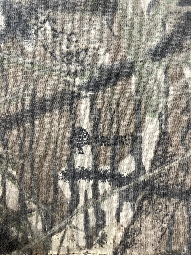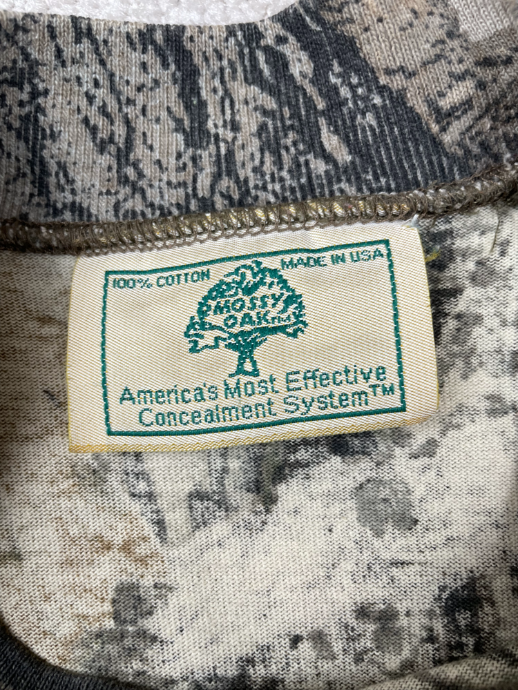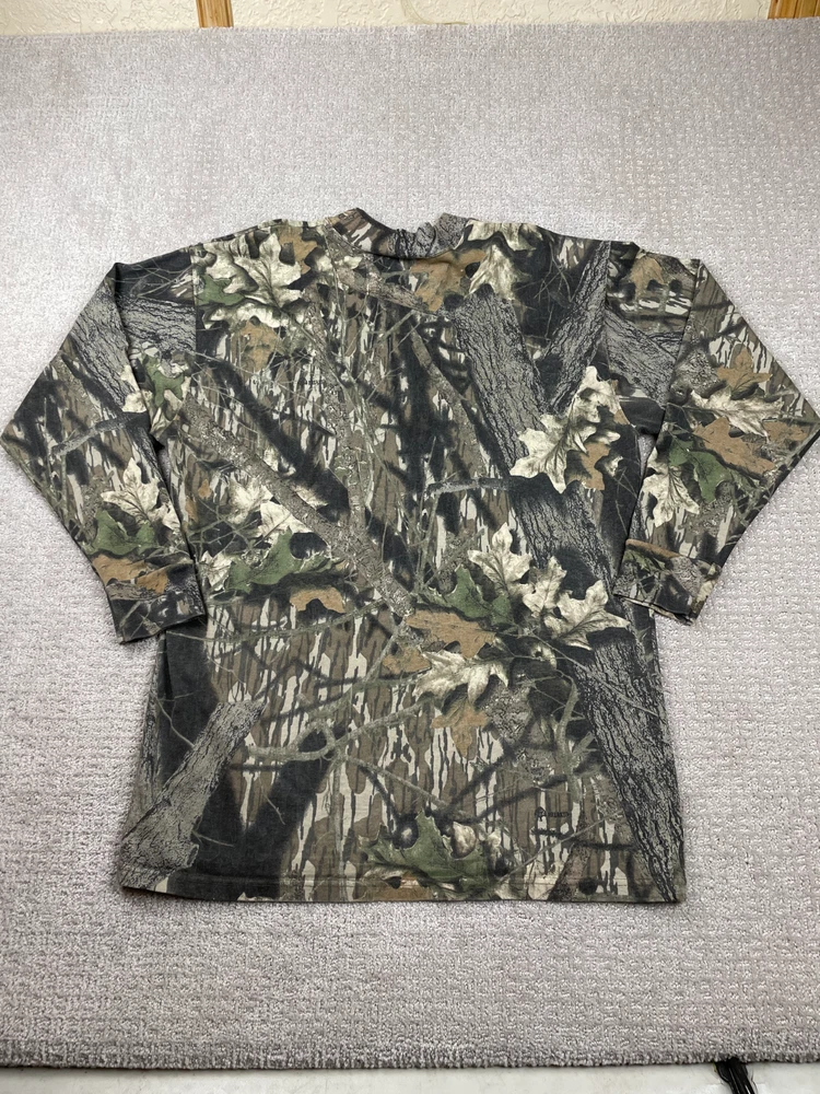 This Vintage Mossy Oak Shirt is a men's XL long sleeve mock neck shirt made in the USA. The shirt features a classic Break Up Camo pattern in multicolor camouflage, made of cotton material. It is machine washable and designed with a regular fit for comfort. Perfect for the seasons of summer, fall, and spring, this vintage shirt from the 1990s is a stylish choice for outdoor enthusiasts.