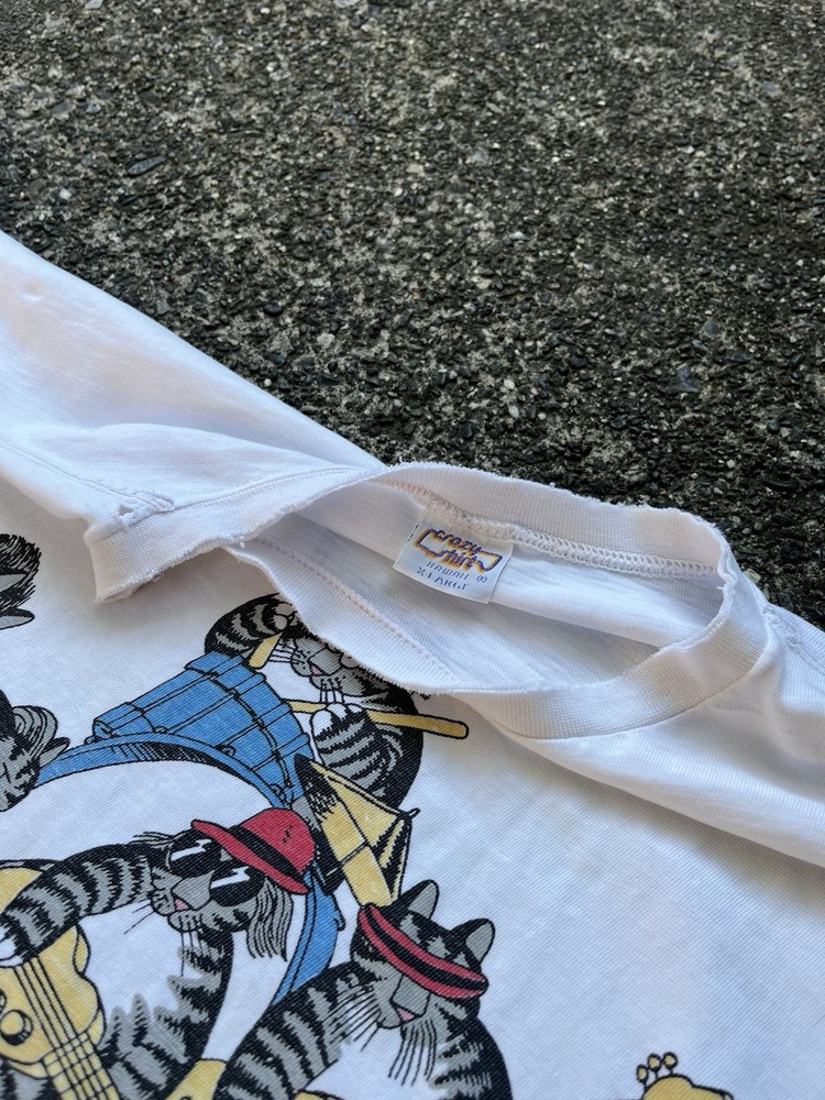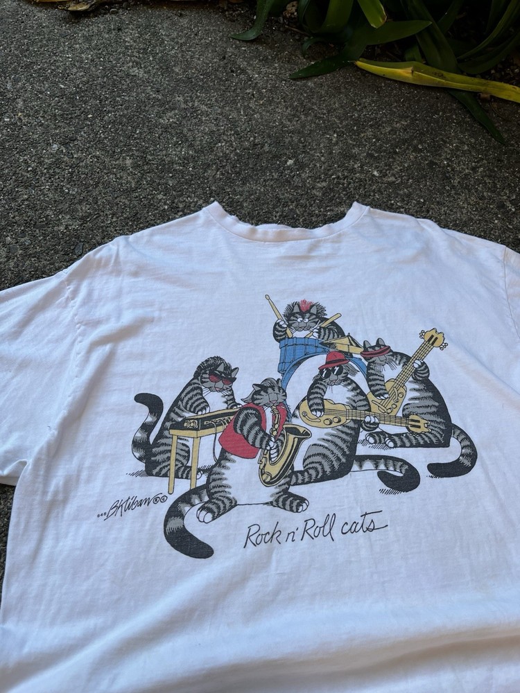 This Vintage NOS B Kliban Cat T-Shirt by Crazy Shirts is a must-have for any rock 'n' roll enthusiast from the 80s. Made of soft cotton with a graphic print of a cat, this short sleeve shirt in size XL features a regular fit and is machine washable. Perfect for wearing during the summer, fall, or spring seasons, this white shirt is a timeless piece that captures the playful and unique style of the era.