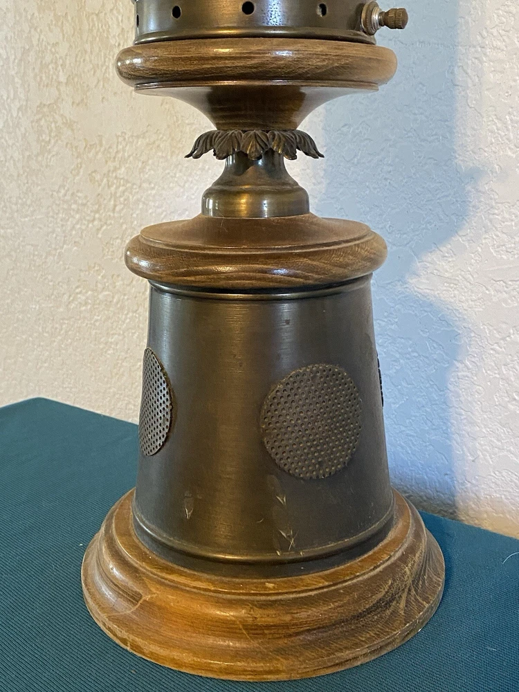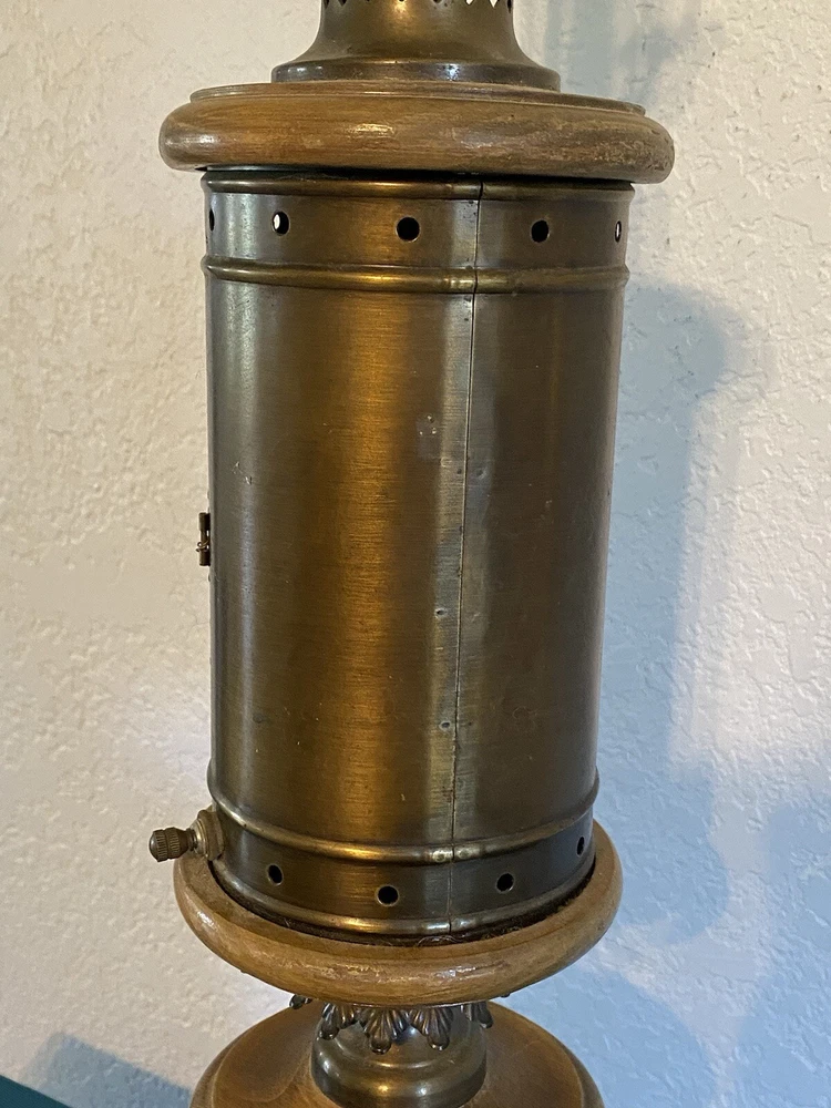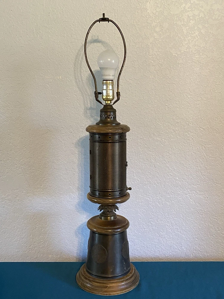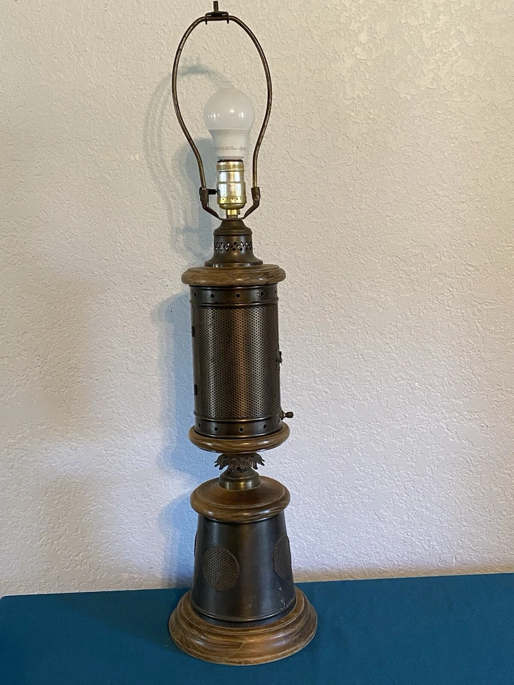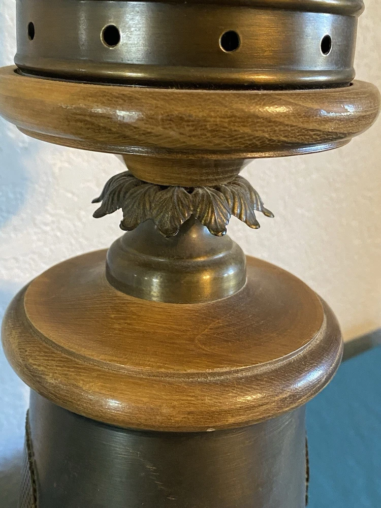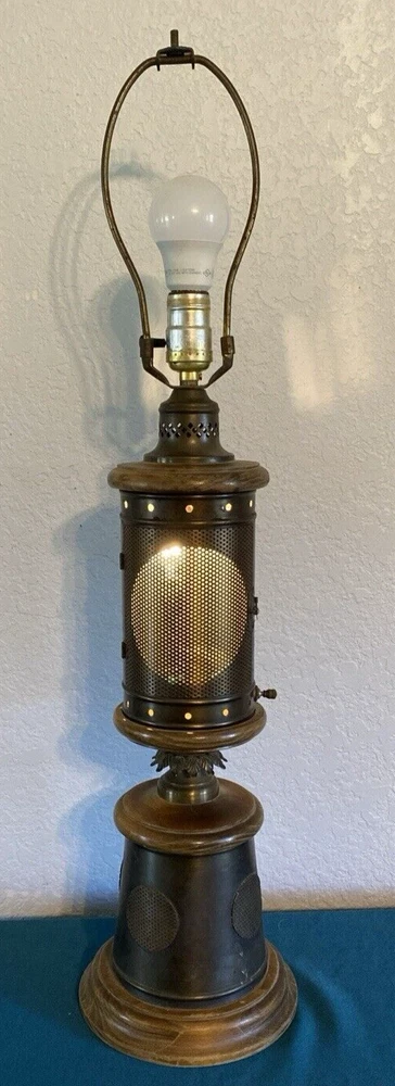 Vintage Nautical Lantern Table Lamp Brass Wood Dual Light - Will not be shipped with outer bulb - lamp shade not included - 29" tall 7" wide - latch for center opening was replaced long ago with a piece of wire to keep it closed - zoom in on photos for detail - this lamp is roughly 60 years old - signs of age can be seen