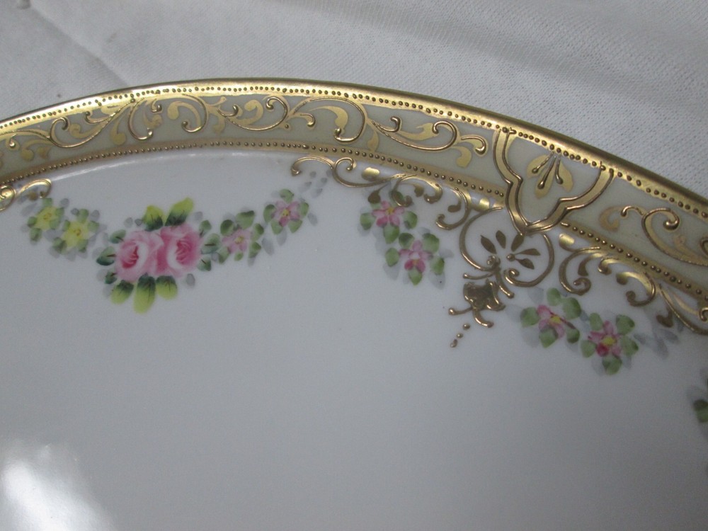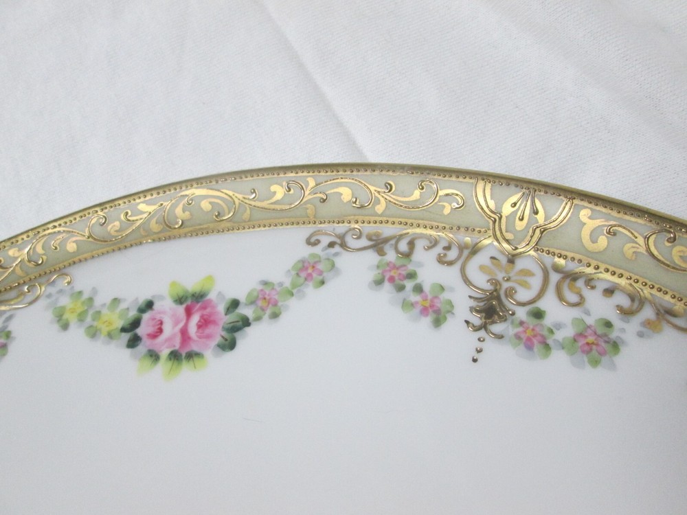 This is a vintage Nippon round flat cake plate in excellent condition. No chips, cracks, or crazing. No wear to the heavy gold trim. It has garland with roses and is 12in. across. It is marked with the cherry blossom mark. GREAT item to add to your collection, decor or existing set. Thanks for looking.