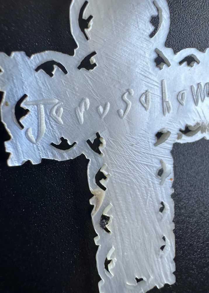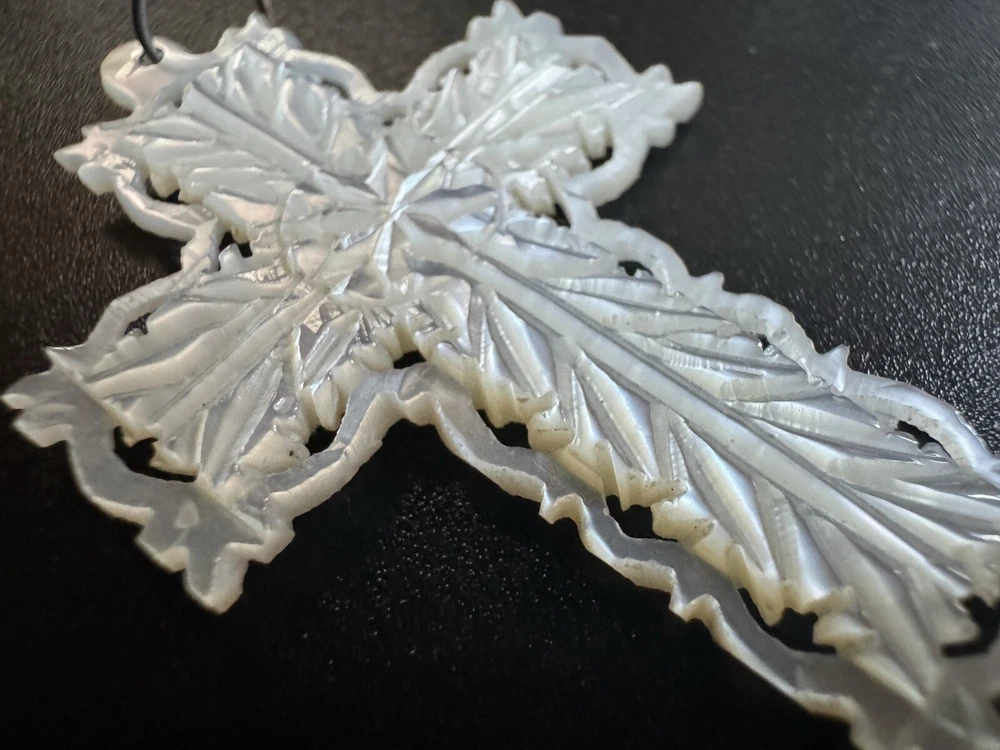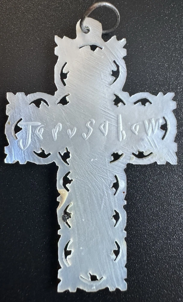 Vintage Ornate Carved Mother of Pearl Cross Pendant Jerusalem Marked Jerusalem on back of pendant. Preowned. There is some minor wear/discoloration. Please see pictures for details. Message with any questions. As is.