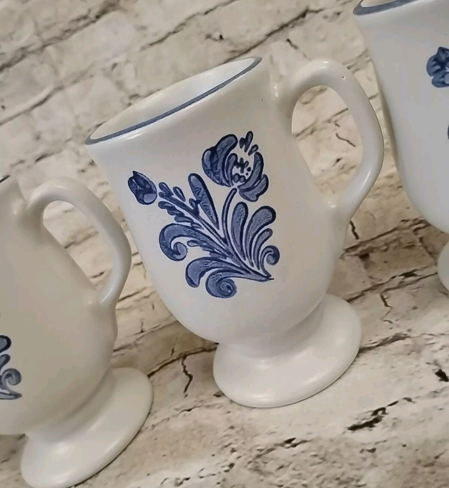 Add a touch of vintage charm to your mug collection with this set of four Pfaltzgraff Yorktown footed mugs. These stoneware mugs feature a beautiful blue floral pattern and have a capacity of 6 oz. The mugs measure 4-7/8" in height and have a diameter of 3". Perfect for all occasions, these mugs are a great addition to any decorative cookware, dinnerware, or serveware collection. The set includes three mugs and is an original, licensed reproduction from the United States. The backstamp is impressed with the brand name "Pfaltzgraff" and the item is categorized under Pottery & Glass, Decorative Cookware, Dinnerware & Serveware, and Mugs.
