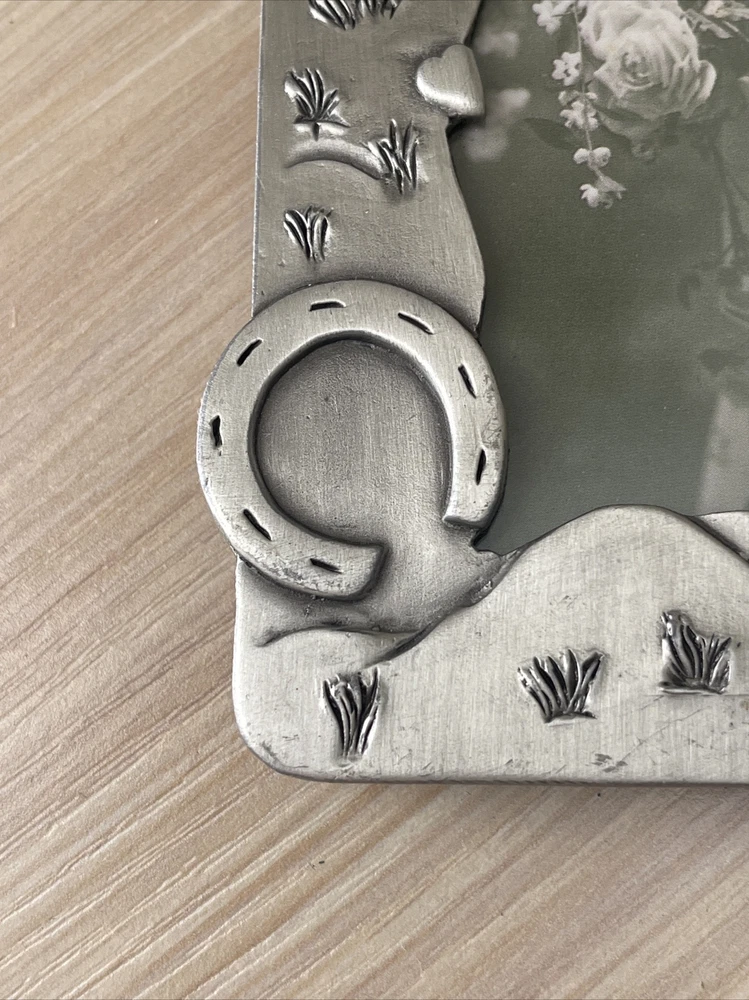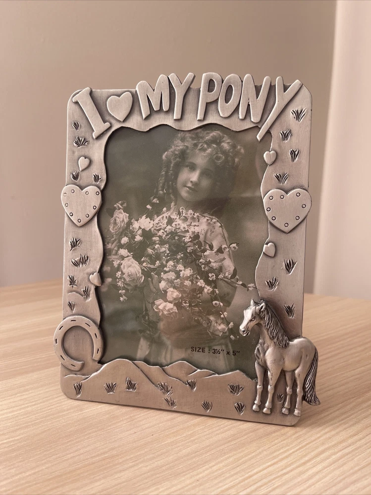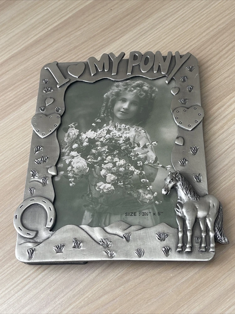 Vintage Photo Frame Love My Pony Western Hearts Horse 3x5 Easel Back Silver Sweet vintage photo frame. Great gift for the pony lover! The back easel needs regluing. Please see photos.