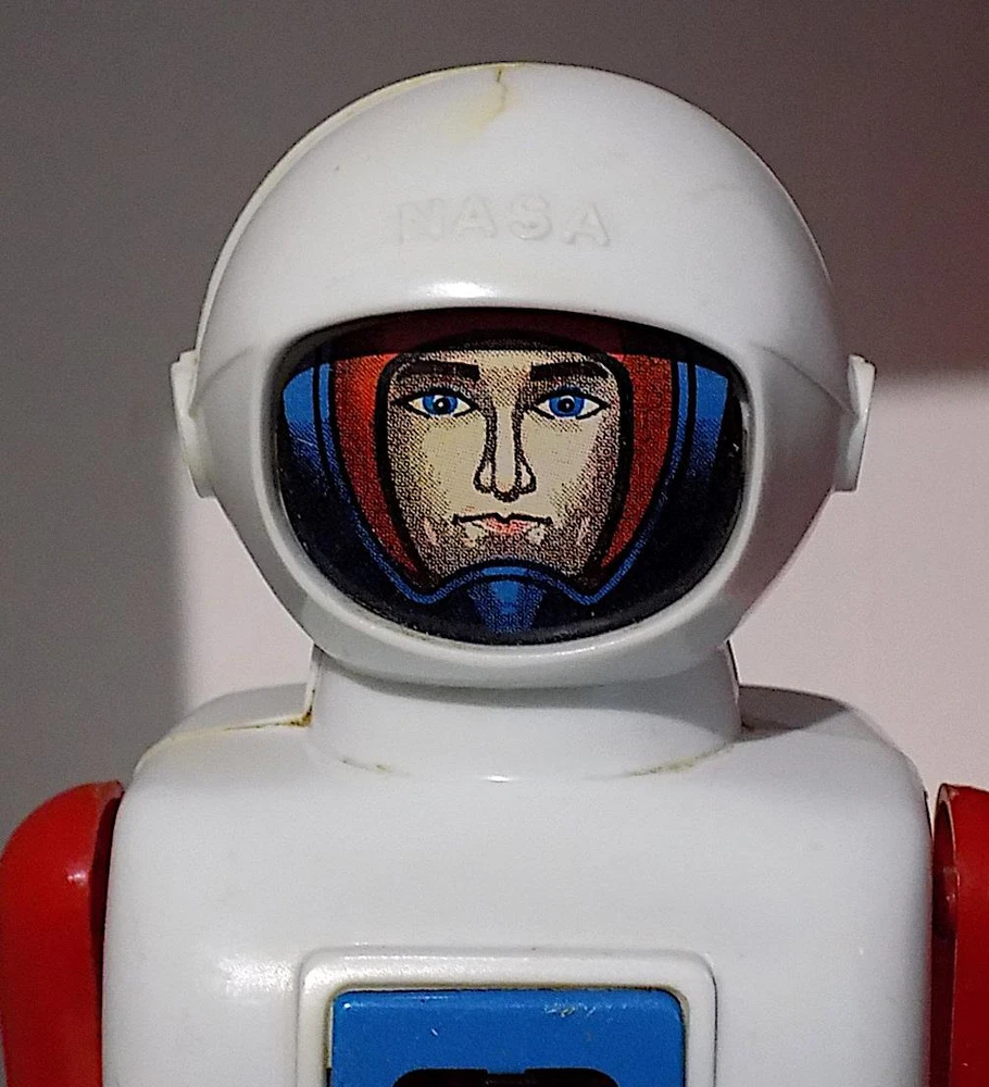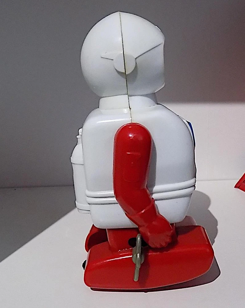 Vintage Plastic + Tin Wind-Up Astro Captain NASA Astronaut with Sparks, Daiya, Japan, 1960’s. A vintage plastic and tinplate clockwork “Astro Captain” NASA Astronaut toy with white plastic body and helmet, red plastic arms and legs, tinplate lithographed face and chest plate with red plastic panel, made in Japan by the Daiya Co. in the 1960's. It has a forward walking action with moving legs and sparking in the red chest panel. The toy is 6.25 inches tall by 3.5 wide and 3 inches deep and is all plastic except for the tinplate face and chest plate. It is in good used condition with some marks, a small crack to the top of the helmet and a stress crack to the back of the lower body. When wound using the built-in key, the astronaut moves forward with moving legs, swinging arms and still sparks well in the chest. It occasionally gets stuck when moving forward – there is a metal plate at the rear of the base and this needs to be at the right angle to enable the toy to slide forward. It looks also like the plastic key has had a repair, so care needs to be taken when winding up (turn the key in the middle). No apparent makers mark, just marked with “NASA” on the helmet front. A nice vintage plastic and tinplate working Nasa Astronaut, hard to find in any condition, that would make a great addition to any collection of robots, space or clockwork toys. Please see my other vintage items listed. Vintage Plastic + Tin Wind-Up Astro Captain NASA Astronaut - Sparks, Daiya Japan Vintage Plastic + Tin Wind-Up Astro Captain NASA Astronaut - Sparks, Daiya Japan Click images to enlarge Description Vintage Plastic + Tin Wind-Up Astro Captain NASA Astronaut with Sparks, Daiya, Japan, 1960’s. A vintage plastic and tinplate clockwork “Astro Captain” NASA Astronaut toy with white plastic body and helmet, red plastic arms and legs, tinplate lithographed face and chest plate with red plastic panel, made in Japan by the Daiya Co. in the 1960's. It has a forward walking action with moving legs and sparking in the red chest panel. The toy is 6.25 inches tall by 3.5 wide and 3 inches deep and is all plastic except for the tinplate face and chest plate. It is in good used condition with some marks, a small crack to the top of the helmet and a stress crack to the back of the lower body. When wound using the built-in key, the astronaut moves forward with moving legs, swinging arms and still sparks well in the chest. It occasionally gets stuck when moving forward – there is a metal plate at the rear of the base and this needs to be at the right angle to enable the toy to slide forward. It looks also like the plastic key has had a repair, so care needs to be taken when winding up (turn the key in the middle). No apparent makers mark, just marked with “NASA” on the helmet front. A nice vintage plastic and tinplate working Nasa Astronaut, hard to find in any condition, that would make a great addition to any collection of robots, space or clockwork toys. Please see my other vintage items listed. Payment PAYMENT I prefer payment by eBay Managed Payments, but will accept Paypal. For Overseas Customers, myr preferred alternate payment method is by Paypal - I will accept other payments such as bank transfers, but please note these will incur extra cost and please contact prior to placing a bid if you wish to make alternative arrangements. Shipping Please note that items to the value of more than £22.00, posted to mainland UK, will now be sent either by Signed For or Special Delivery to ensure adequate cover in case of loss or damage. The cost of this is shown in the Postage. I will post items Worldwide (unless stated in the advert). Please note that items sent overseas by Royal Mail (Small Packet) are only insured up to a value of £21.00. Any parcels worth more than this sent overseas will now be sent with tracking/insurance. If you would like to know the cost of a signed for, tracked and insured overseas service, please contact me before the auction ends. I will always look for the cheapest price for you. Every item I send will be carefully packed and proof of postage will be kept. In the unlikely event you need to claim for lost or damaged goods, please contact me before leaving feedback on eBay - I will always try to resolve the issue to your satisfaction. I will dispatch your goods, whenever possible, within 1 working day of your payment being received and whenever possible, I will always combine postage to save you money. Terms of Sale I accept returns of faulty, damaged or incorrectly described items, but please note that I am usually selling vintage items which are not in perfect condition. If you have a problem, please contact me before leaving negative feedback - I will always try to resolve the issue. About Us norfolk-county-collectables is based, as the name suggests, in the lovely East Anglian county of Norfolk, England. I try to sell interesting and collectable objects at reasonable prices, with new stock arriving on a regular basis. If you're looking for something to buy, or even looking to sell, please contact me, we will get back to you! Contact Us If you wish to contact me, please leave a message via an Ebay Message. Images sell! Get Supersized Images & Free Image Hosting Create your brand with Auctiva's Customizable Templates. Attention Sellers - Get Templates Image Hosting, Scheduling at Auctiva.com. Track Page Views With Auctiva's Counter