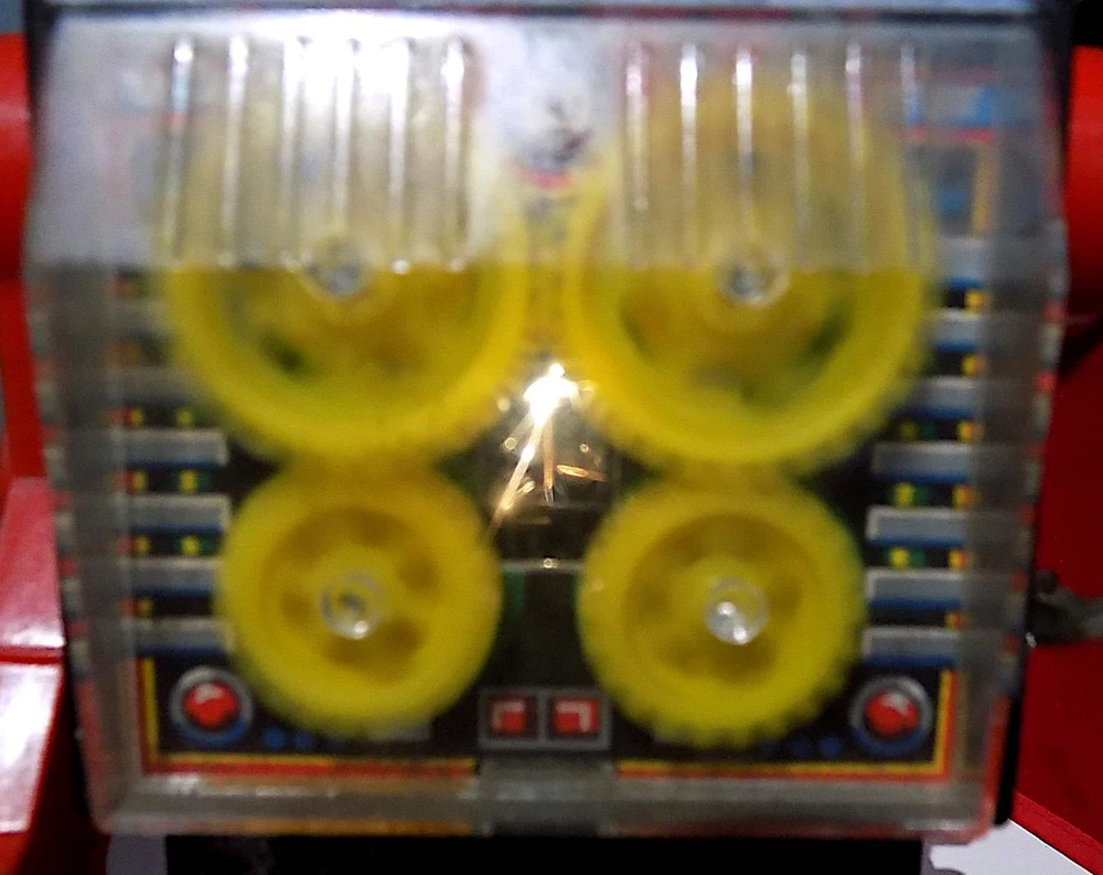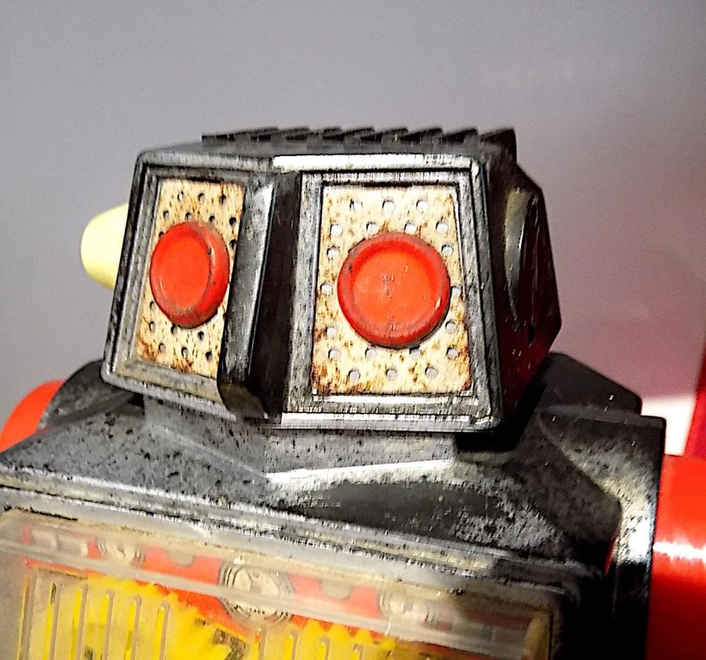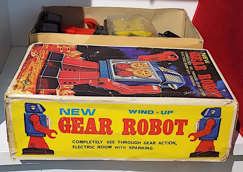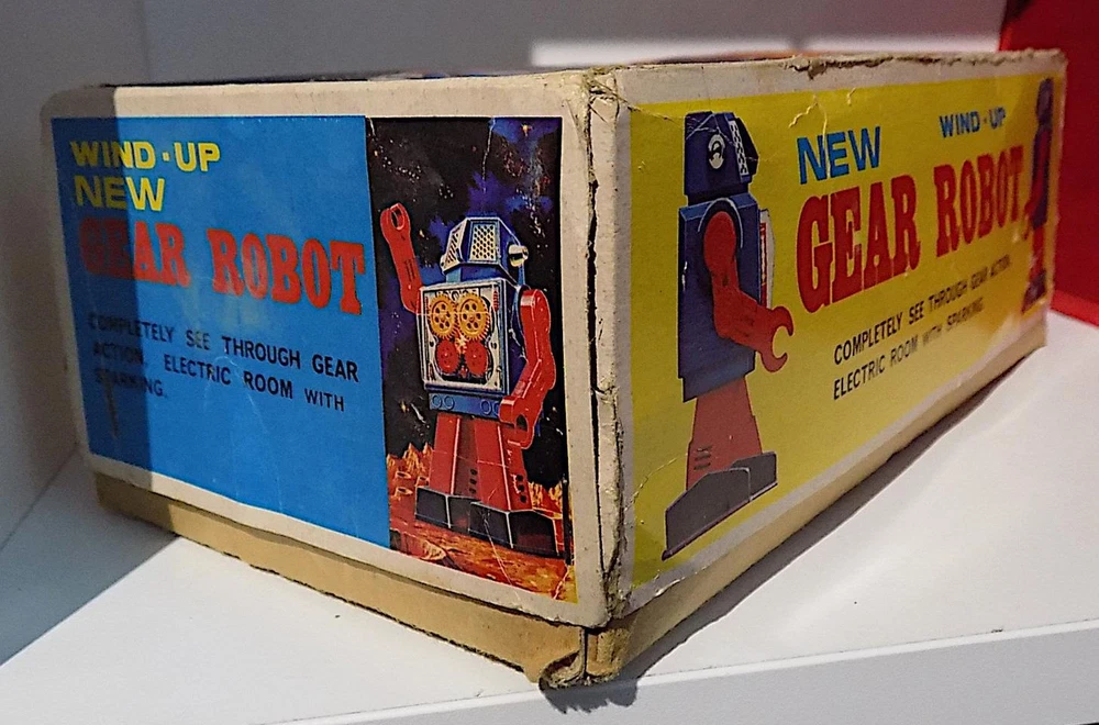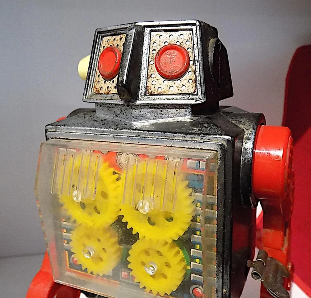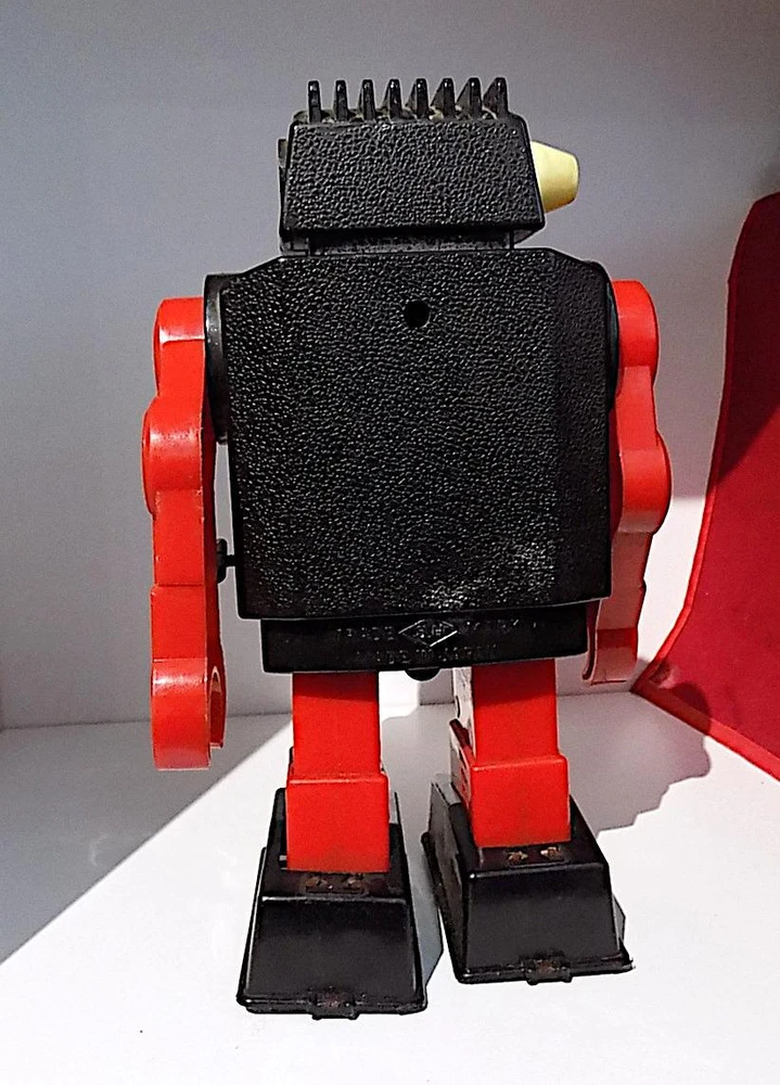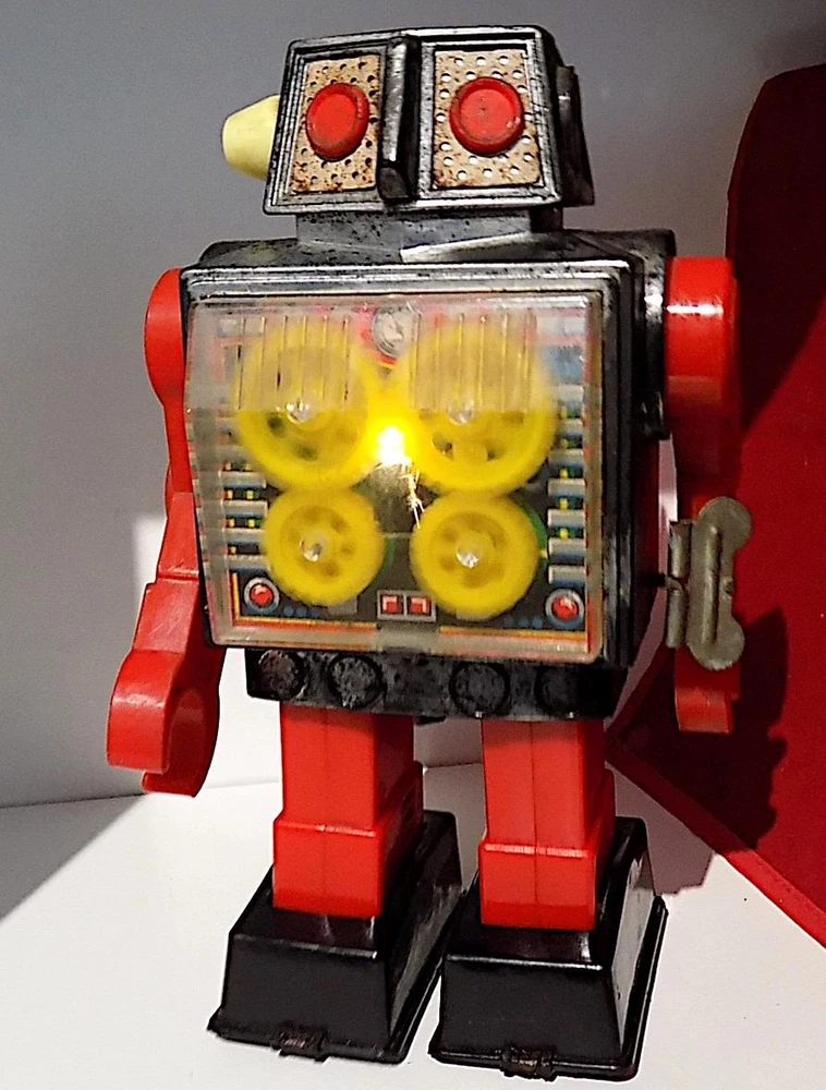 Vintage Plastic + Tin Clockwork New Gear Robot Wt Spark, Horikowa (S.H.) Japan. VGiB A nice vintage plastic clockwork New Gear Robot with silver plastic body and head, red legs and arms, black plastic feet, clear plastic cover over the lithographed tinplate chest plate and four yellow gears and white plastic ears, made by the Horikowa (S.H.) Co. in Japan in the 1960's or 70's with the original box. When wound using the built-in key, the Robot walks forward while the gears spin in the chest and sparks appear in the space between the gears. The robot is in good to very good working condition with some playwear and loss to the silver finish on the body and head, and missing one ear. It measures 8.25 inches tall by 5 inches across and 3 inches deep, and is marked with the Horikowa “S.H.” Trade Mark and “Made in Japan” on the rear of the lower body. Comes with a very good original box, also fully marked and nicely illustrated. A nice vintage wind-up toy that does not come up very often, especially in good working condition, and a great addition to a robot or space collection. Please see my other vintage toys listed. Vintage Plastic + Tin Wind-Up New Gear Robot Wt Spark, Horikowa (SH) Japan, VGiB Vintage Plastic + Tin Wind-Up New Gear Robot Wt Spark, Horikowa (SH) Japan, VGiB Click images to enlarge Description Vintage Plastic + Tin Clockwork New Gear Robot Wt Spark, Horikowa (S.H.) Japan. VGiB A nice vintage plastic clockwork New Gear Robot with silver plastic body and head, red legs and arms, black plastic feet, clear plastic cover over the lithographed tinplate chest plate and four yellow gears and white plastic ears, made by the Horikowa (S.H.) Co. in Japan in the 1960's or 70's with the original box. When wound using the built-in key, the Robot walks forward while the gears spin in the chest and sparks appear in the space between the gears. The robot is in good to very good working condition with some playwear and loss to the silver finish on the body and head, and missing one ear. It measures 8.25 inches tall by 5 inches across and 3 inches deep, and is marked with the Horikowa “S.H.” Trade Mark and “Made in Japan” on the rear of the lower body. Comes with a very good original box, also fully marked and nicely illustrated. A nice vintage wind-up toy that does not come up very often, especially in good working condition, and a great addition to a robot or space collection. Please see my other vintage toys listed. Payment PAYMENT I prefer payment by eBay Managed Payments, but will accept Paypal. For Overseas Customers, myr preferred alternate payment method is by Paypal - I will accept other payments such as bank transfers, but please note these will incur extra cost and please contact prior to placing a bid if you wish to make alternative arrangements. Shipping Please note that items to the value of more than £22.00, posted to mainland UK, will now be sent either by Signed For or Special Delivery to ensure adequate cover in case of loss or damage. The cost of this is shown in the Postage. I will post items Worldwide (unless stated in the advert). Please note that items sent overseas by Royal Mail (Small Packet) are only insured up to a value of £21.00. Any parcels worth more than this sent overseas will now be sent with tracking/insurance. If you would like to know the cost of a signed for, tracked and insured overseas service, please contact me before the auction ends. I will always look for the cheapest price for you. Every item I send will be carefully packed and proof of postage will be kept. In the unlikely event you need to claim for lost or damaged goods, please contact me before leaving feedback on eBay - I will always try to resolve the issue to your satisfaction. I will dispatch your goods, whenever possible, within 1 working day of your payment being received and whenever possible, I will always combine postage to save you money. Terms of Sale I accept returns of faulty, damaged or incorrectly described items, but please note that I am usually selling vintage items which are not in perfect condition. If you have a problem, please contact me before leaving negative feedback - I will always try to resolve the issue. About Us norfolk-county-collectables is based, as the name suggests, in the lovely East Anglian county of Norfolk, England. I try to sell interesting and collectable objects at reasonable prices, with new stock arriving on a regular basis. If you're looking for something to buy, or even looking to sell, please contact me, we will get back to you! Contact Us If you wish to contact me, please leave a message via an Ebay Message. Pictures sell! Auctiva offers Free Image Hosting and Editing. 300+ Listing Templates! Auctiva gets you noticed! The complete eBay Selling Solution. Track Page Views With Auctiva's Counter