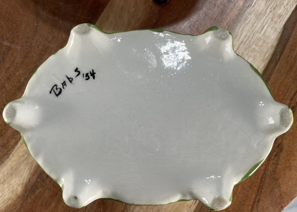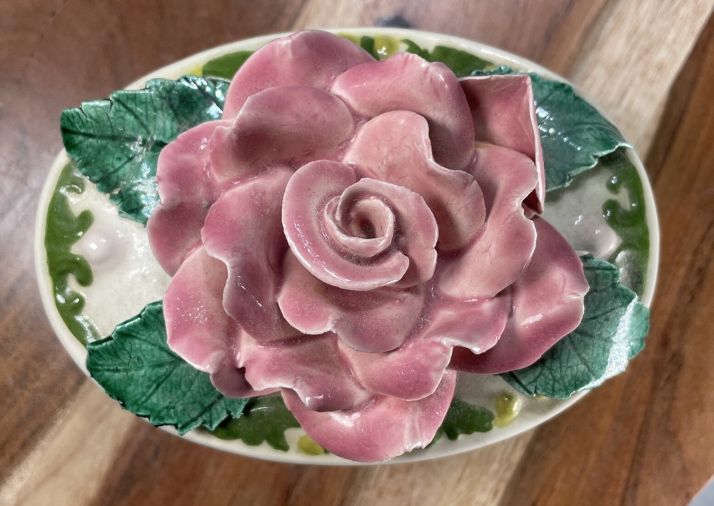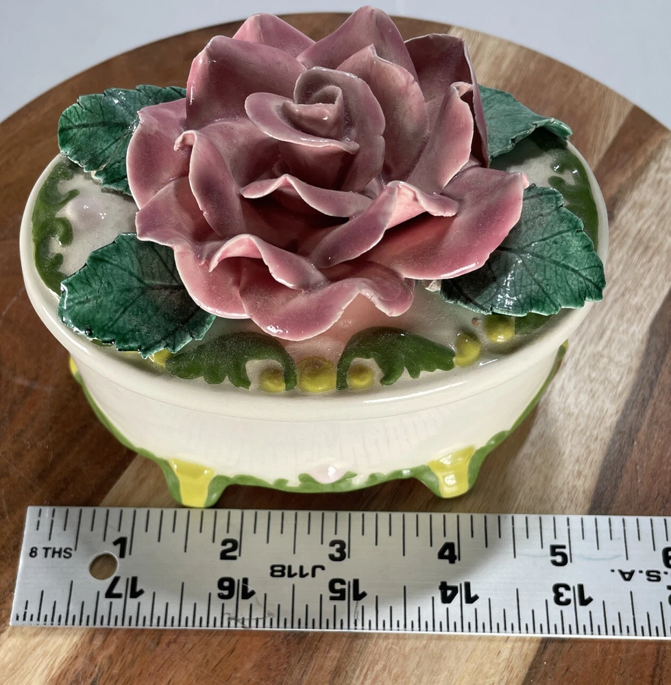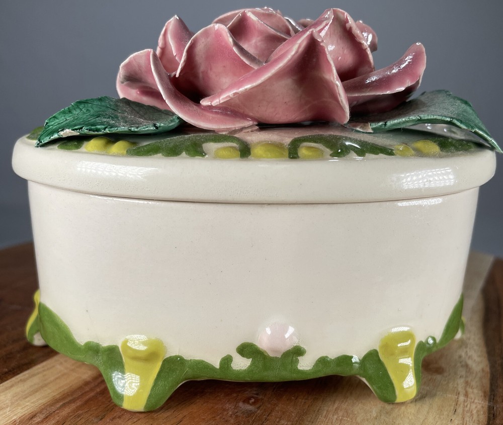 Vintage Porcelain "Trinket Box - Raised Flower Design" Hand-Painted Covered Trinket Box 3 1/8" Wide x 4 1/2" Length x 2" Tall Hand-Painted with a Raised Pink Rose Floral Design No Makers Marks Signed Babs '54 Imperfections: (see photos for details) There is one visible chip in a leaf There is a chip in a leaf located below the flower One of the Leaves has been repaired Trinket Box is in beautiful condition despite the few imperfections. Update