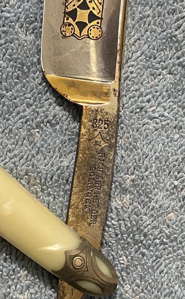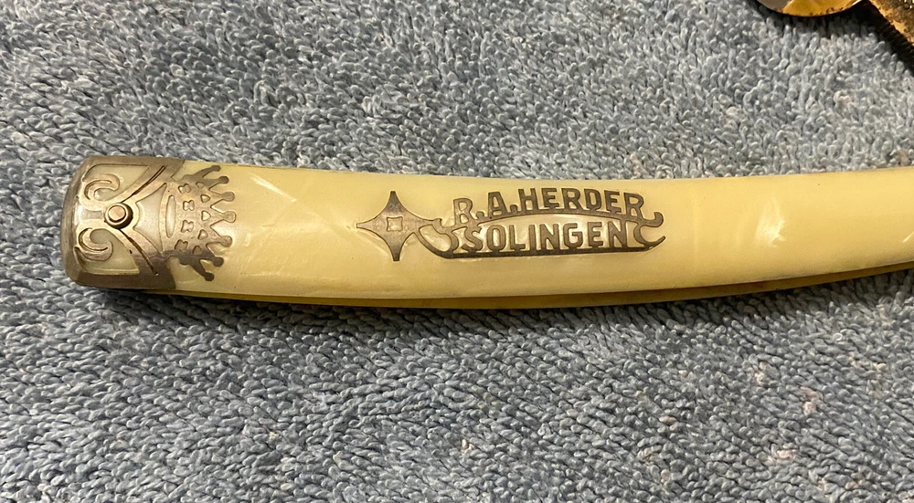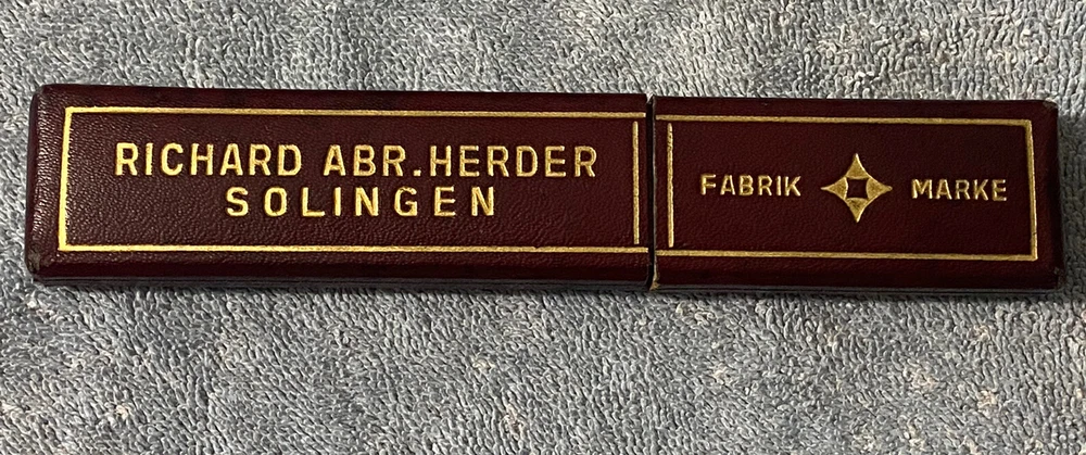 Vintage RICHARD ABR. HERDER SOLINGEN GERMANY Straight Razor Fabrik Marke. The knife is in good condition. The case is very nice too. Something like tissue or something is inside the box so I can’t close the case over the knife all the way. You can get it out as I don’t want to dame the box getting it out. Fast free shipping. I will ship either fed ex or usps ground. Location: 1-M clear bin
