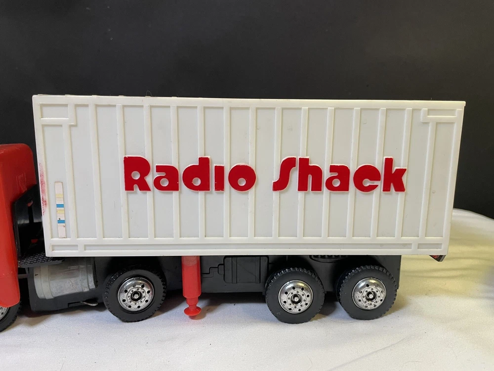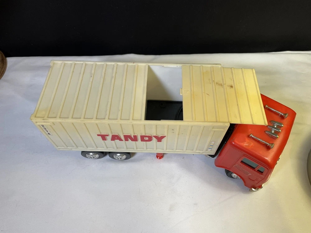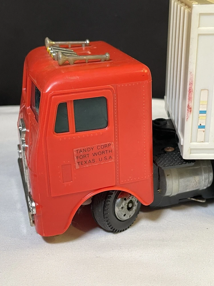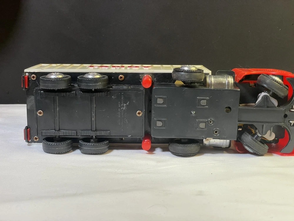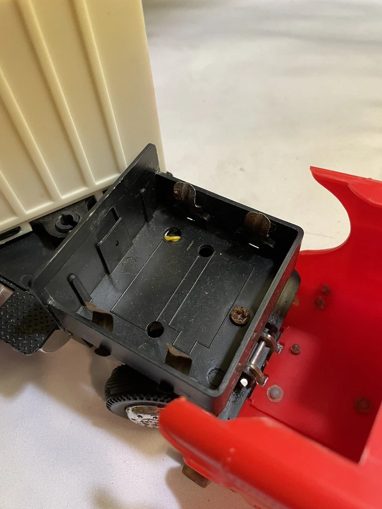 This powers on when batteries are inserted- the powered wheel needs lubrication/attention, no track to test it on and has minimal movement. Track is not included, see picture details for condition info. All aspects of the truck are present.
