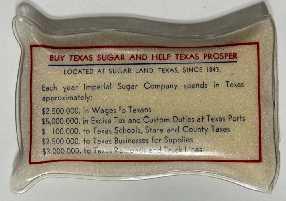 Vintage and Very Rare : Imperial Sugar Company Advertising / Customer giveaway " Sack of Sugar Paperweight dated 1955 " Size: 3x5x1 Condition : Used , some wear and aging but colors and advertising still bright and bold and legible. NOTE : the Plastic & Sugar are still pliable inside and the Bag has very slight tackiness due to age of the plastic (69 years) , but still in excellent condition. Date : 1955 / Adverting its " 112th year and marking the15th Billionth pound of Sugar produced. The rear has other stats , facts and information . Comment on rarity : I've collected several Imperial Sugar pieces of advertising for quite sometime and I've never seen anything like, I've had this in my collection for 20+ years. All sales are final No returns Questions please email Shipping USPS Thank you for your interest