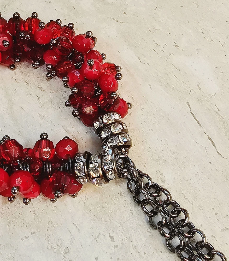 This vintage eye-catching necklace features a sparkly bold red beaded design with an adjustable chain for a customizable fit, suitable for various occasions. • Adjustable chain length • Lobster clasp closure • Multicolor red beads • Statement piece 16 to 19 inches