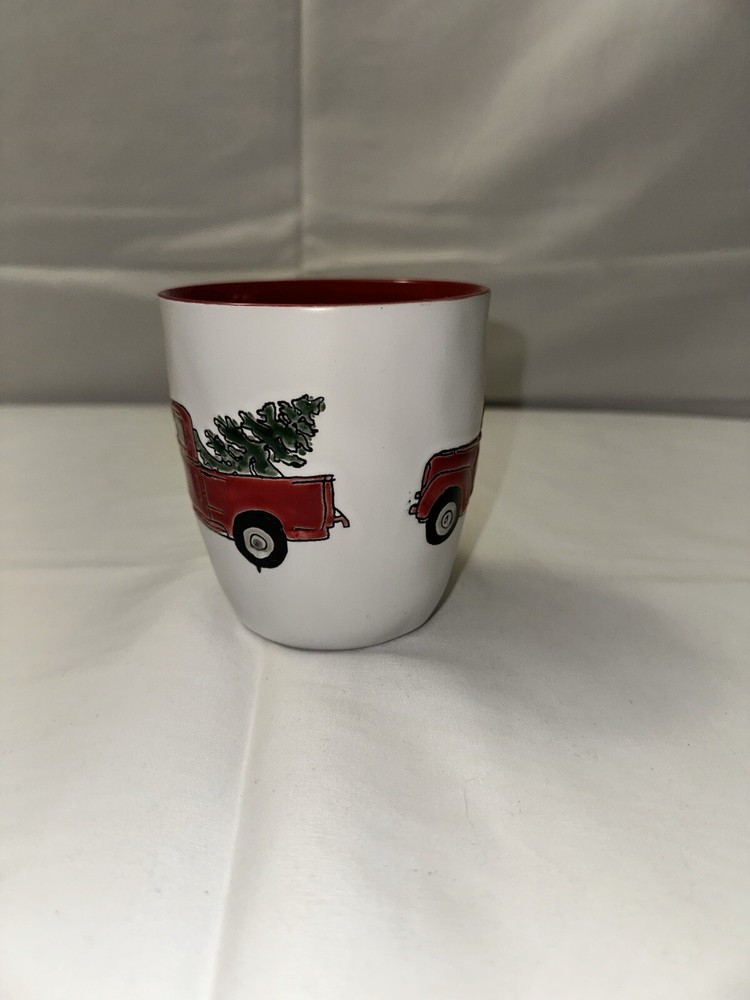 This rare SPECTRUM Designz mug features an old glazed red truck carrying a Christmas tree, perfect for the 2018 holiday season. The mug is made of ceramic and porcelain in vibrant red color, suitable for both hot and cold beverages. It is a collector's item from the 2010-2019 period, depicting a festive and nostalgic design that is sure to be enjoyed by any unisex adult who appreciates unique mugs for their collection.