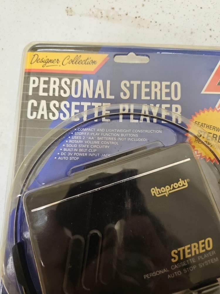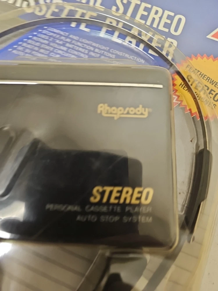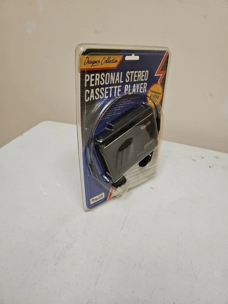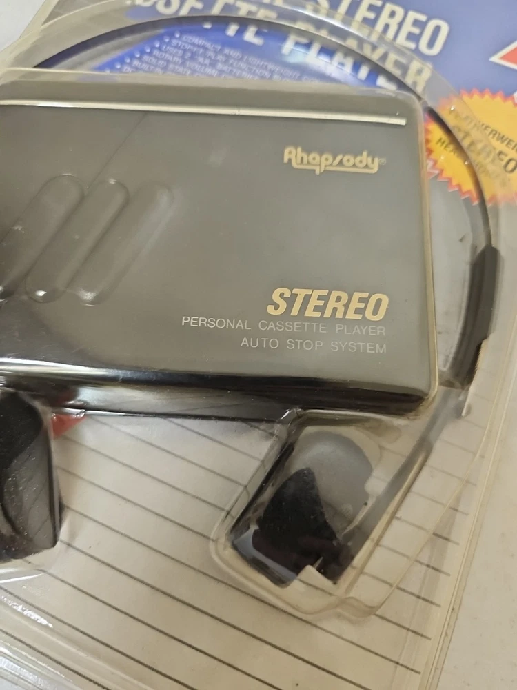 This vintage Rhapsody portable cassette player is perfect for those who love the classic sound of cassette tapes. It features an AM/FM band and a headphone jack for easy listening on the go. The unit is in great shape and ready to use. With its sleek black color and compact design, this cassette player is perfect for any music lover. It comes with an auto stop system and a DC 3V power input jack for easy operation. This unit is a must-have for any collector or music enthusiast who wants to experience the nostalgia of classic music.