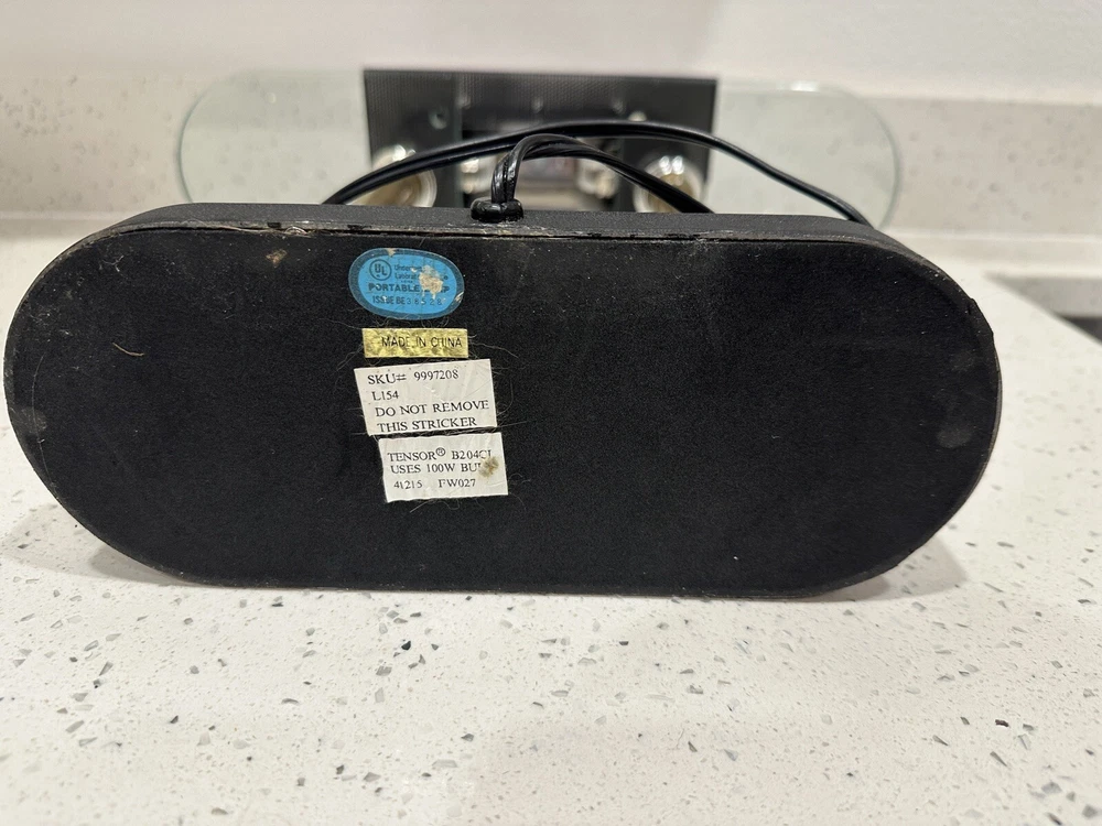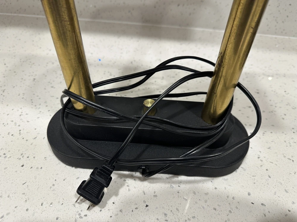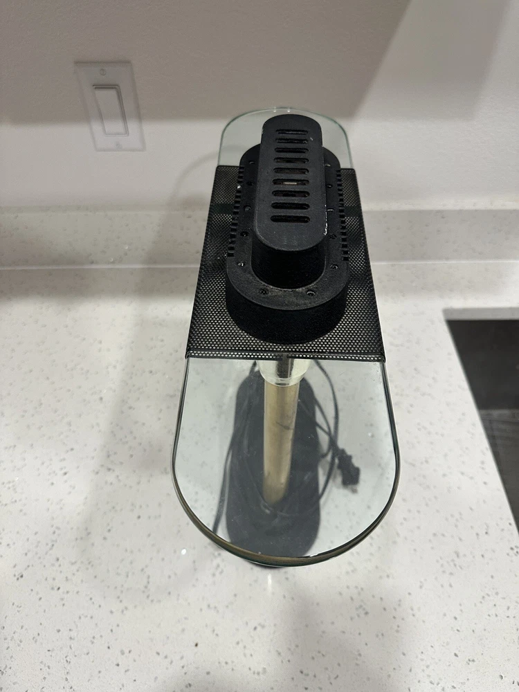 This vintage Robert Sonneman desk lamp is a unique addition to any collection. With a funky, shaded design and a glossy finish, it's sure to catch the eye of anyone who sees it. The lamp is made of brass, glass, and metal, and features a black cord and a knob control. Lamp is sold for parts only, no bulb. Please see all pictures and angles before purchase. Sold as is