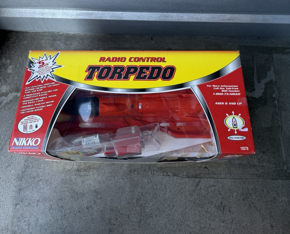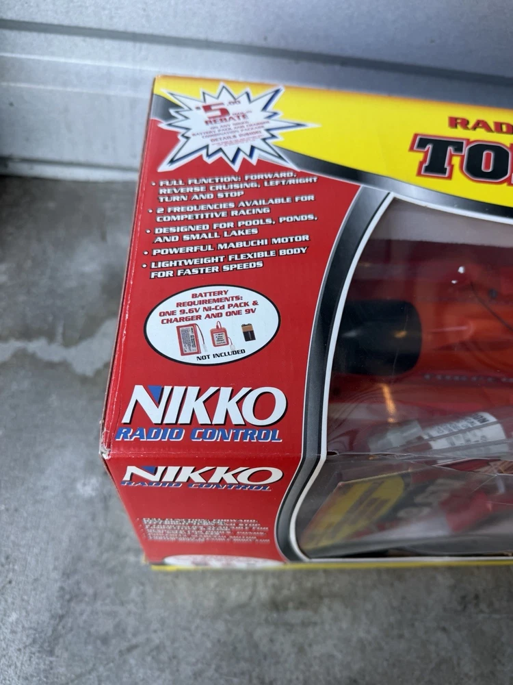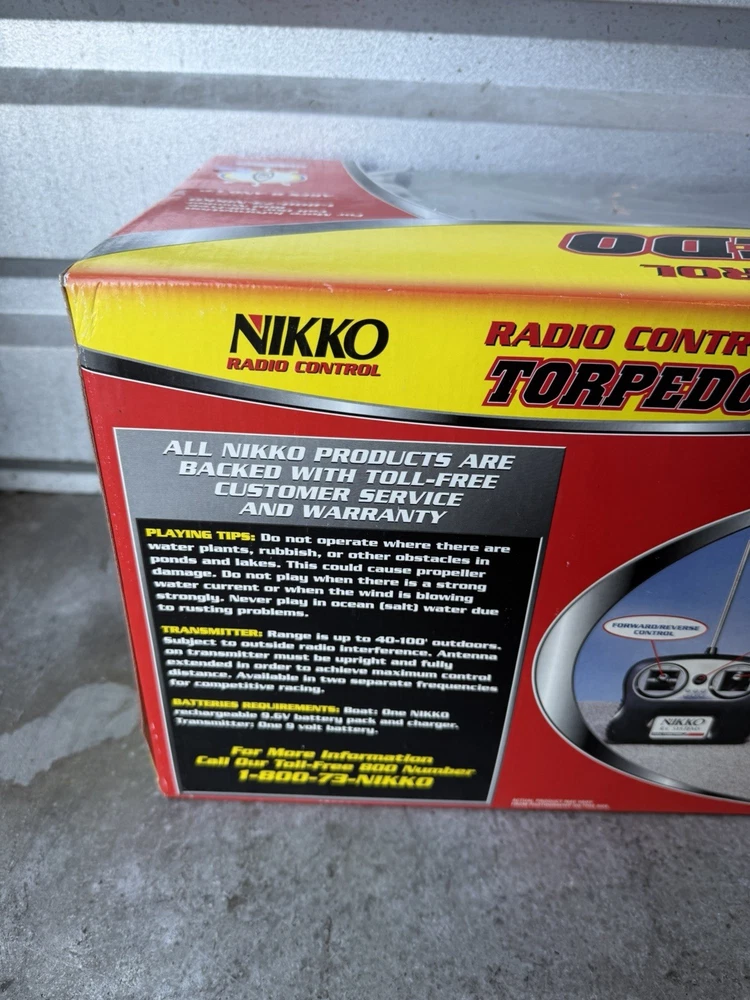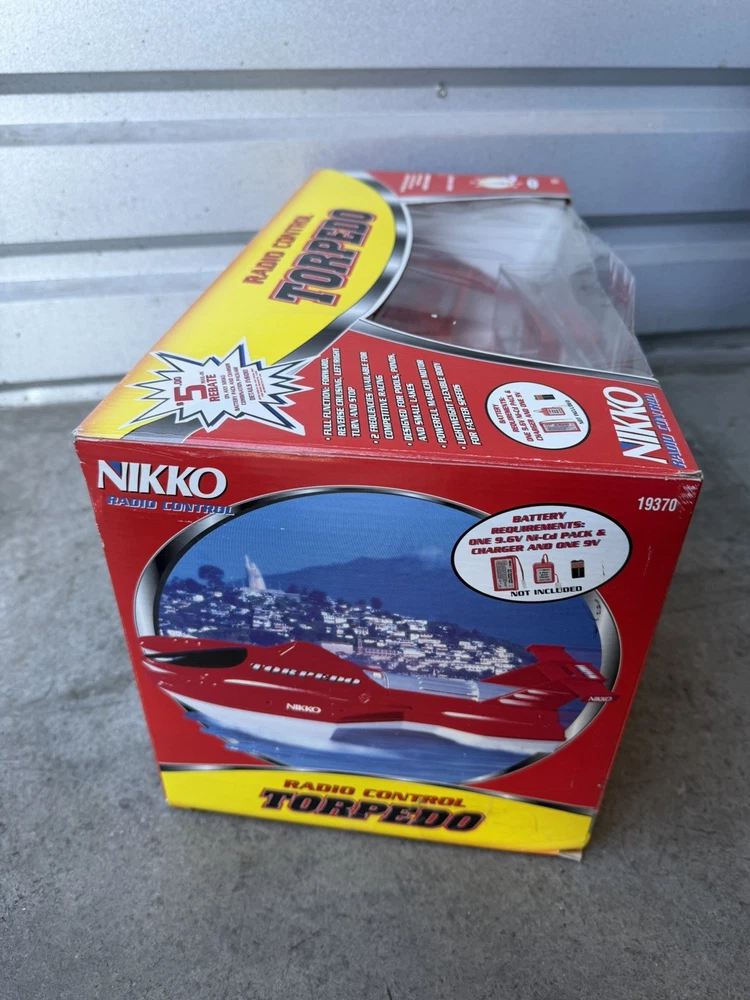 1. Brand: NIKKO 2. Item Description: Vintage SEALED NEW Styrofoam NIKKO Torpedo Hydroplane RC Racing Boat 49MHz 3. Condition: The package is factory sealed condition. There is no sign of tempering on the sealed tape on the package. This package is 100% brand new from the manufacturer. The photos are taken on actual item on sale. 4. Color: 5. Included Items: A. Included: Comes in original packaging B. Not Included: Nothing Missing 6. Suggested Retail Price: 7. Product Features: