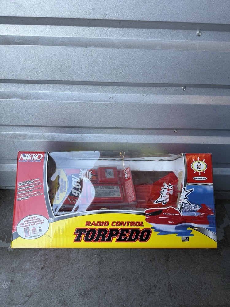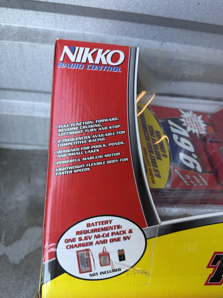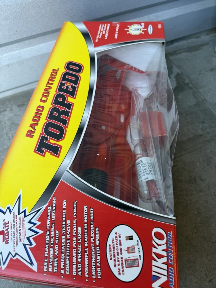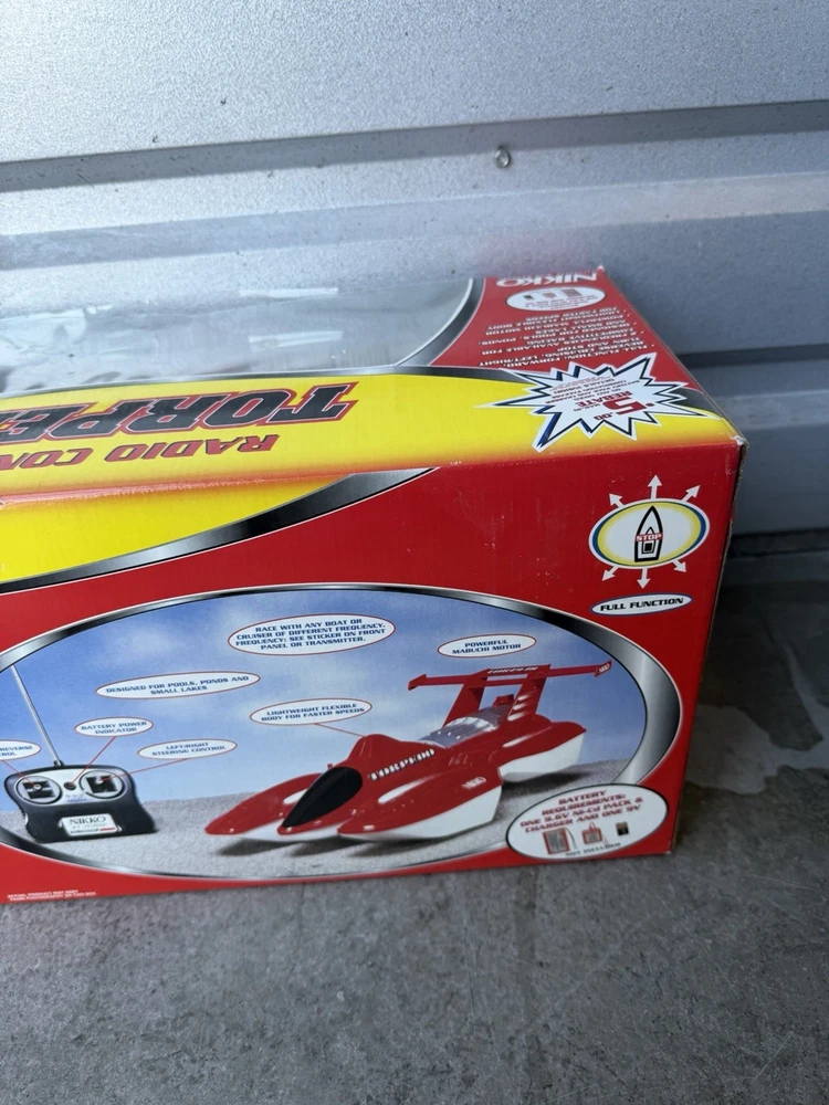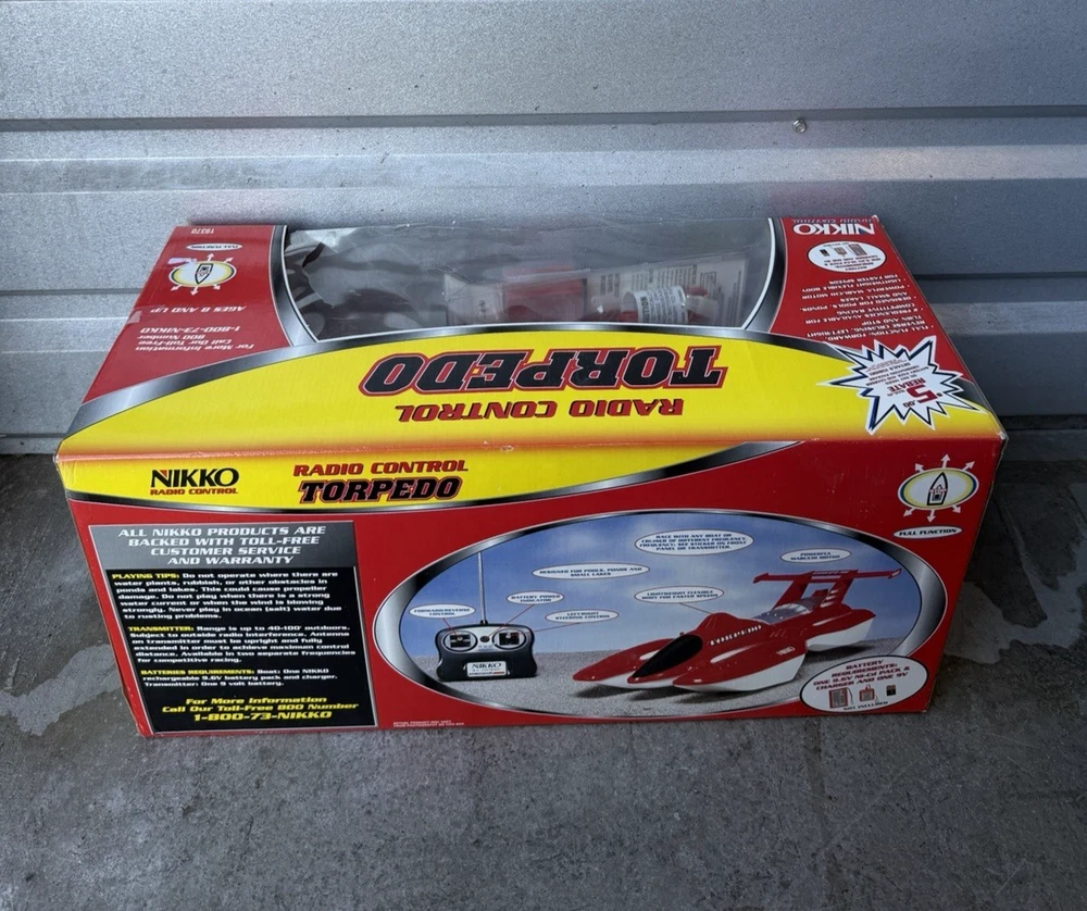 1. Brand: NIKKO 2. Item Description: Vintage SEALED NEW Styrofoam NIKKO Torpedo Hydroplane RC Racing Boat 49MHz 3. Condition: The package is factory sealed condition. There is no sign of tempering on the sealed tape on the package. This package is 100% brand new from the manufacturer. The photos are taken on actual item on sale. 4. Color: 5. Included Items: A. Included: Comes in original packaging B. Not Included: Nothing Missing 6. Suggested Retail Price: 7. Product Features: