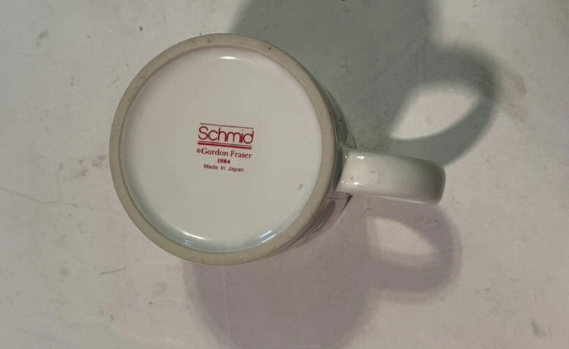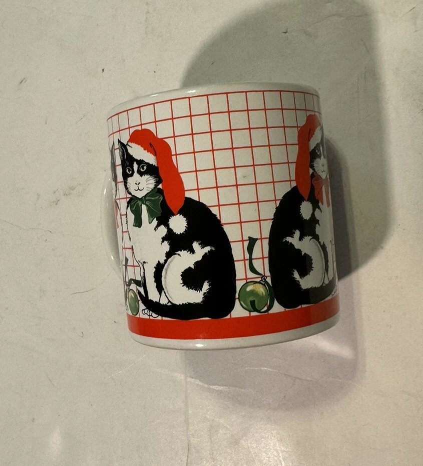 This vintage Schmid Gordon Fraser mug is perfect for any Christmas lover! Featuring an embossed design of a black and white tuxedo cat in a festive holiday scene, this mug is sure to bring cheer to your morning cup of coffee or tea. The medium-sized ceramic and porcelain mug can hold up to 8oz of your favorite hot or cold beverage, and comes with a handle for easy holding. It is an original piece from 1984, with the Schmid brand and model name inscribed at the bottom. The mug comes in its original box, making it a great gift for any animal or Christmas enthusiast.