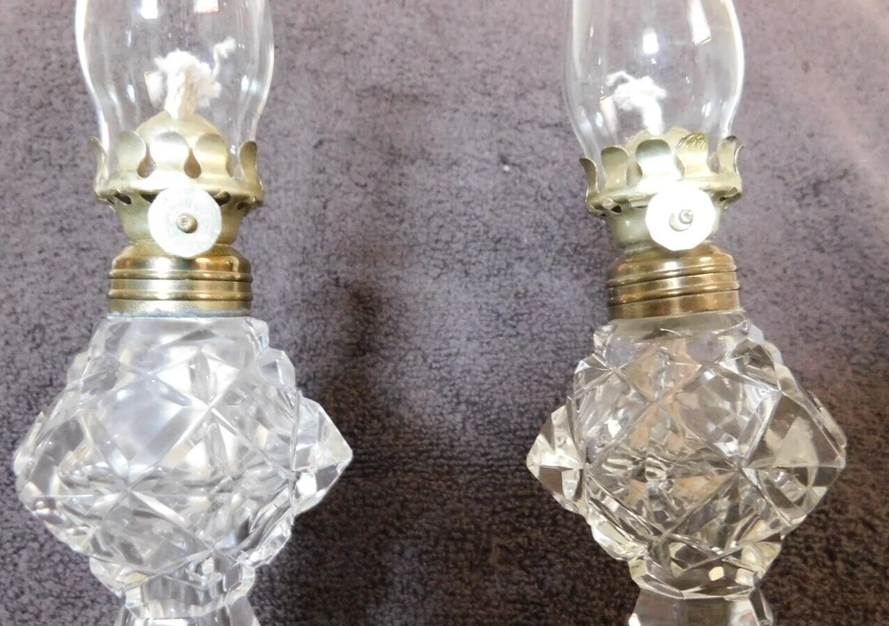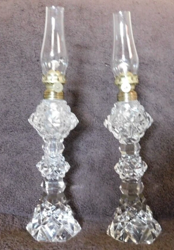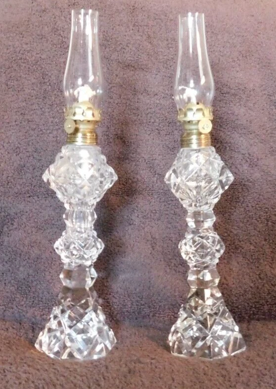 Vintage Set of 2 Exquisite Kerosene Oil Mantel Lamps All in great shape, very clean,no chips or cracks,believe to be from the 1930's. Cut glass could be crystal, wicks are new looks like they were never used. Mantel Lamps,They are very thin and bold looking. Bottoms are all solid. Great Collector's item. Great Art Decor., Found in UpState New York. Pieces are about 12 inches Tall; Thank you for Looking! Most of my items are antique or vintage ,all are found in UpState , New York, all are found in homes of senior's that ae downsizing or just moving on and can not take all the treasures they have collected over the years. Happy Shopping!
