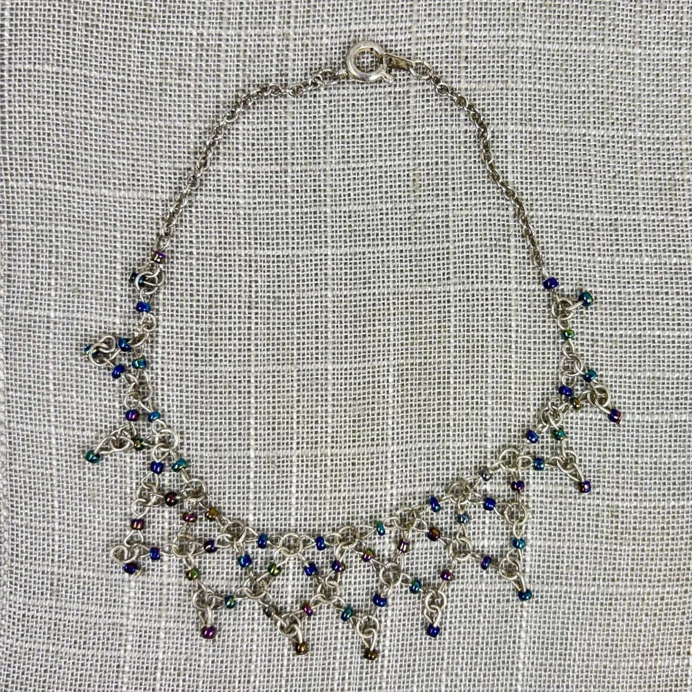 Vintage Silver Tone Iridescent Seed Bead Diamond Weave Dangle Anklet 9.5" Great condition! The silver tone finish is intact and bright, and the iridescent seed beads are shimmery. The clasp works as it should. Please see all pictures for details and message me with any questions.