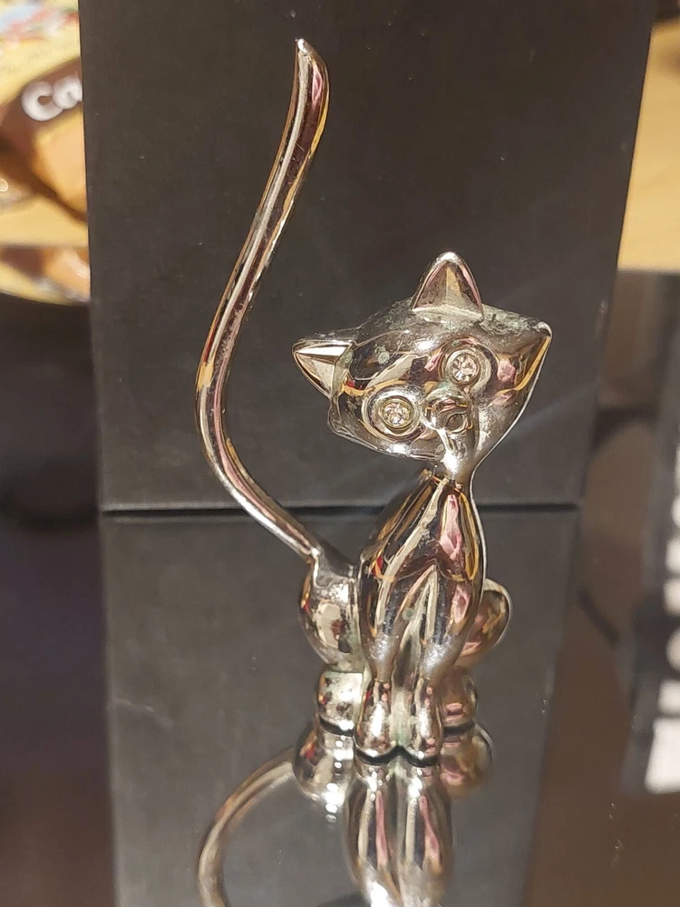 Vintage Small Adorable Vintage Shiny Brass Cat Figurine with Tail Up CZ Eyes