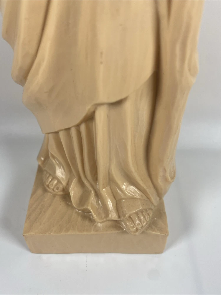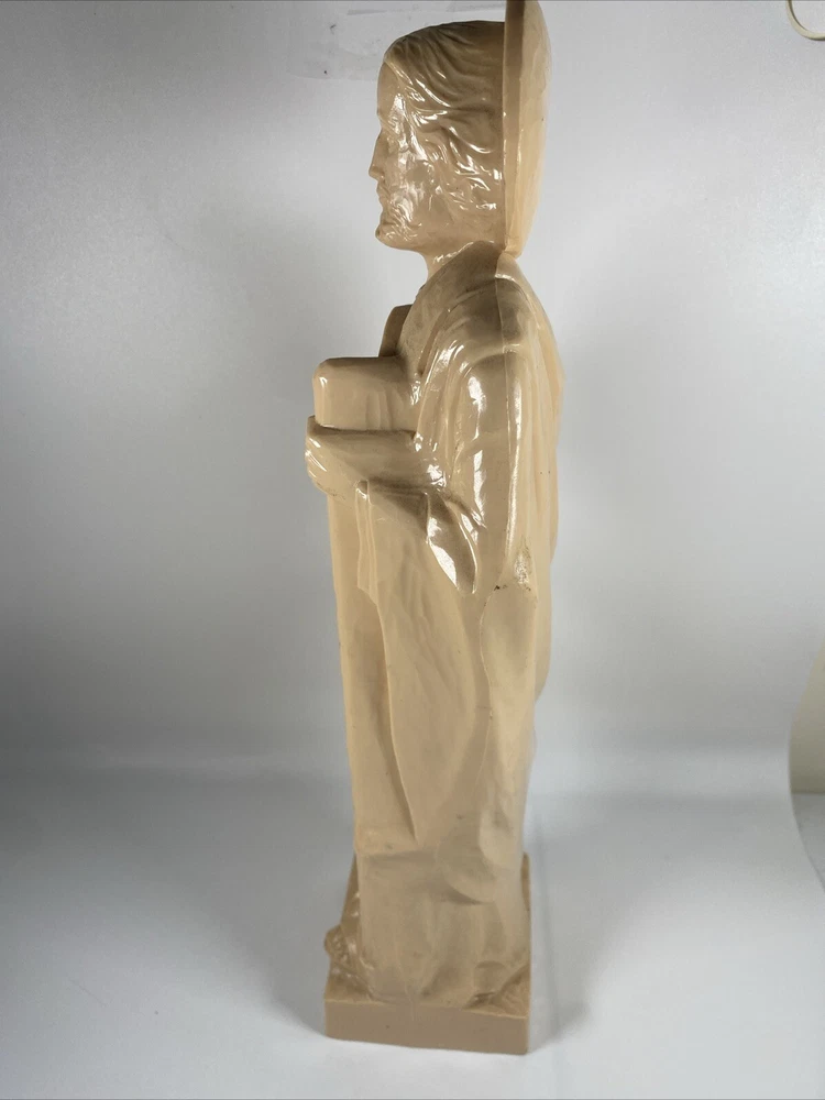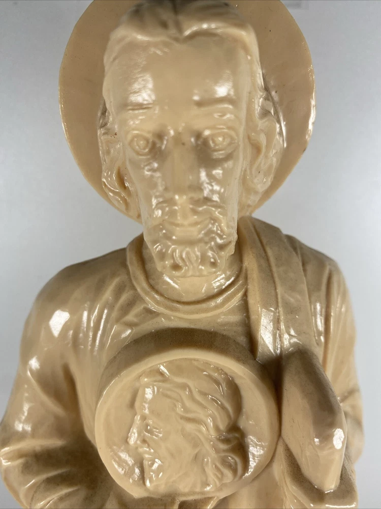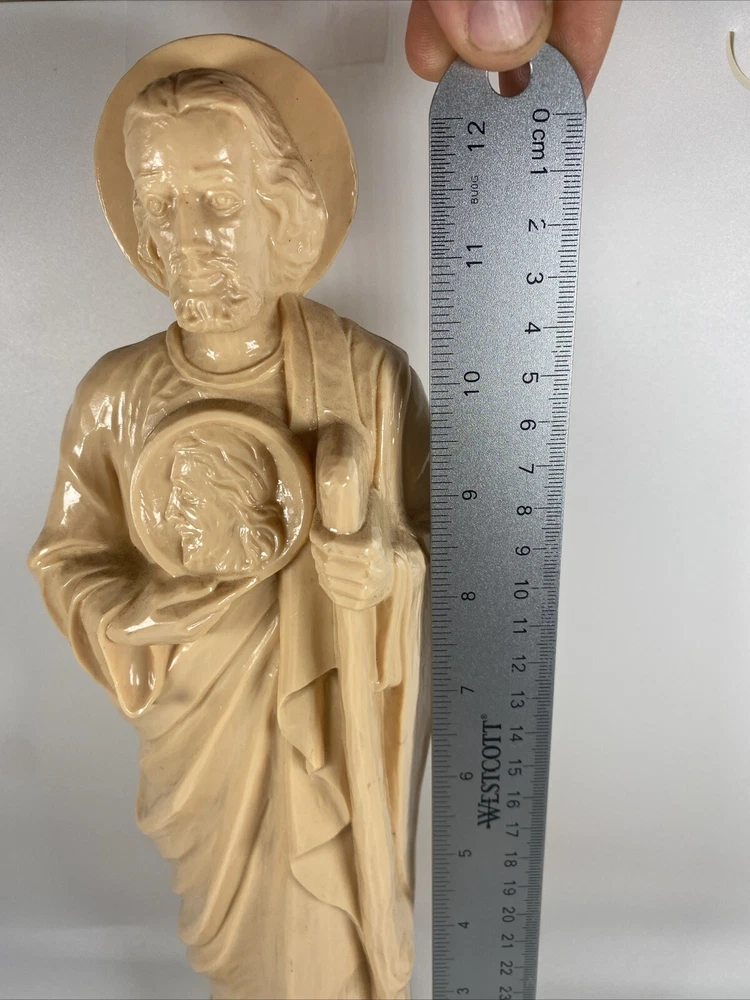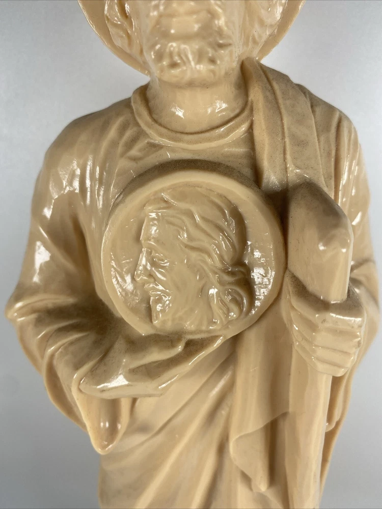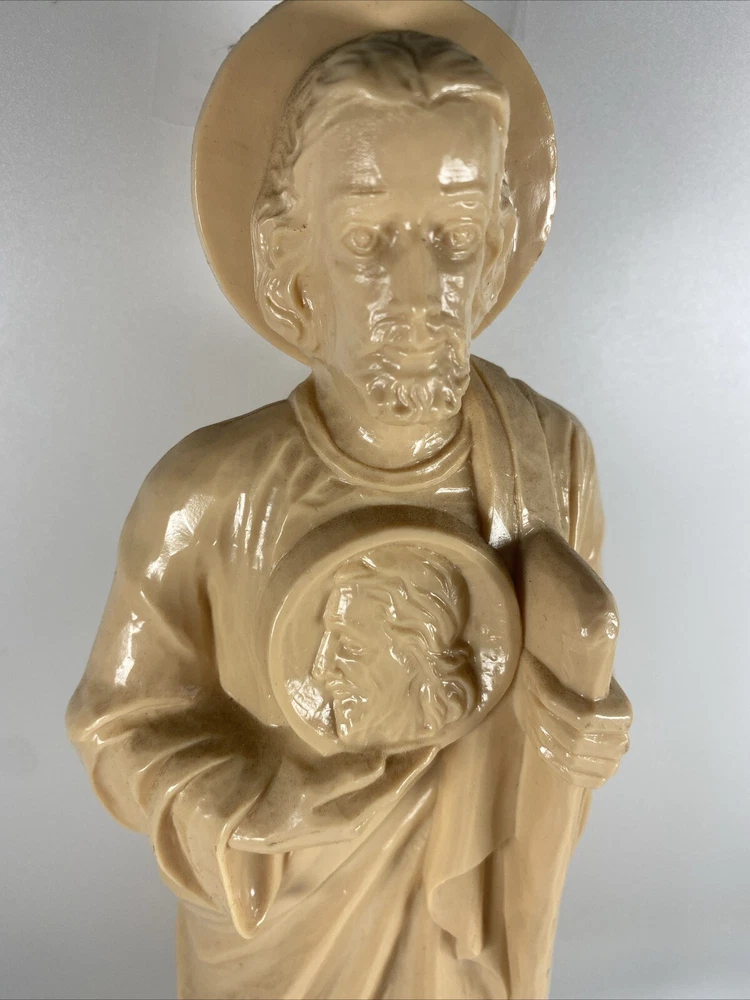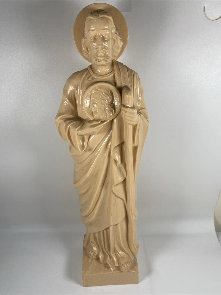 This vintage St. Jude Thaddeus religious statue is a beautiful addition to any collection. Measuring at 13 inches, it features a detailed depiction of the patron saint of desperate cases and lost causes, along with a Jesus icon figure. Made of hard plastic by Hartland Plastic, this collectible is perfect for those interested in Christianity and spirituality. The unit type is a single unit, and it comes from an unknown country/region of manufacture. This statue is a great way to show off your faith and add a touch of vintage charm to your home decor.