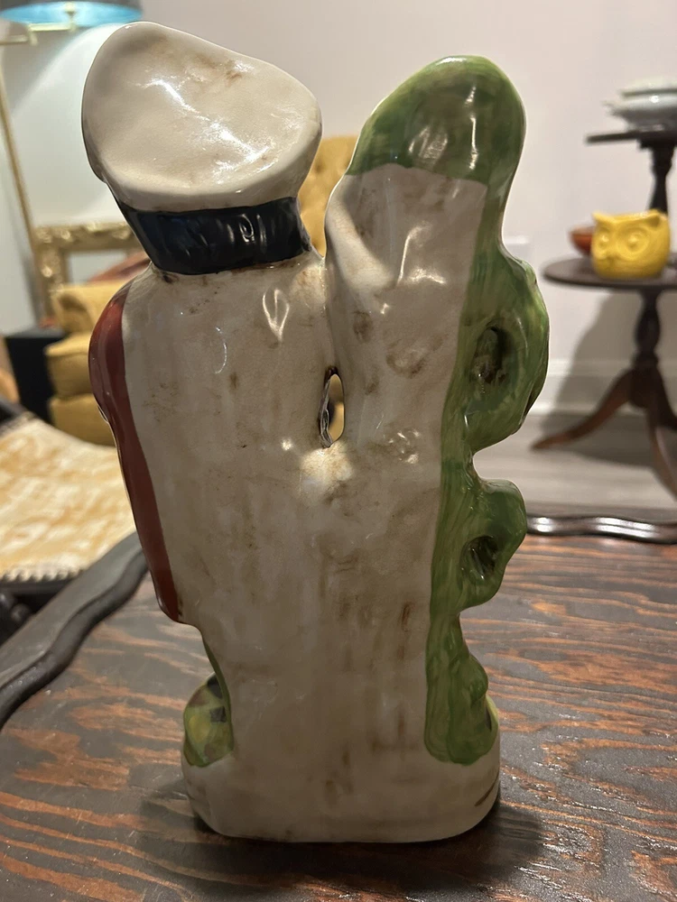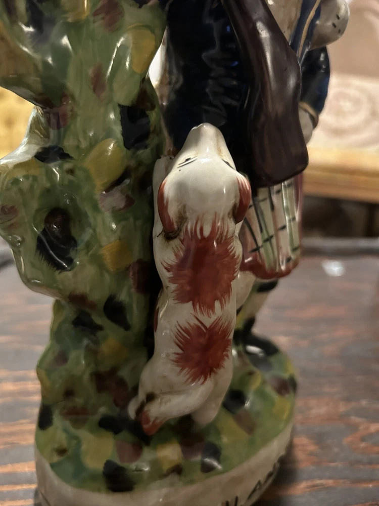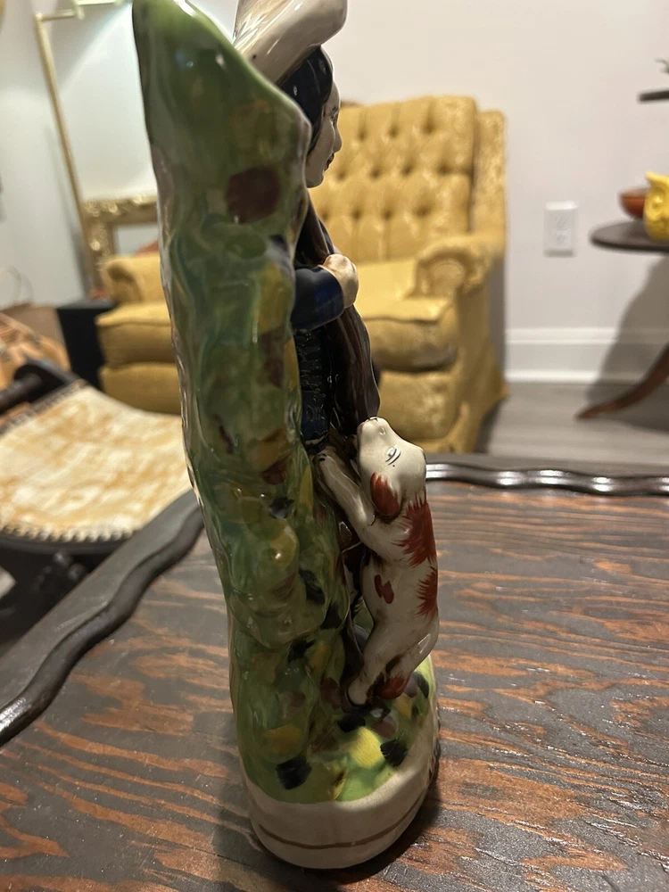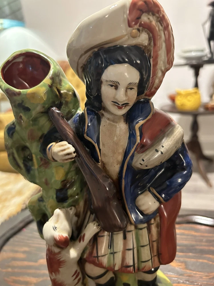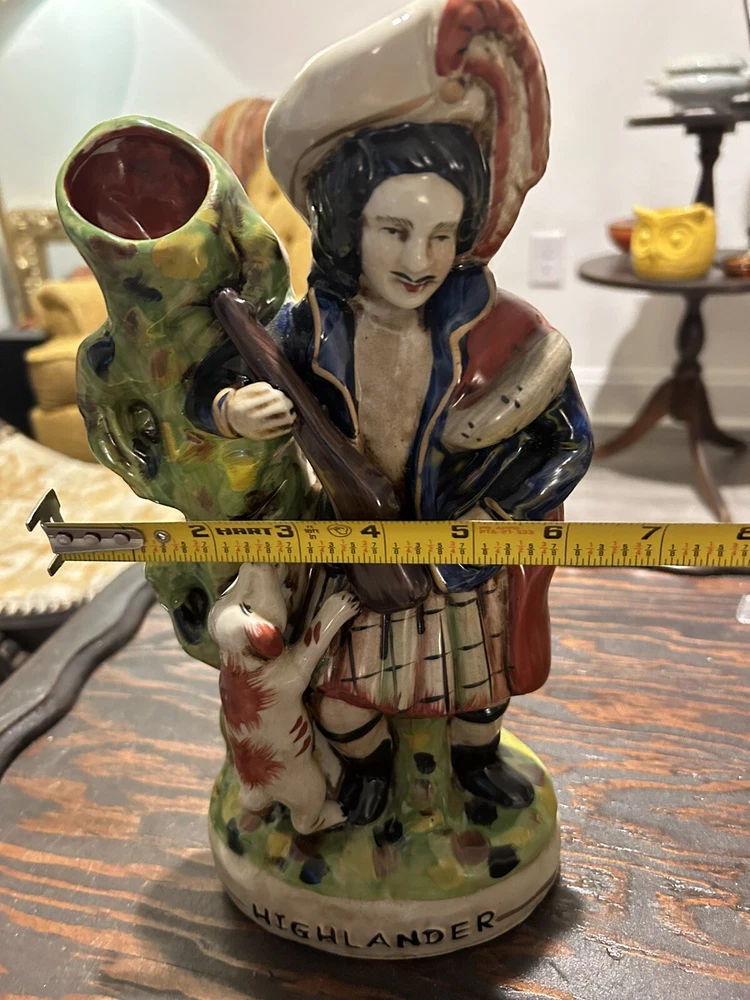 This vintage Staffordshire spill vase figurine is a stunning piece of art featuring a Highlander Hunter, his rifle, and his loyal hunting dog. Made of high-quality ceramic material, this medium-sized vase is handcrafted with Old English style and a glossy finish, making it a perfect addition to any collection or decorative display. The multicolor design and intricate details of this antique match holder/spill vase are sure to impress any art enthusiast. To keep it clean and well-maintained, simply use a damp cloth. This unique piece is ideal for collectors who appreciate hunting and hunting dog themes.