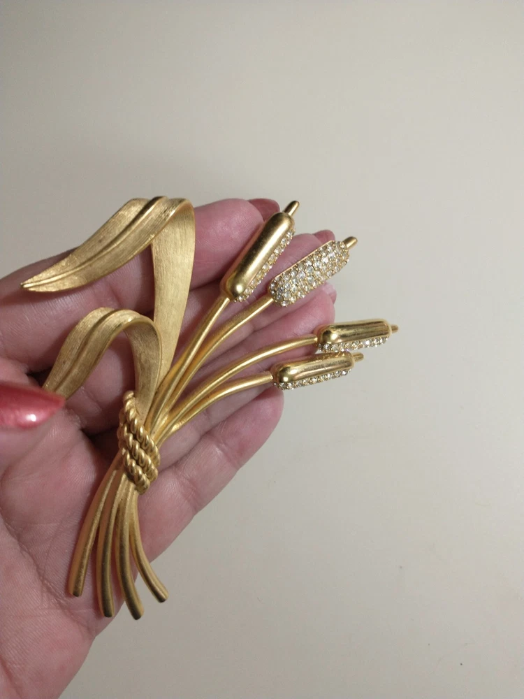 Please see images for size and condition description. Beautiful Swarovski brushed gold-plated matte cattail brooch w sparkling clear crystals. No loose or missing stones. No verdigris. Pin clasp is in good working order. Swan logo present. Definitely a statement piece that is 4 inches long. As is. Thanks! FREE SHIPPING!