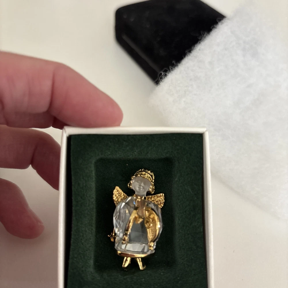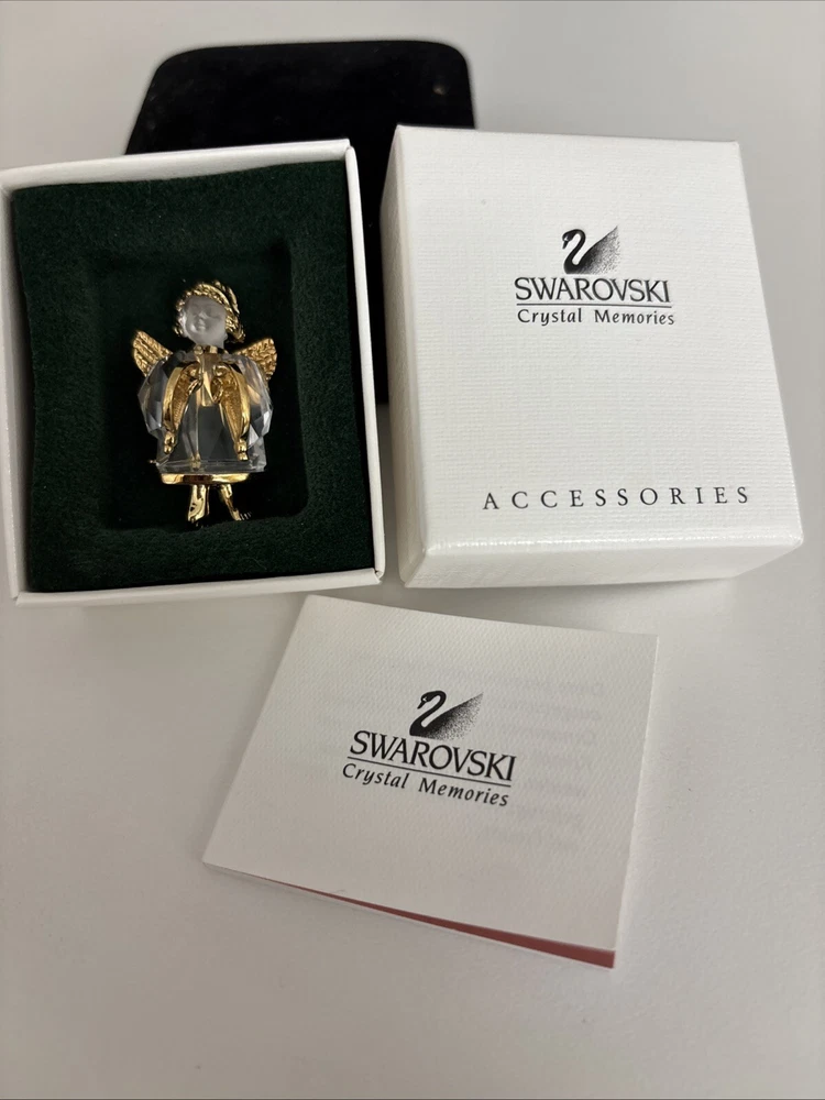 This vintage Swarovski Crystal Angel pin brooch features a dazzling crystal design. The brooch is adorned with an angel theme, making it a charming and elegant accessory. Perfect for collectors or those who appreciate vintage jewelry. All original box & paperwork included.