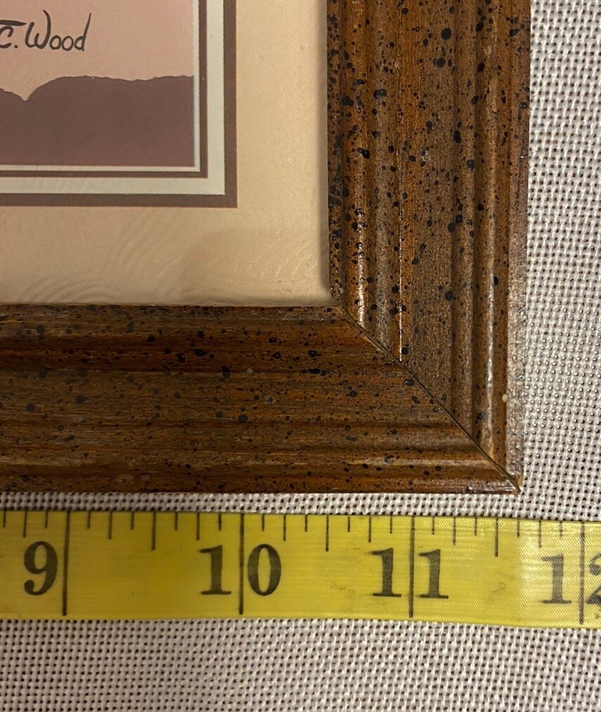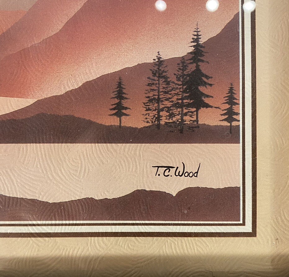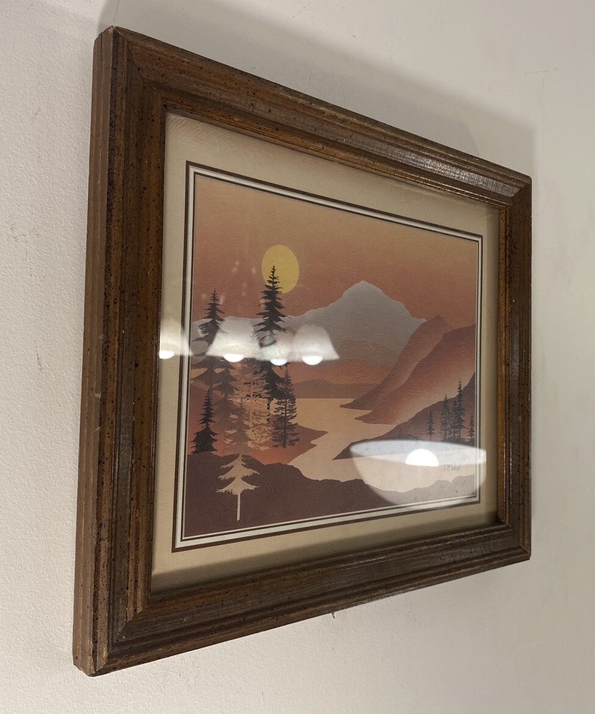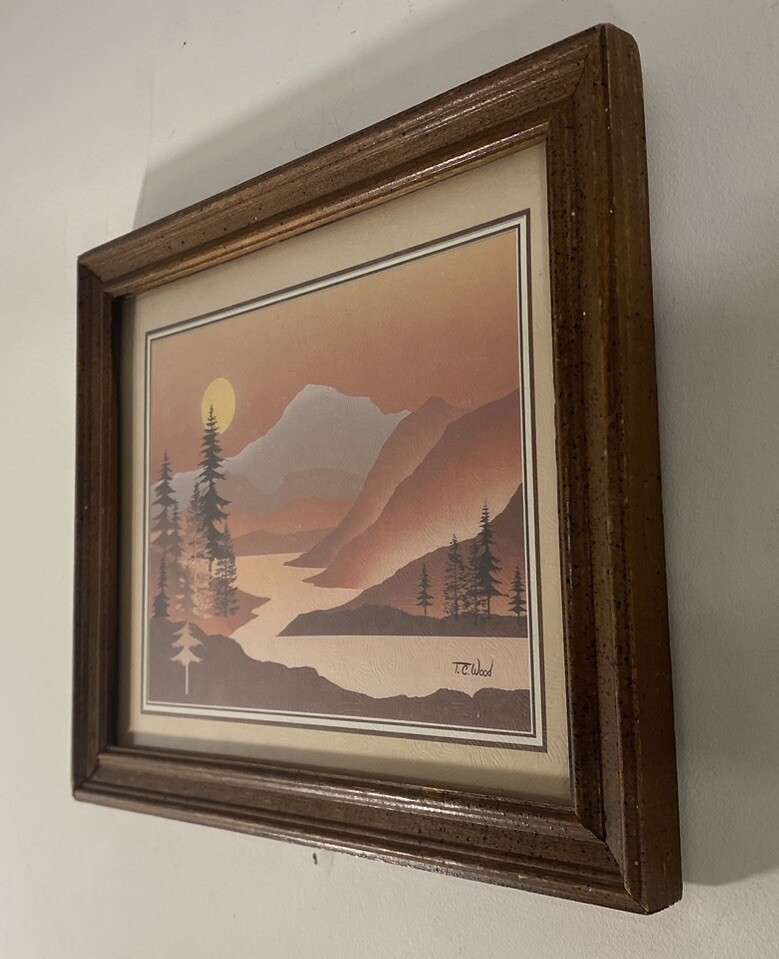 TC WOOD landscape print modernist framed under glass mountain trees moon Used, vintage, very nice shape, no issues Q) for inventory purposes only