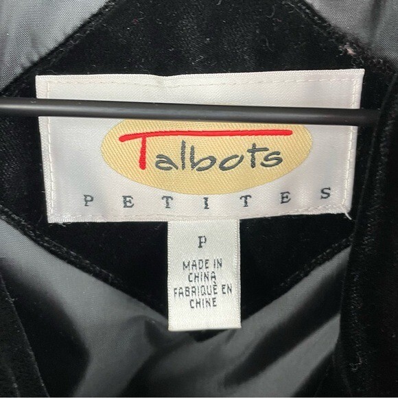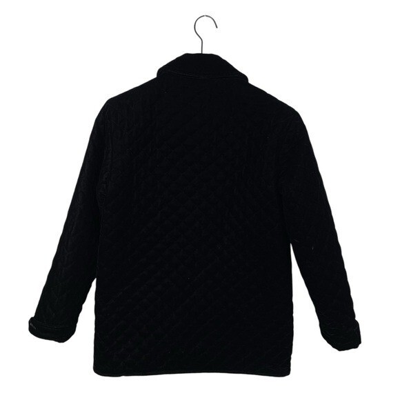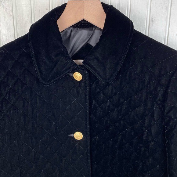 Vintage Talbots Petites Black Velvet Quilted Jacket Gold Buttons The perfect classic, sophisticated look for this winter Quilted black velvet with gold buttons down the front Collared Long sleeves with wrist cuffs Mid-length Lined Size P Very good pre-owned condition Approximate measurements: Pit to pit: 19” Length from shoulder: 29”