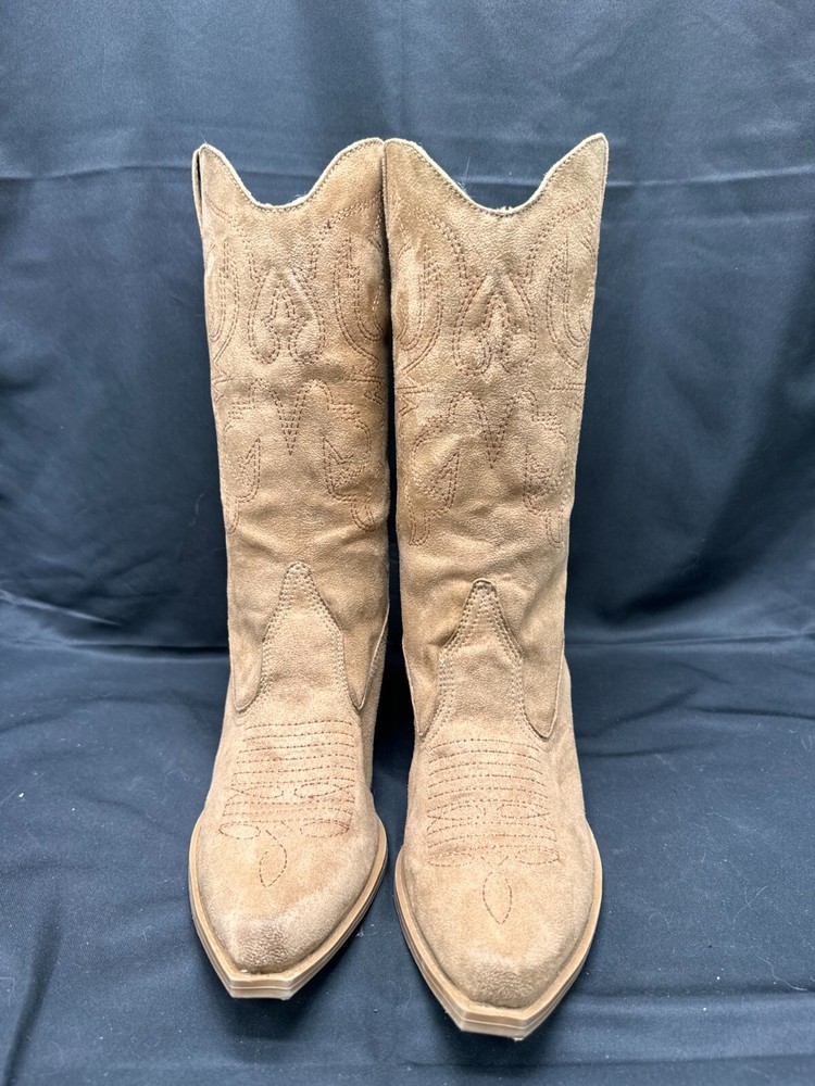 Vintage Splash Tan Western Faux Suede Heeled Cowgirl Boots Size 5 Step out in style with these vintage Splash cowgirl boots in a beautiful tan color. Made with high-quality faux suede, these boots are perfect for any Western-themed event or casual day out. With a comfortable heel and size 5 fit, they are designed for women who want to look and feel great. The boots feature a classic Western style and are perfect for pairing with any cowgirl outfit or jeans. Get ready to ride the range in style with these stunning Splash boots.