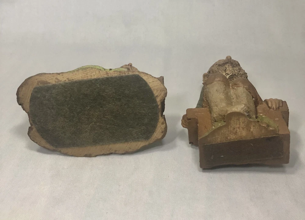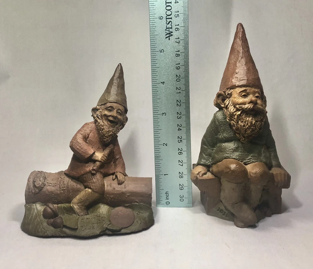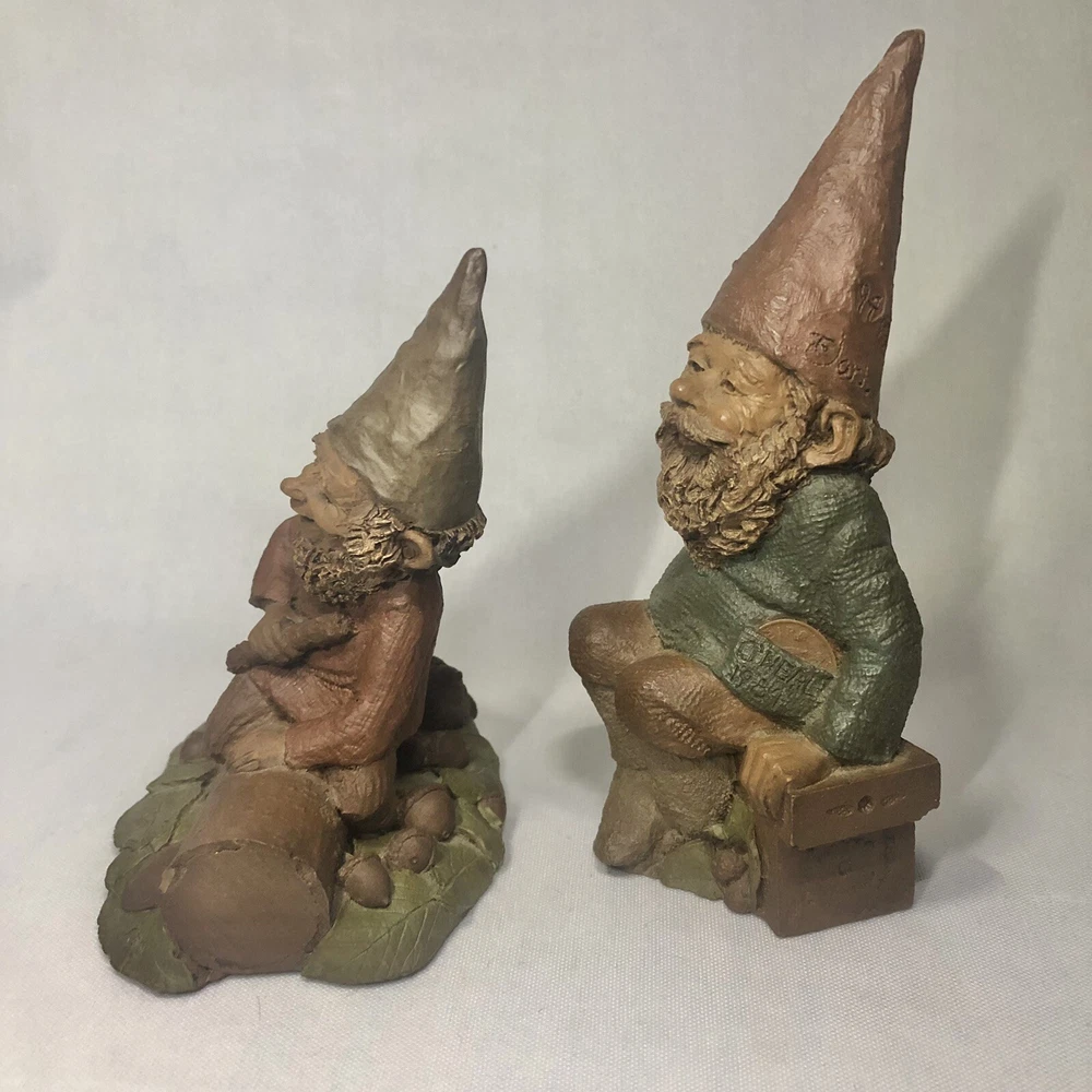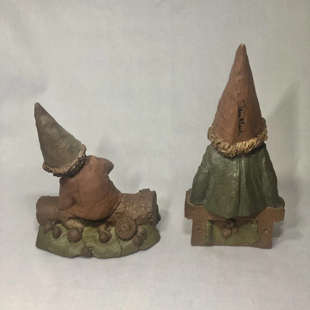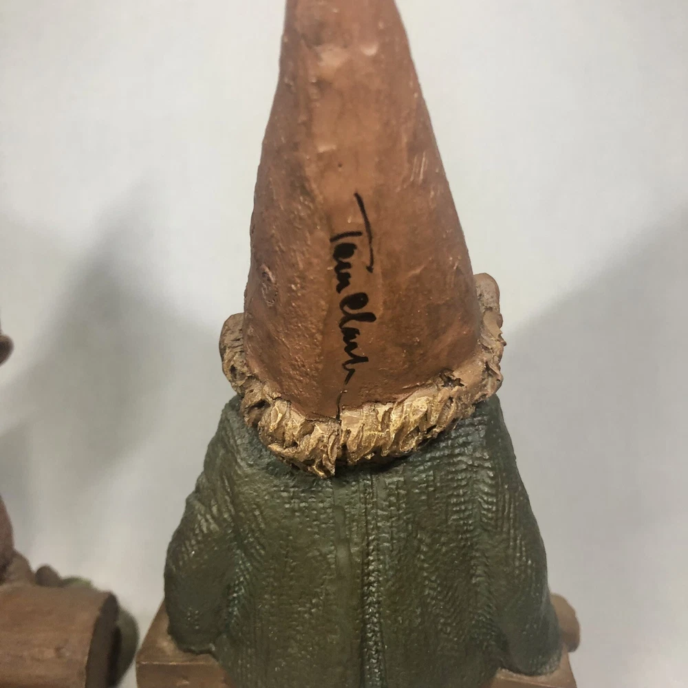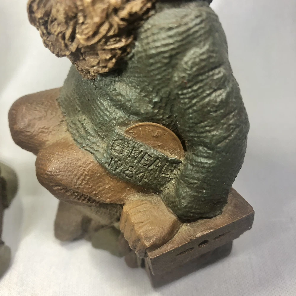 These are two adorably kitschy gnomes molded from pecan shell resin and hand painted, stamped, and signed by Tom Clark. All of his gnomes have been retired since 2011 and are quite collectible. Each gnome has a real coin attached somewhere in the mold. Each gnome has its own story right down to its zodiac sign and the coin adds to their stories, but unfortunately I don’t have the cards that told the stories. They are named as well. The one on the log is Eenie, with the name and Tom’s signature inscribed next to the coin. The one on the bench is O’Neal, with name and date on his pocket that the coin is in. This one also has the number 1019 under his foot and the year ‘94 with Tom’s inscribed signature on his hat, as well as Tom’s full penned signature. These little garden gnomes don’t actually do well outside in the garden and are best displayed indoors so as to keep the paint intact. They both show very minor wear and age. No chips or cracks.