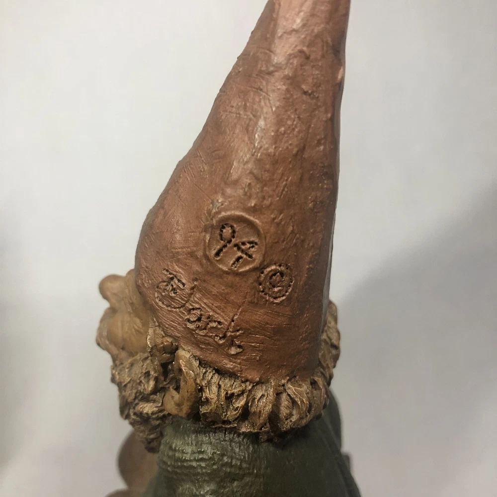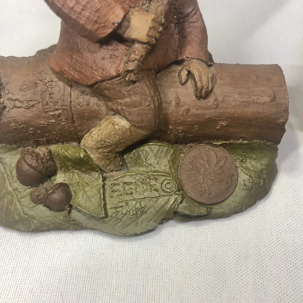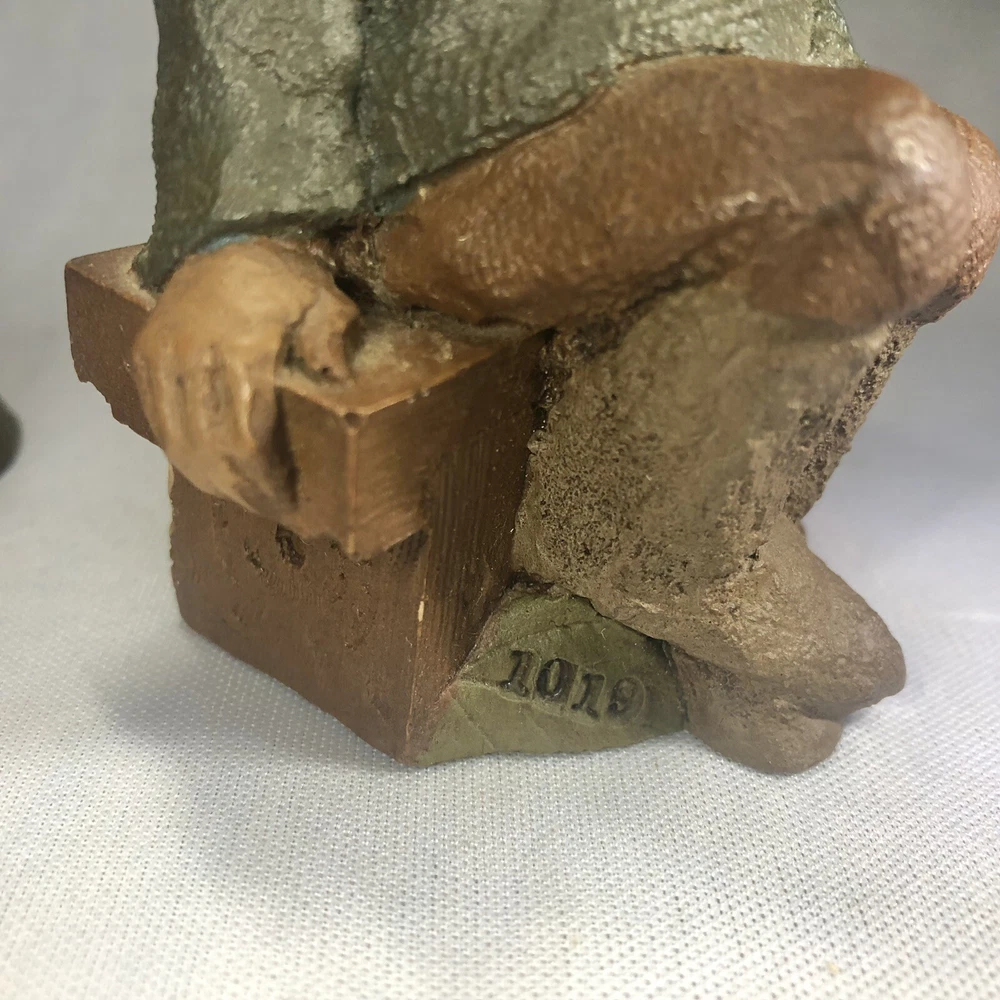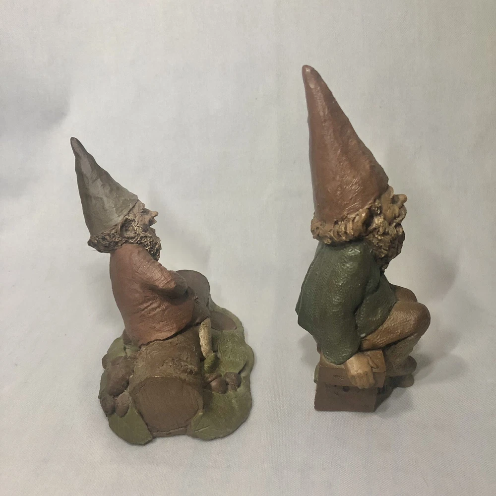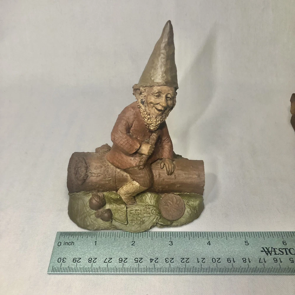 These are two adorably kitschy gnomes molded from pecan shell resin and hand painted, stamped, and signed by Tom Clark. All of his gnomes have been retired since 2011 and are quite collectible. Each gnome has a real coin attached somewhere in the mold. Each gnome has its own story right down to its zodiac sign and the coin adds to their stories, but unfortunately I don’t have the cards that told the stories. They are named as well. The one on the log is Eenie, with the name and Tom’s signature inscribed next to the coin. The one on the bench is O’Neal, with name and date on his pocket that the coin is in. This one also has the number 1019 under his foot and the year ‘94 with Tom’s inscribed signature on his hat, as well as Tom’s full penned signature. These little garden gnomes don’t actually do well outside in the garden and are best displayed indoors so as to keep the paint intact. They both show very minor wear and age. No chips or cracks.
