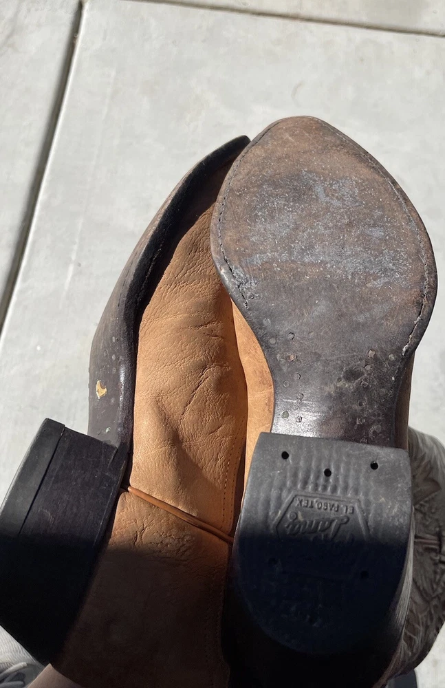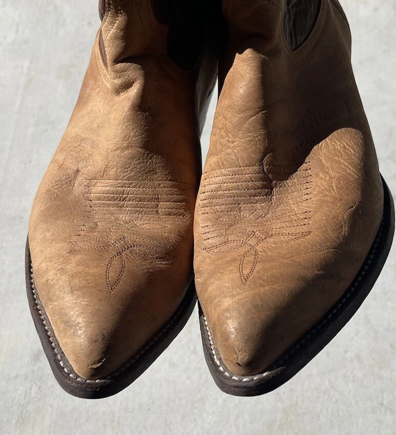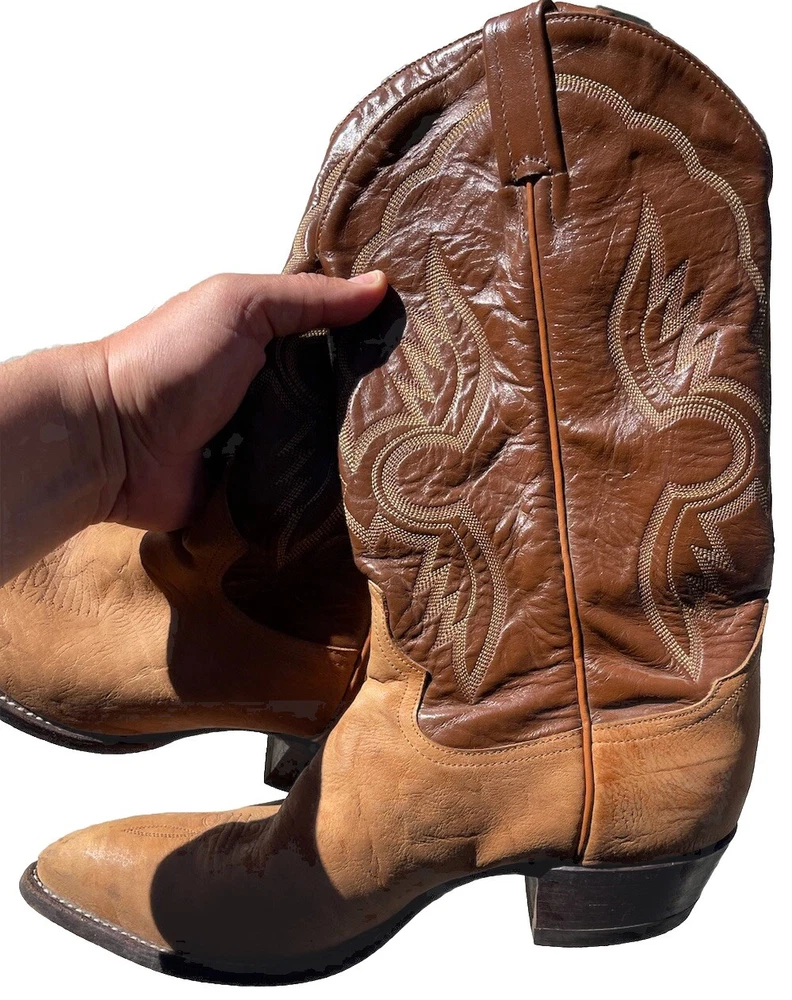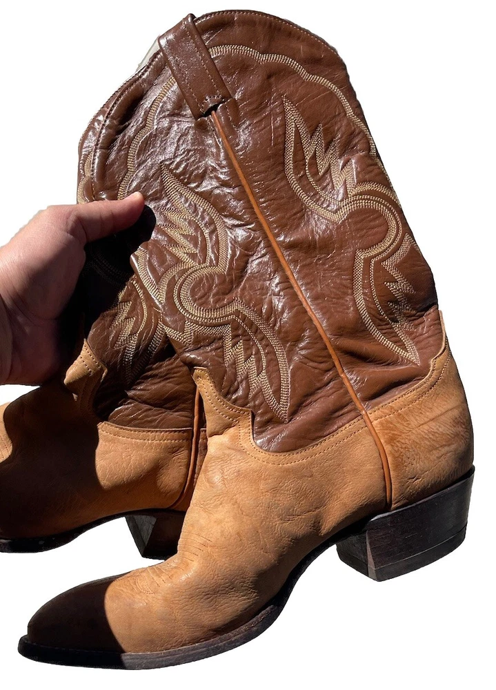 These vintage Tony Lama leather cowboy boots are a true gem for any western enthusiast. The dark brown and tan color combination, along with the men's size 9 fit, make them a perfect addition to any cowboy's wardrobe. The boots' outsole and upper material are both made of high-quality leather, ensuring both durability and style. The boots' brand, department, type, and model are all Tony Lama, men's, boots, and 1980s respectively. Their style is western, with a cowboy theme, and they were manufactured in the United States. These boots are perfect for anyone looking to add a touch of vintage style to their wardrobe.