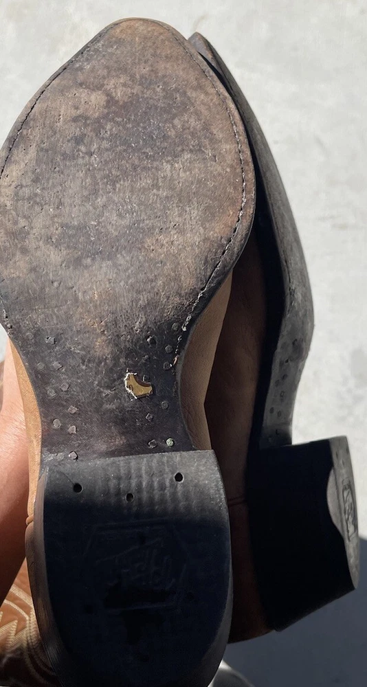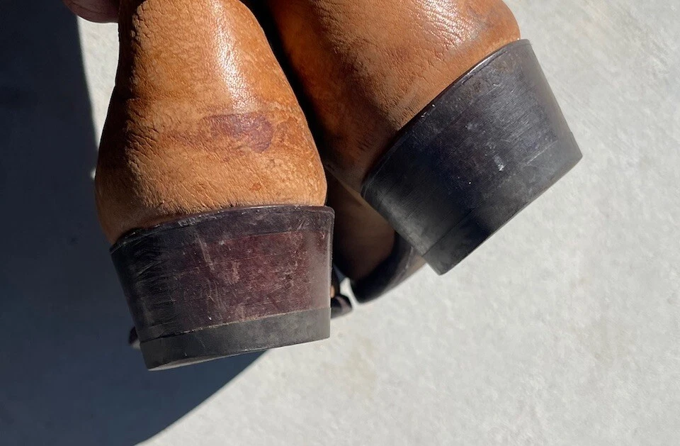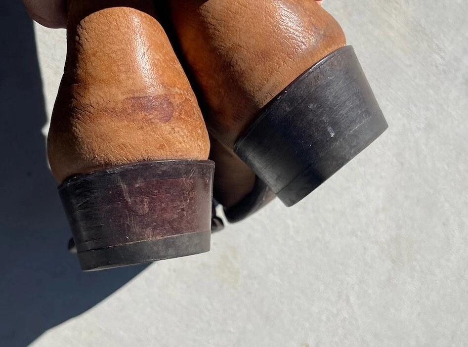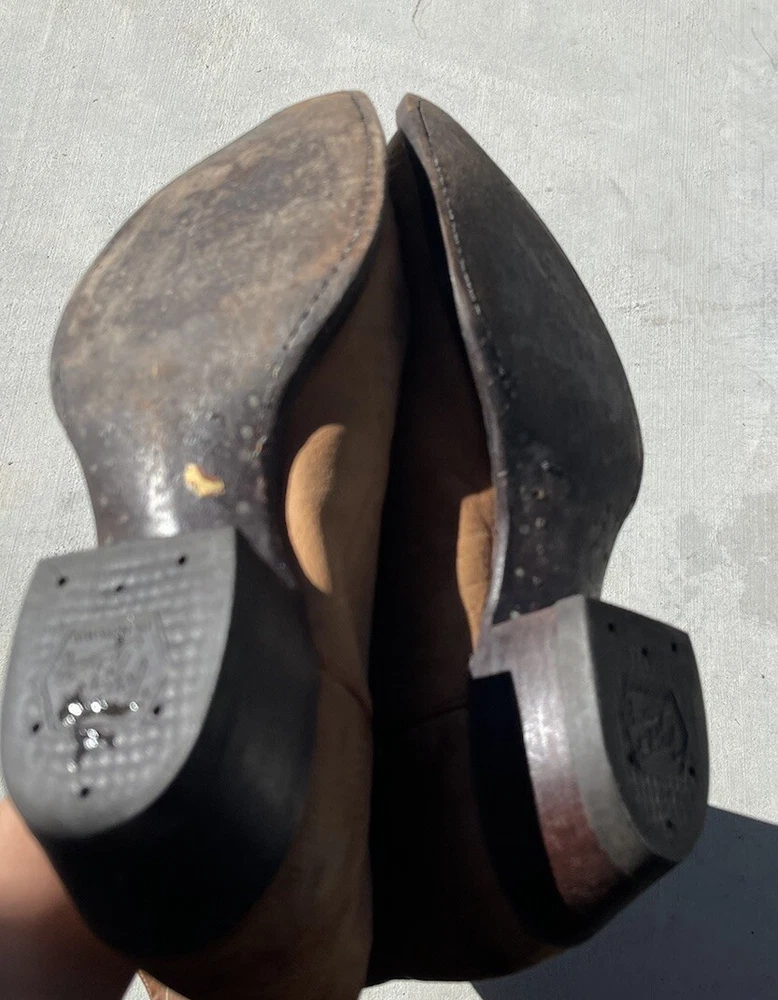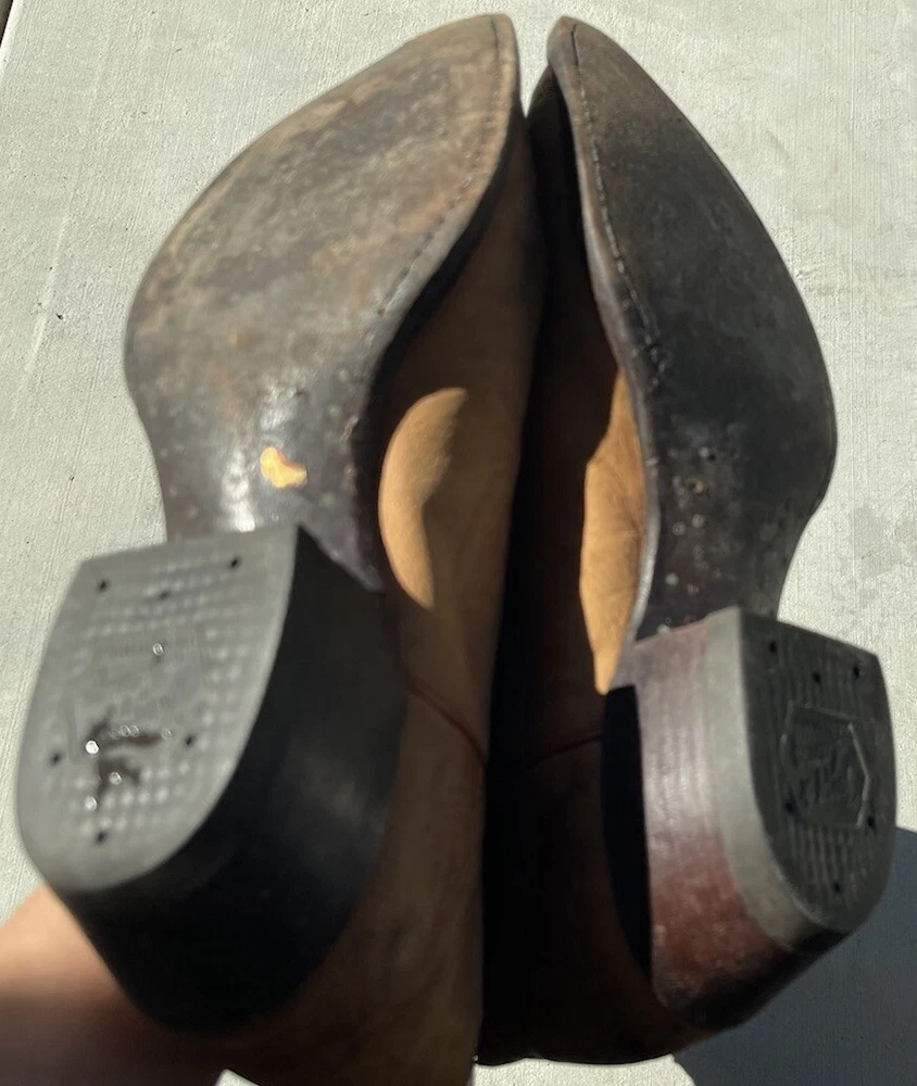 These vintage Tony Lama leather cowboy boots are a true gem for any western enthusiast. The dark brown and tan color combination, along with the men's size 9 fit, make them a perfect addition to any cowboy's wardrobe. The boots' outsole and upper material are both made of high-quality leather, ensuring both durability and style. The boots' brand, department, type, and model are all Tony Lama, men's, boots, and 1980s respectively. Their style is western, with a cowboy theme, and they were manufactured in the United States. These boots are perfect for anyone looking to add a touch of vintage style to their wardrobe.