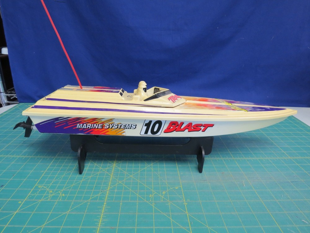 This item is offered for sale by a small local charity shop. All proceeds stay local to our community and help a variety of local needs including food shelves, fire and ambulance, and schools as well as families in need. Thank you for considering our offering. This is an untested remote control Marine Systems 10 boat with remote control, stand and battery packs. Untested. For parts.
