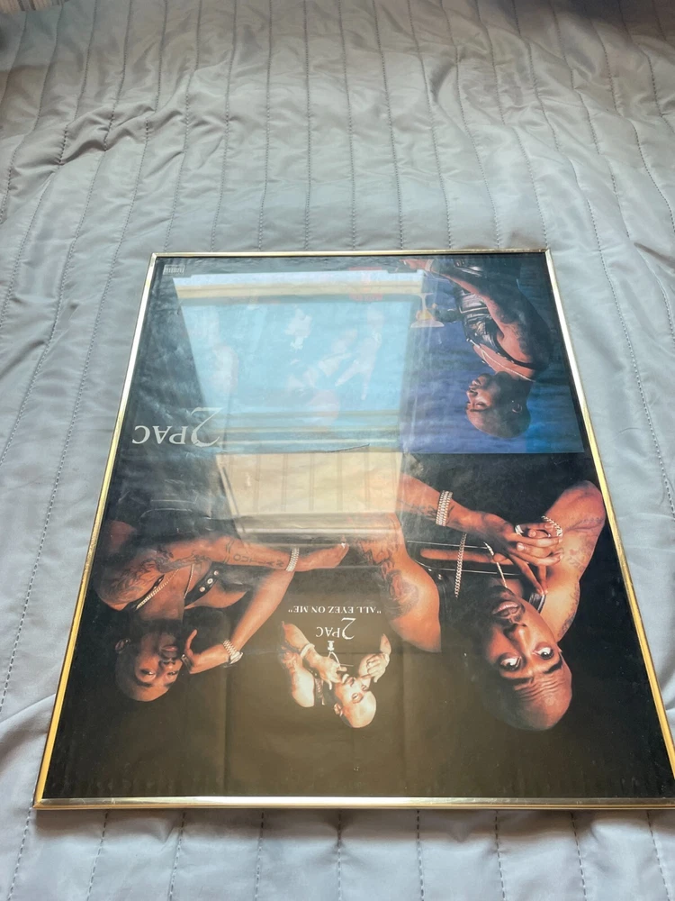 This vintage framed poster features Tupac's iconic album artwork from his "All Eyez On Me" release. The poster is a must-have for any fan of rap and hip hop music memorabilia. The industry is music and the genre is rap & hip hop, making it a perfect addition to any collection. The poster is in great shape and ready to be displayed in your home or office. It's a unique piece of entertainment memorabilia that will surely impress any visitors. Get your hands on this rare item before it's gone.